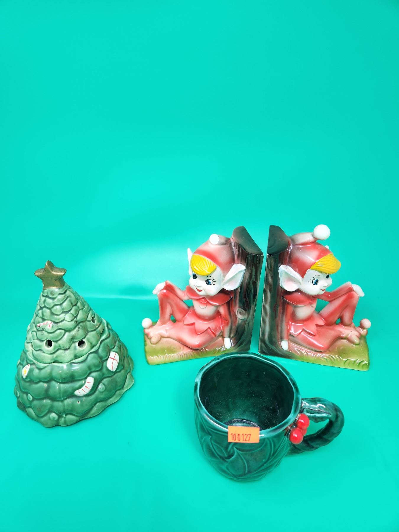VTG Elf Bookends, Ceramic Christmas & Mug