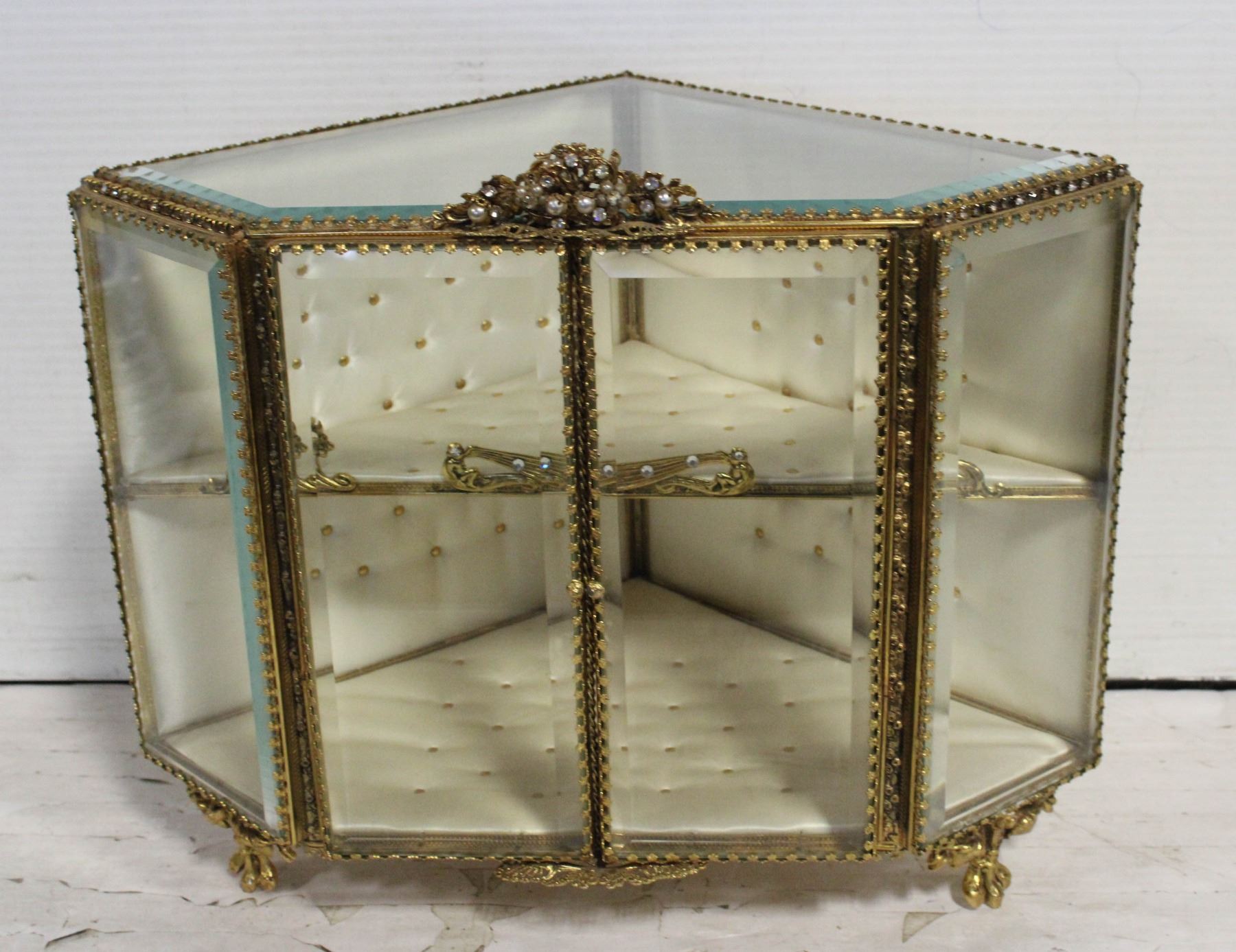 SHADOW BOX DISPLAY CURIO DISPLAY CABINET, GOLD GILDED WITH BRONZE, PEARLS & CRYSTALS, BEVELLED GLASS, PENTAGON/DIAMOND SHAPE, 10-1/2" H, 14" MAX AT LENGTH, 8-1/2" MAX AT WIDTH, NO CHIPS OR CRACKS, NO TEARS, RIPS OR STAINS ON INSIDE MATERIAL