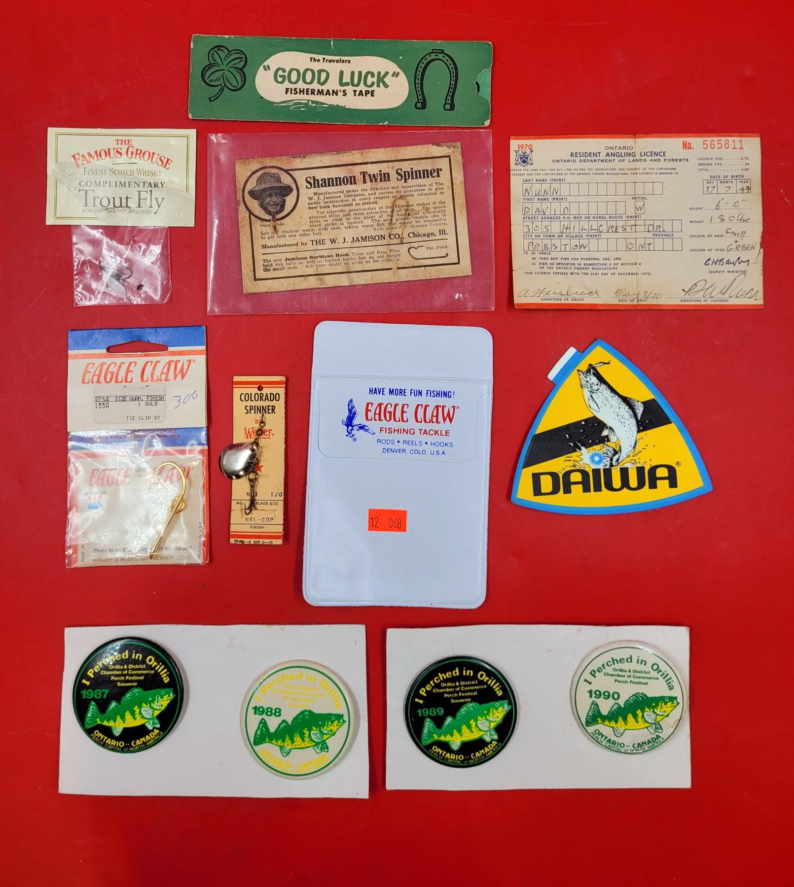 VTG Fishing Lot w/ Pins, Angling License, Spinners, Good Luck Fisherman's Tape, & More