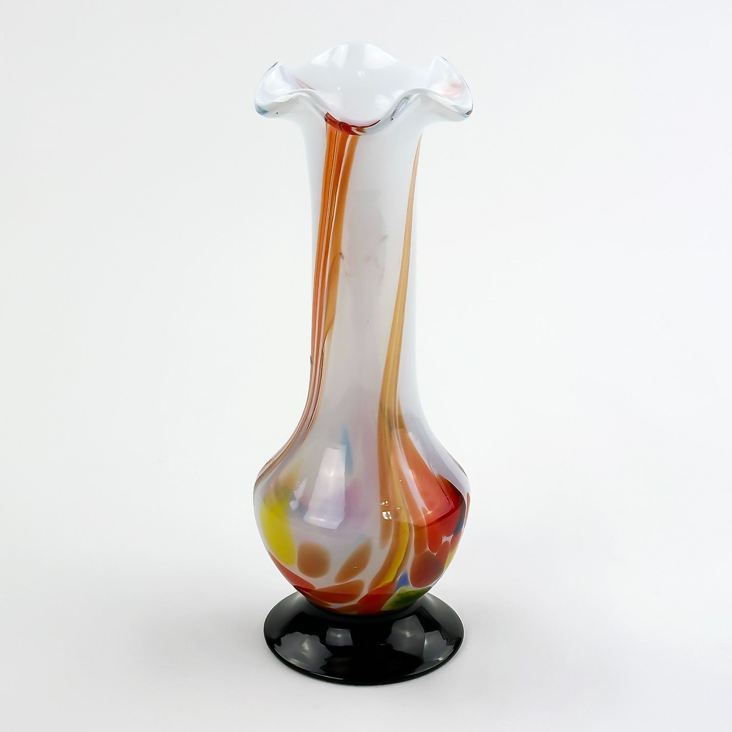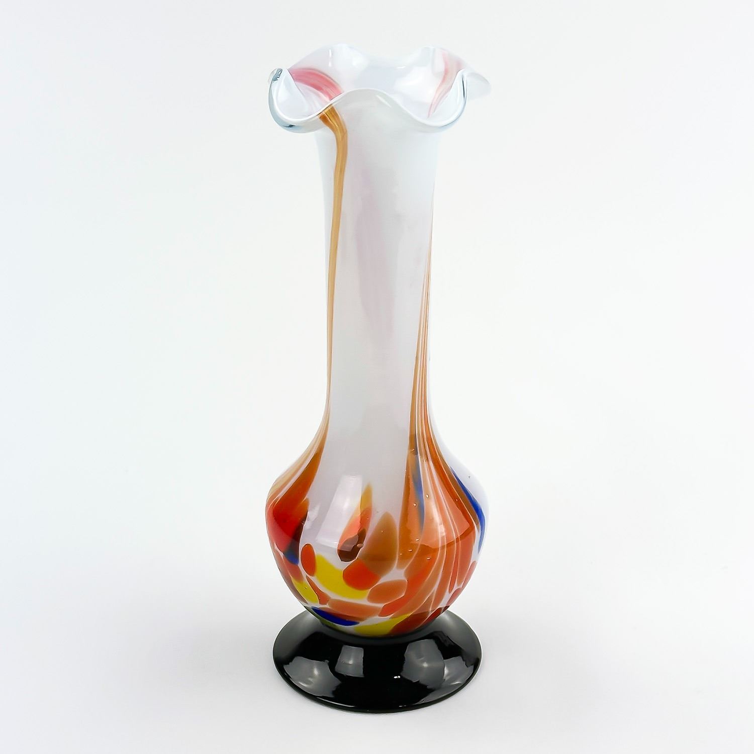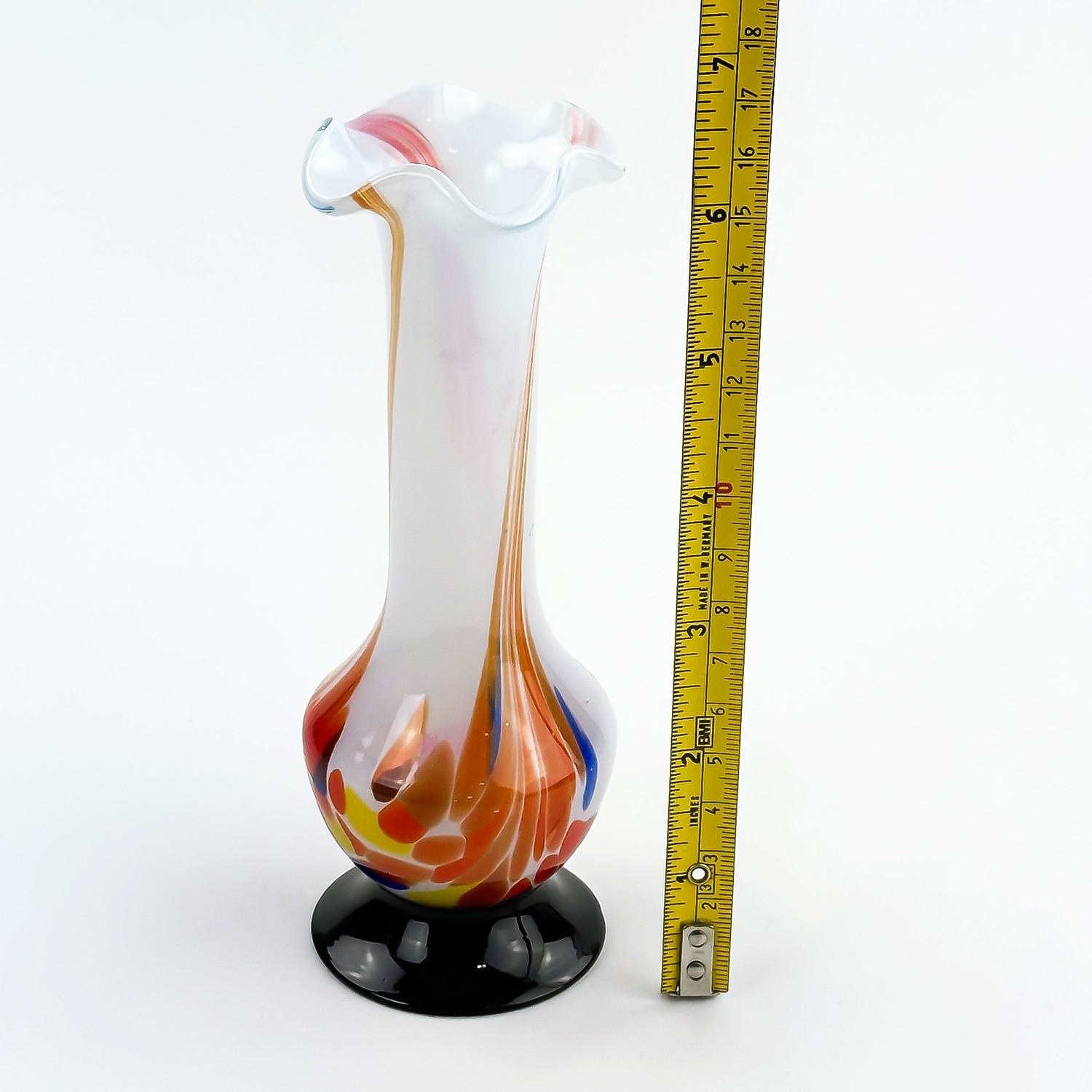 #8175 - VINTAGE HAND BLOWN STUDIO ART GLASS FLOWER BUD VASE - MULTICOLOR CONFETTI STYLE DESIGN SCULPTURE WITH RUFFLED TOP EDGE. MEASURES: 6.5” (16.5 CM) TALL BY 2.375” (6 CM) WIDEST DIAMETER