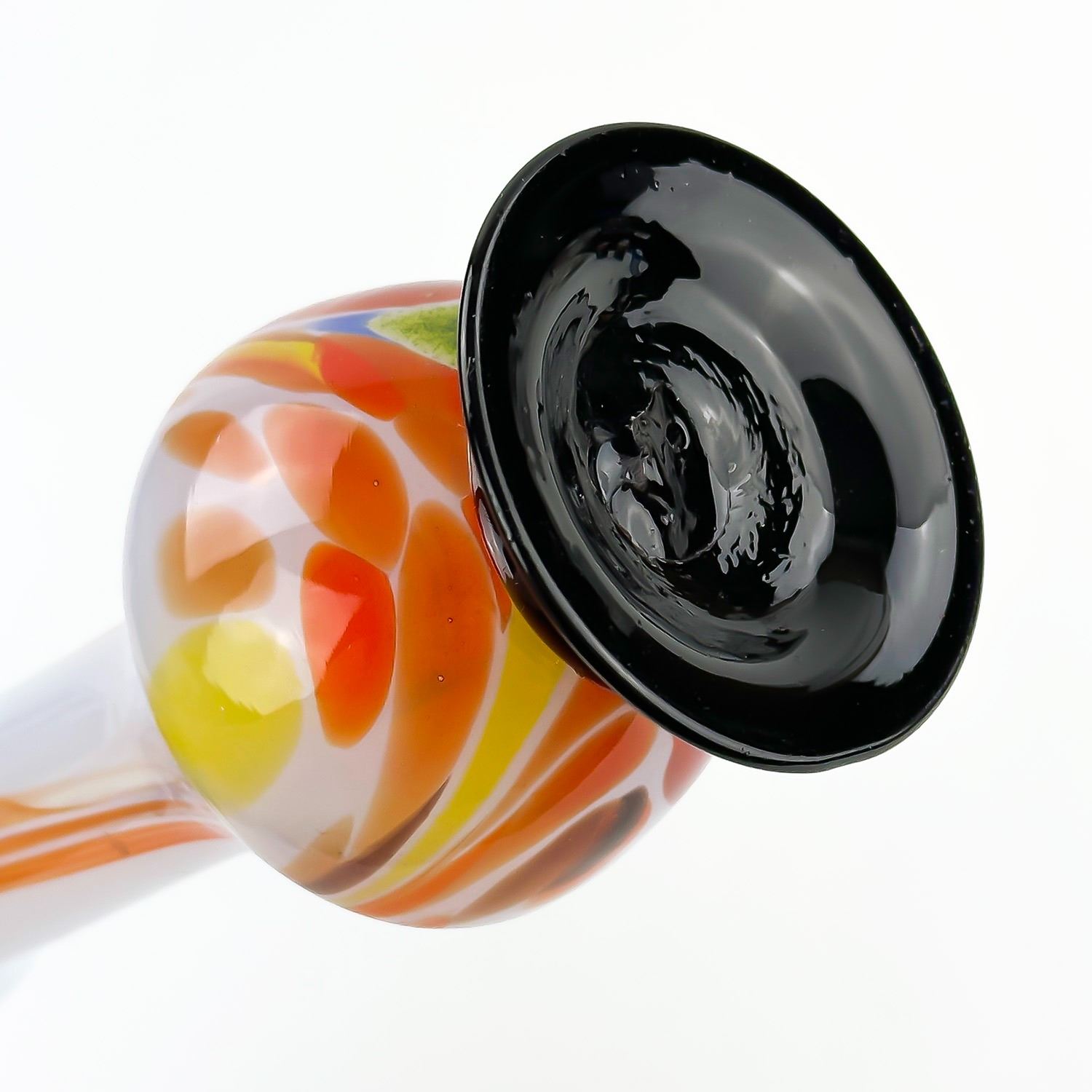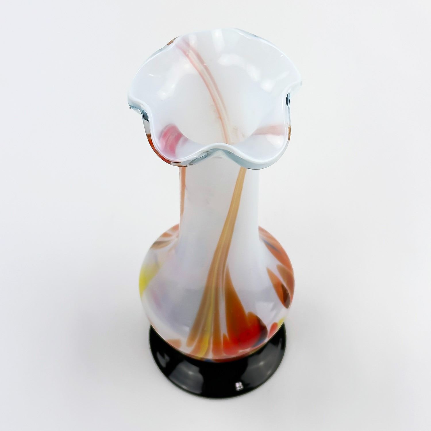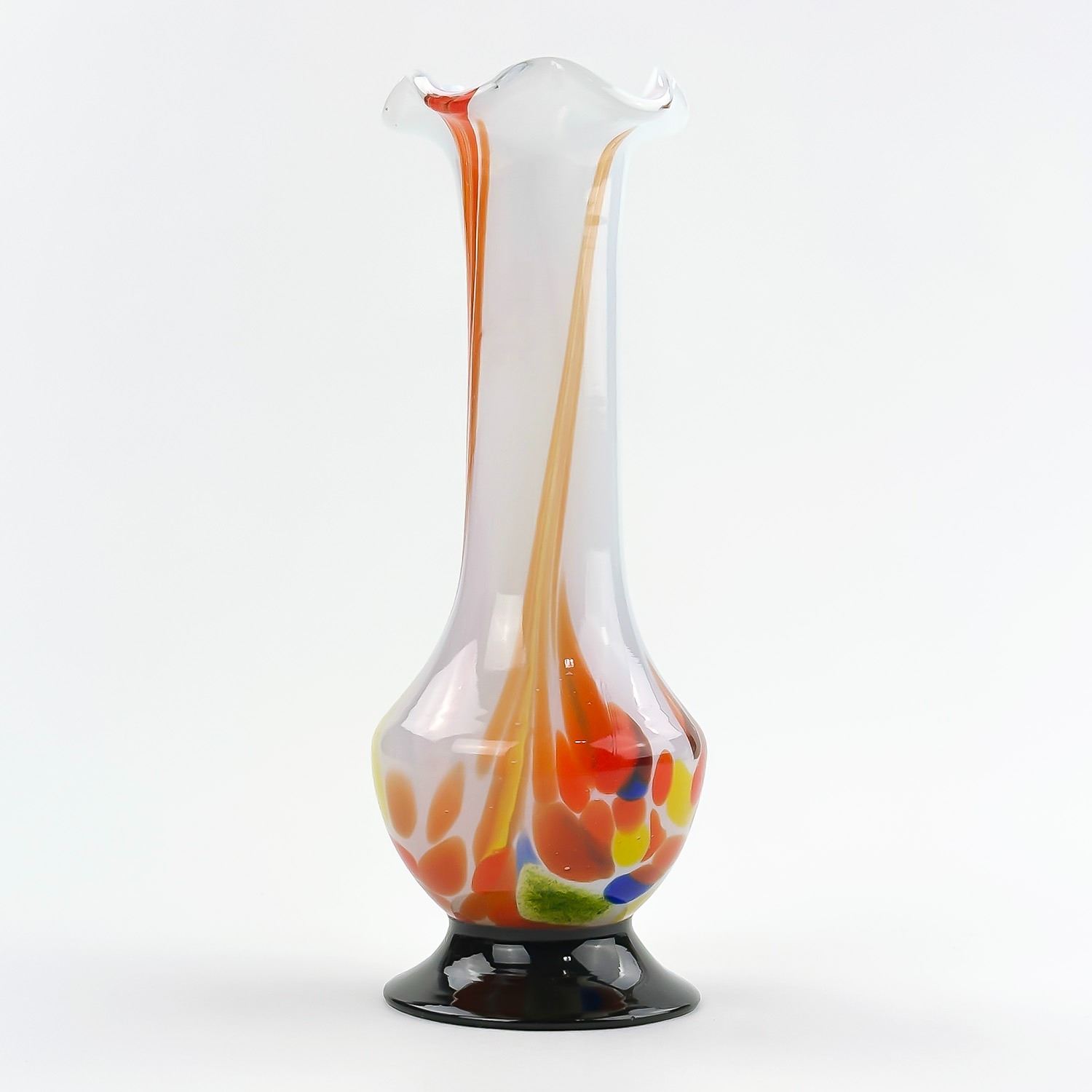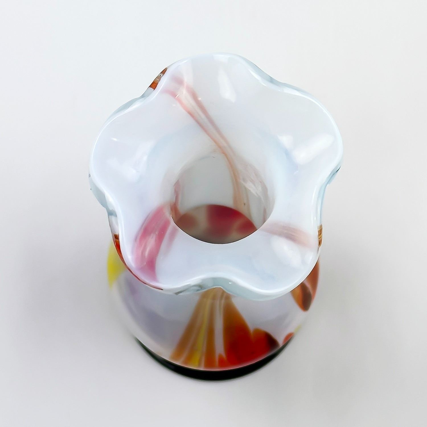 #8175 - VINTAGE HAND BLOWN STUDIO ART GLASS FLOWER BUD VASE - MULTICOLOR CONFETTI STYLE DESIGN SCULPTURE WITH RUFFLED TOP EDGE. MEASURES: 6.5” (16.5 CM) TALL BY 2.375” (6 CM) WIDEST DIAMETER