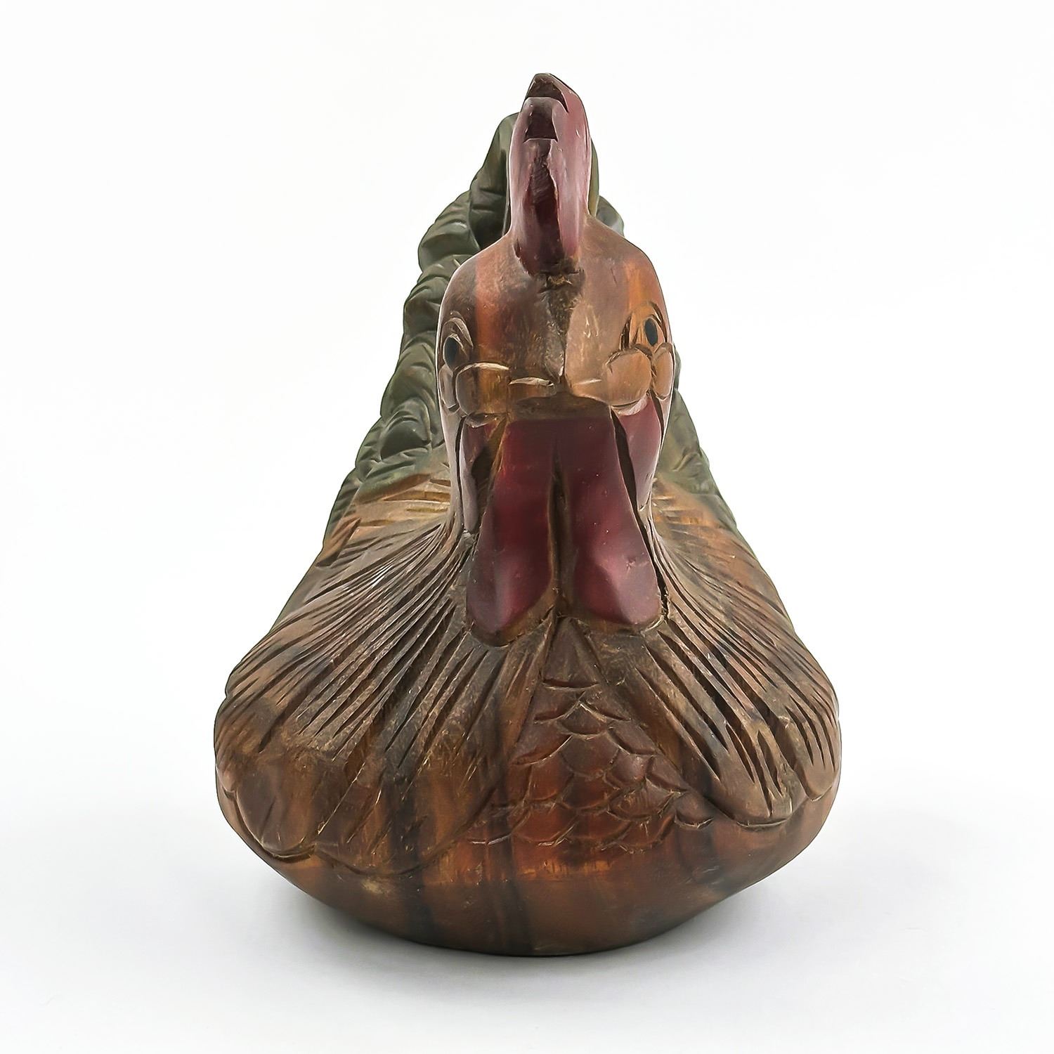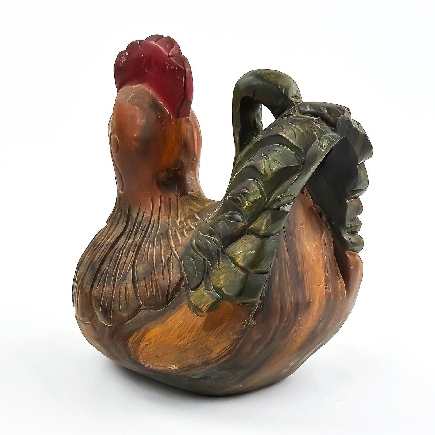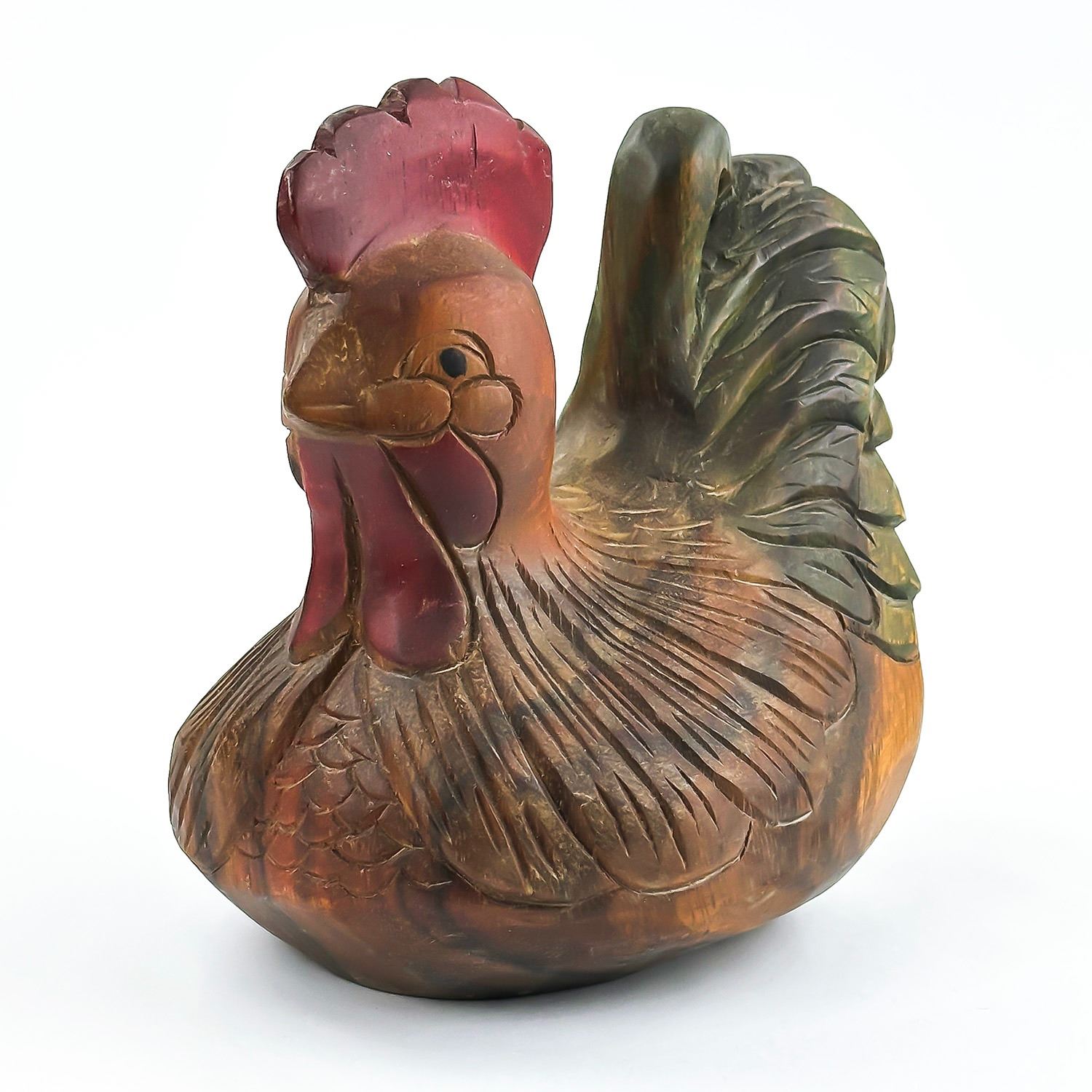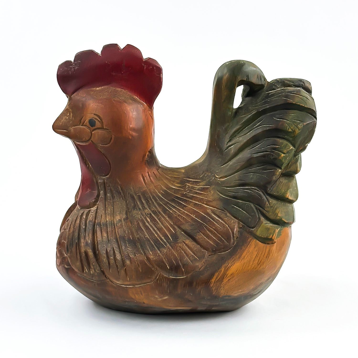 #8032 - VINTAGE CHICKEN HEN ROOSTER WOOD CARVING. HAND CARVED & PAINTED WOODEN FOLK ART CHICKEN FIGURINE STATUE. HOME OR OFFICE DECOR - WEIGHS 1293 GRAMS (2.85 POUNDS). MEASURES: 8” (20 CM) LONG BY 6”(15 CM) WIDE AND SITS 8” (20 CM) TALL