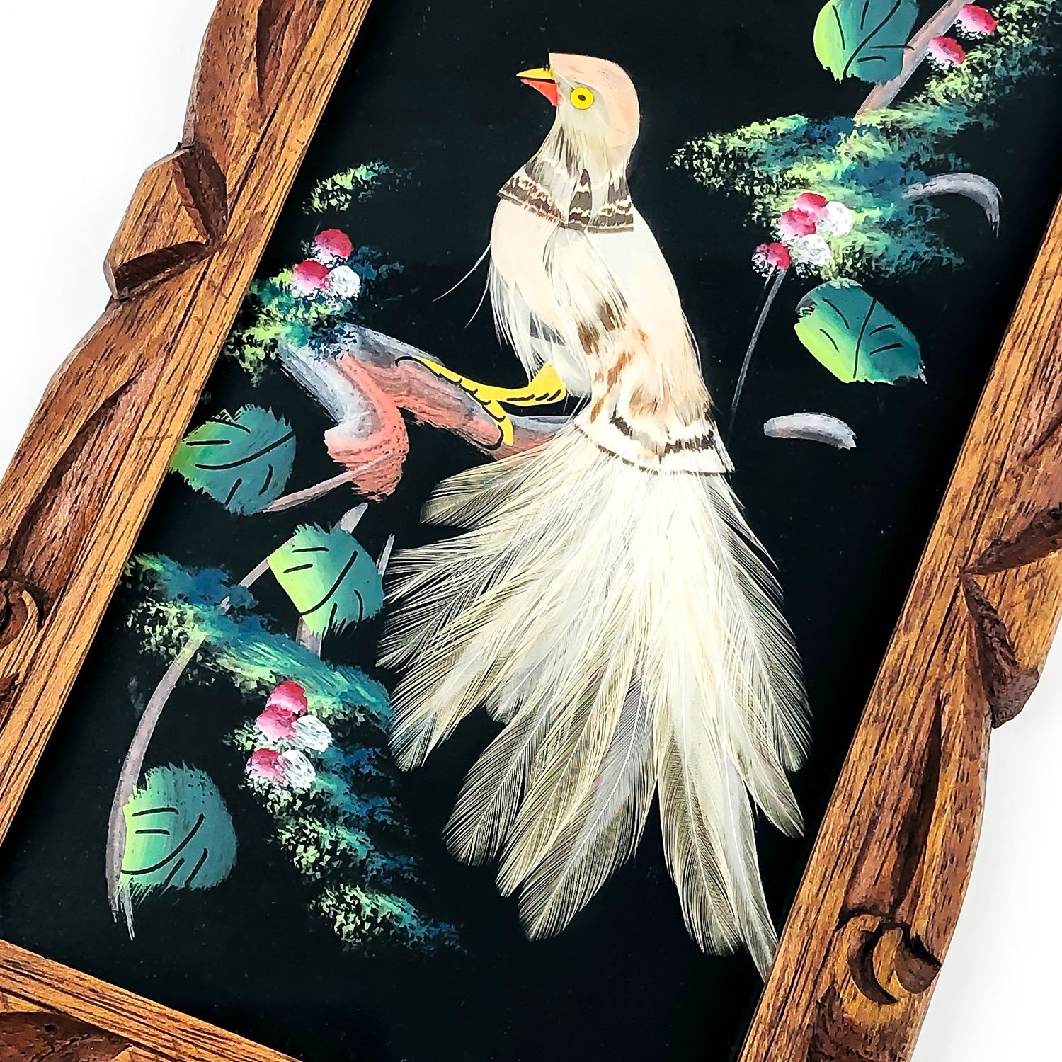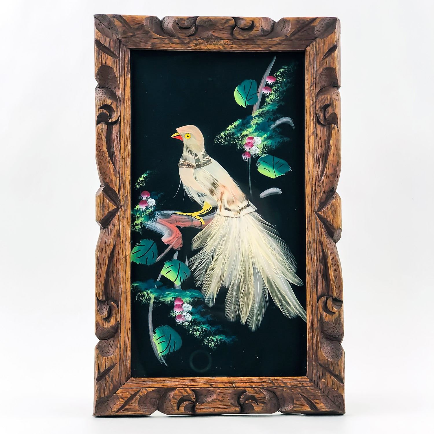 #9210 - UNSIGNED FEATHER BIRD ART - CARVED WOODEN FRAME WITH GLASS. MADE IN MEXICO. FRAME MEASURES: 10.5” (27 CM) HIGH BY 6.5” (16.5 CM) WIDE***ITEM(S) LOCATED IN LETHBRIDGE ALBERTA. ALL ITEMS IN THIS AUCTION QUALIFY FOR OUR FREE TRANSPORT TO EDMONTON SERVICE. WORLDWIDE SHIPPING AVAILABLE