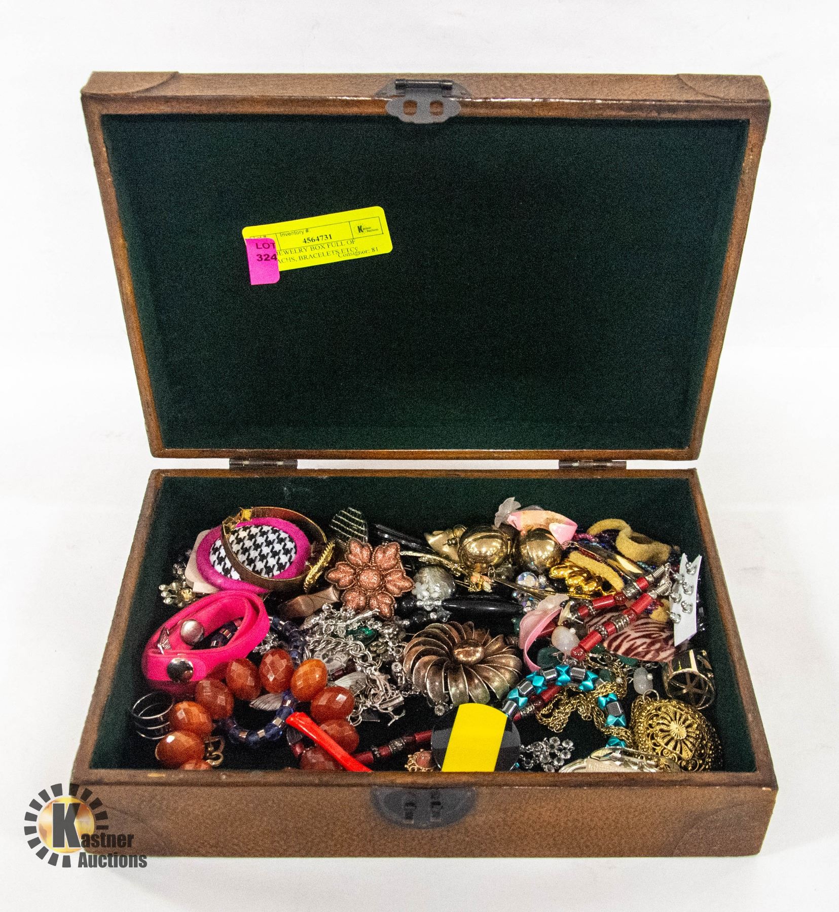 VTG JEWELRY BOX FULL OF BROACHS, BRACELETS ETC