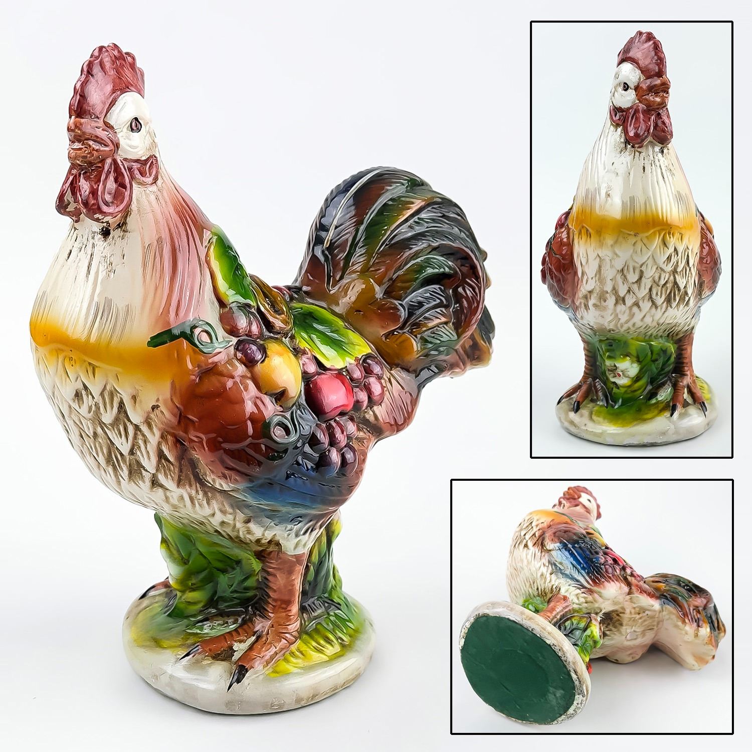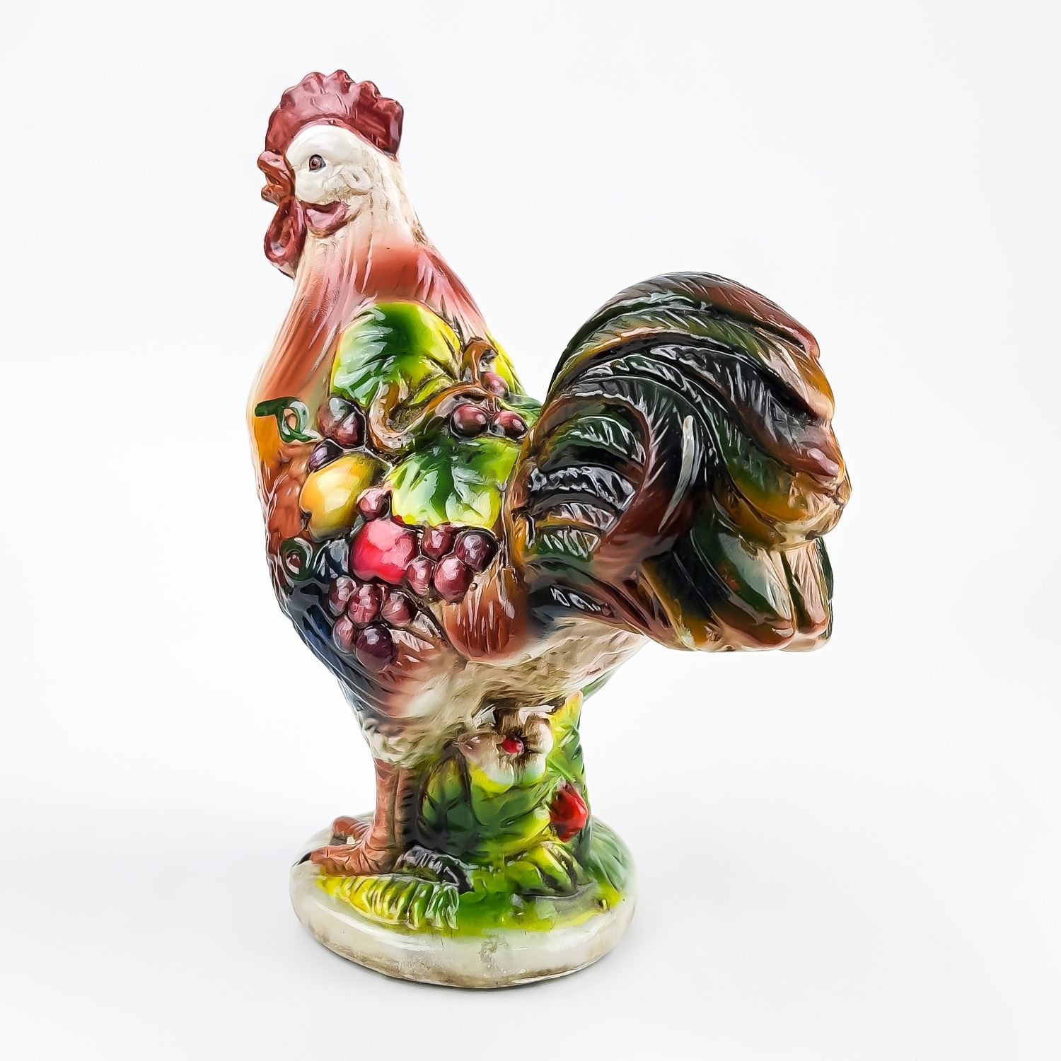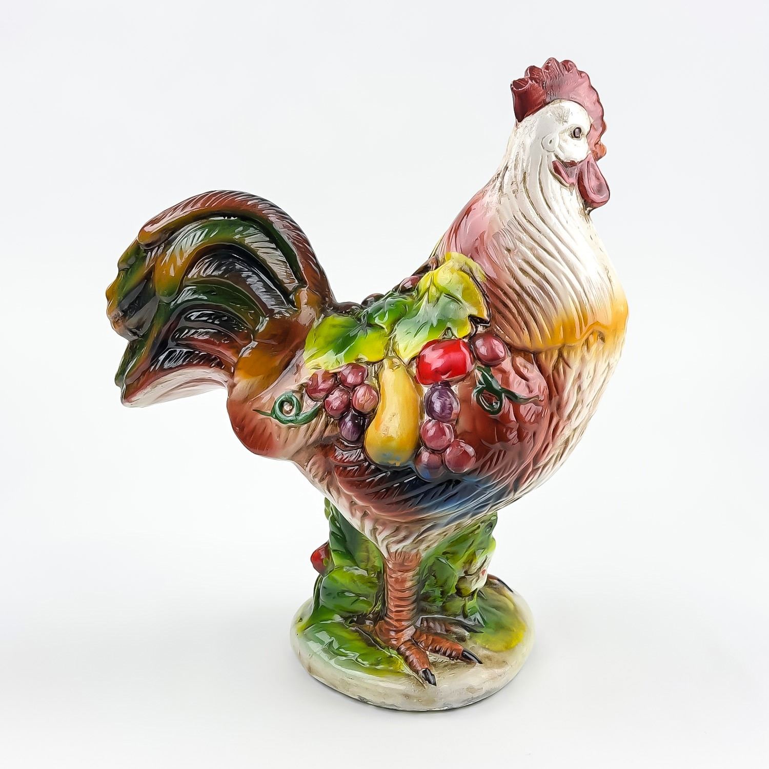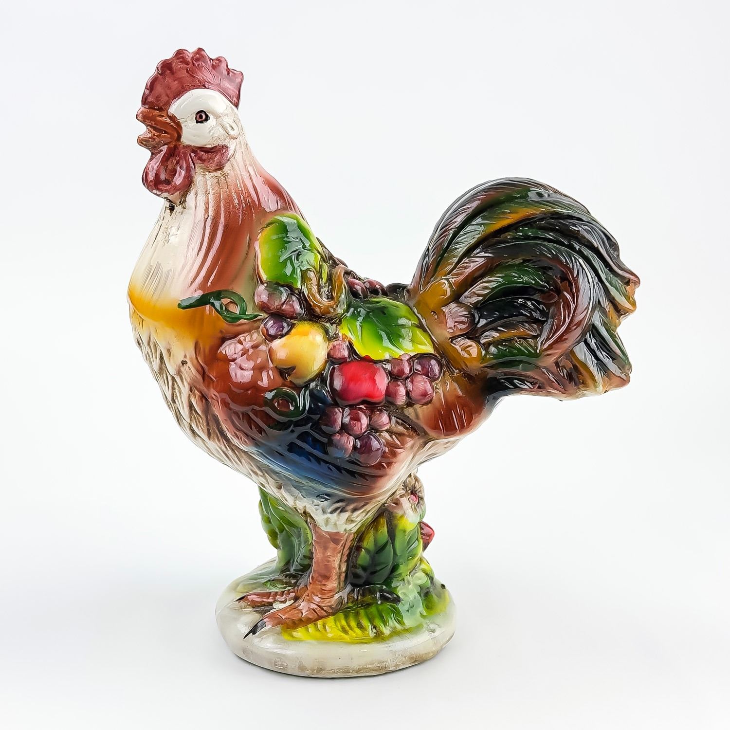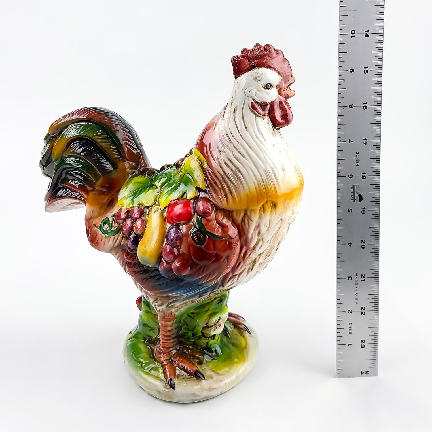 #8325 - VINTAGE MID-CENTURY MODERN MCM (OR EARLIER) HAND CRAFTED CHALKWARE PLASTER ROOSTER SCULPTURE. THIS FOLK ART ROOSTER HAS VIBRANT COLOURS AND IS DRAPED IN LEAVES AND FRUIT, WHICH GENERALLY SYMBOLIZES ABUNDANCE, PROSPERITY, AND GOOD LUCK - PARTICULARLY WITHIN THE CONTEXT OF 1950’S TO 1960’S KITCHEN OR FARMHOUSE DECOR. COLLECTIBLE FARM & COUNTRY HOME DECOR ROOSTER ANIMAL FIGURINE. NO CRACKS, CHIPS OR REPAIRS. MEASURES 9.75” (24.75 CM) TALL BY 8.25” (21 CM) WIDE HEAD TO TAIL AND 4.5” (11.5 CM) DEEP.