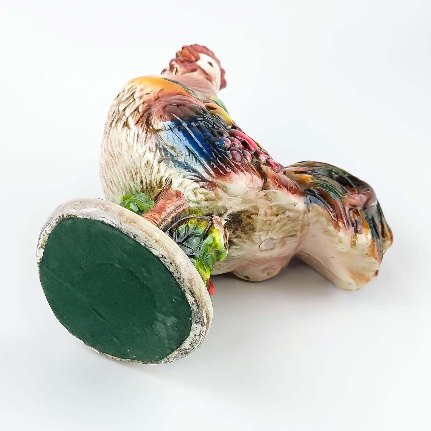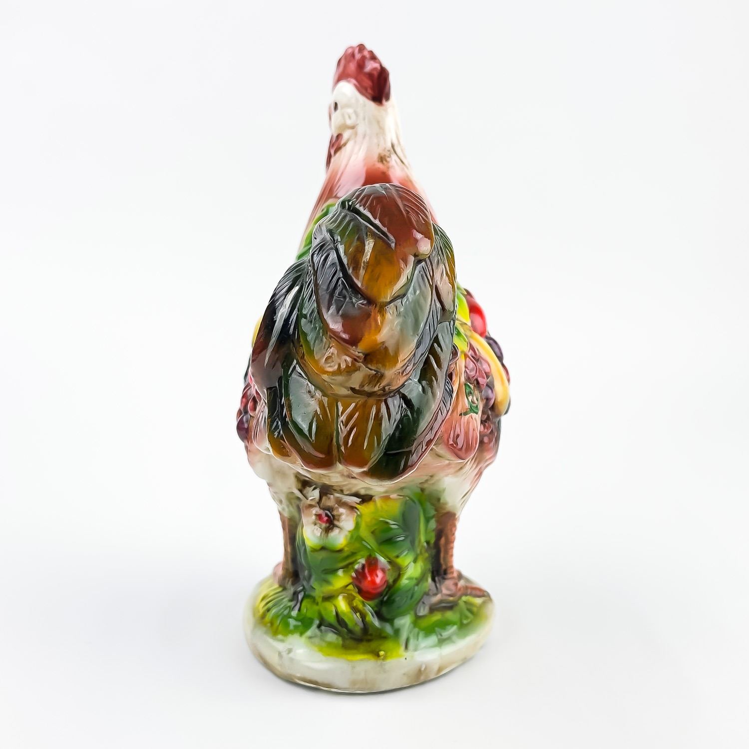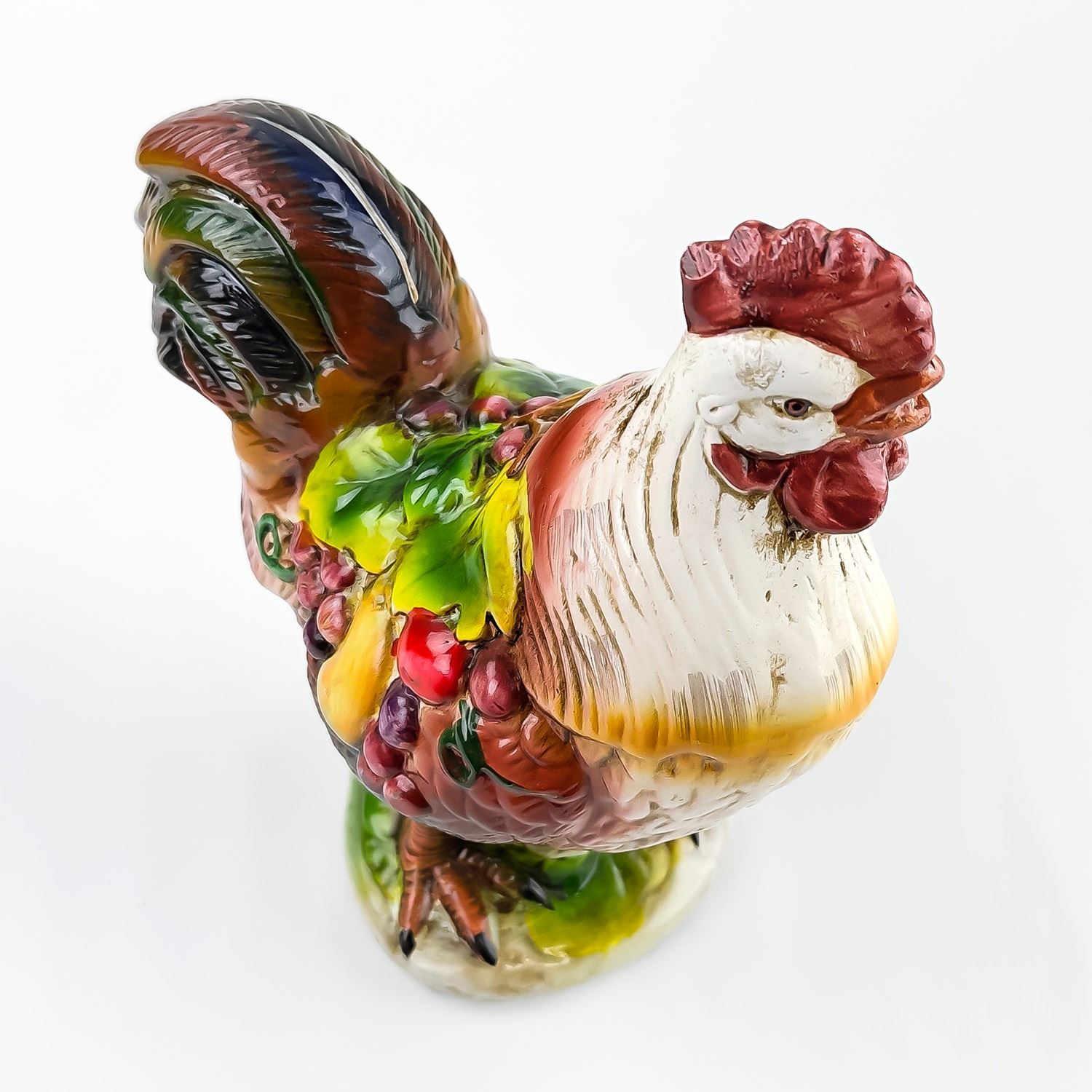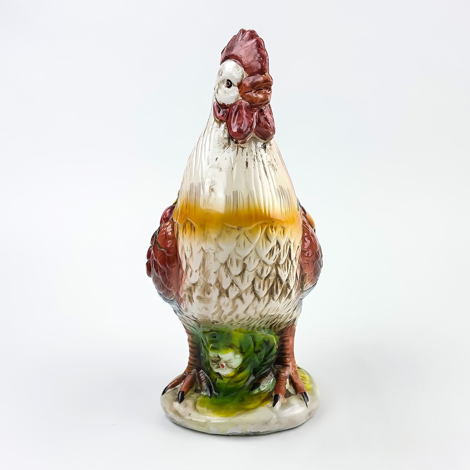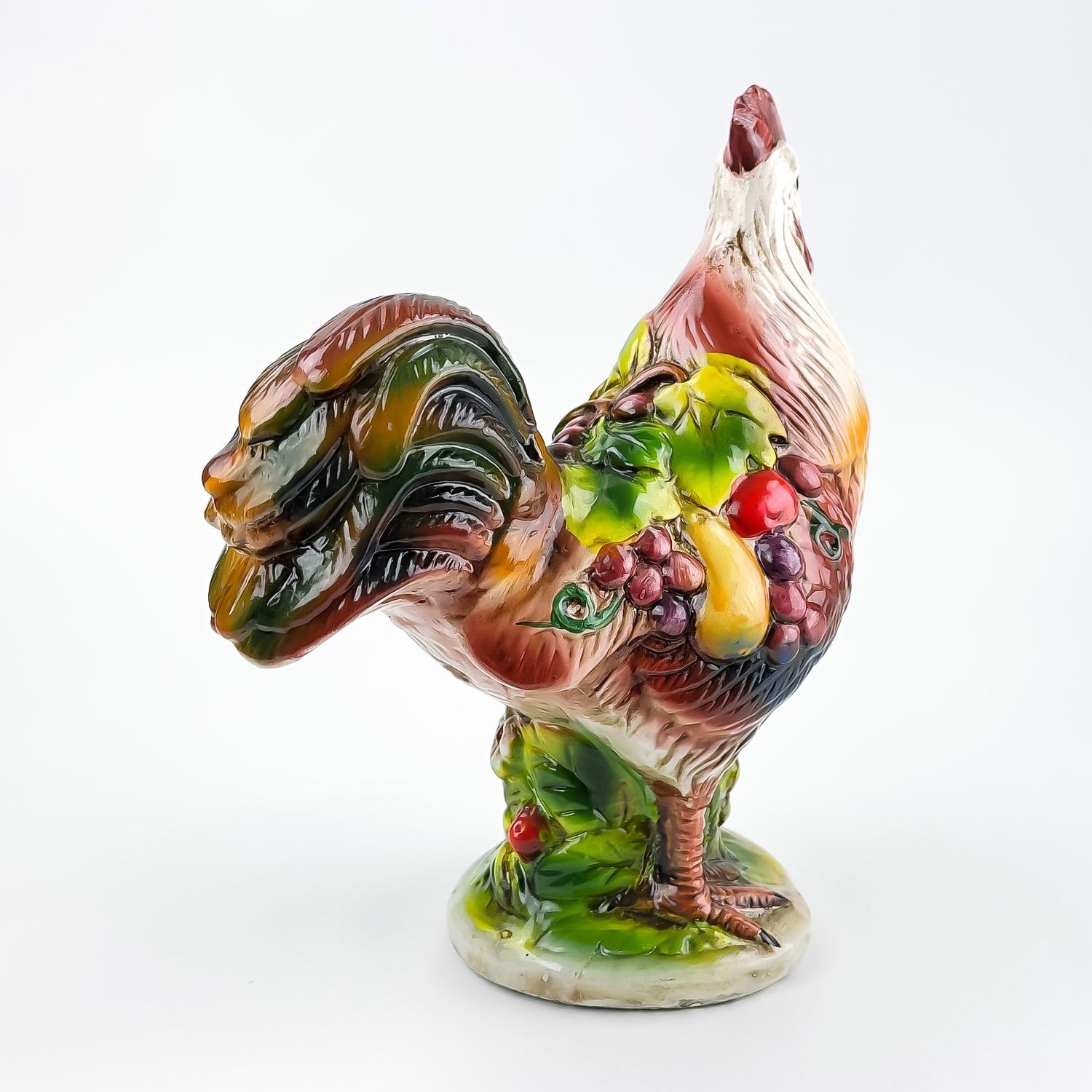 #8325 - VINTAGE MID-CENTURY MODERN MCM (OR EARLIER) HAND CRAFTED CHALKWARE PLASTER ROOSTER SCULPTURE. THIS FOLK ART ROOSTER HAS VIBRANT COLOURS AND IS DRAPED IN LEAVES AND FRUIT, WHICH GENERALLY SYMBOLIZES ABUNDANCE, PROSPERITY, AND GOOD LUCK - PARTICULARLY WITHIN THE CONTEXT OF 1950’S TO 1960’S KITCHEN OR FARMHOUSE DECOR. COLLECTIBLE FARM & COUNTRY HOME DECOR ROOSTER ANIMAL FIGURINE. NO CRACKS, CHIPS OR REPAIRS. MEASURES 9.75” (24.75 CM) TALL BY 8.25” (21 CM) WIDE HEAD TO TAIL AND 4.5” (11.5 CM) DEEP.