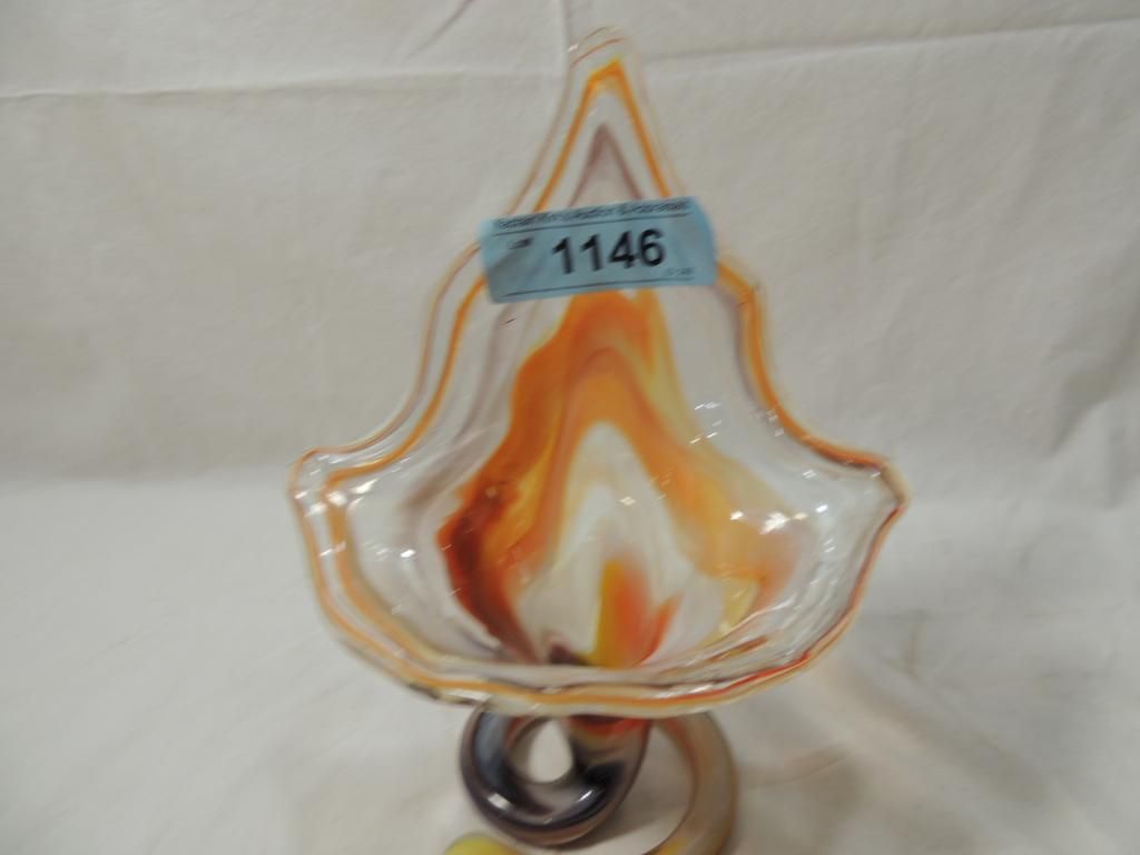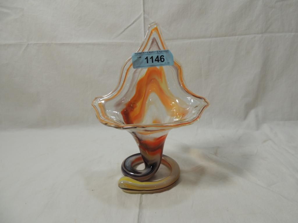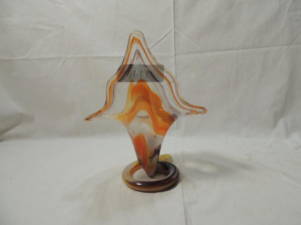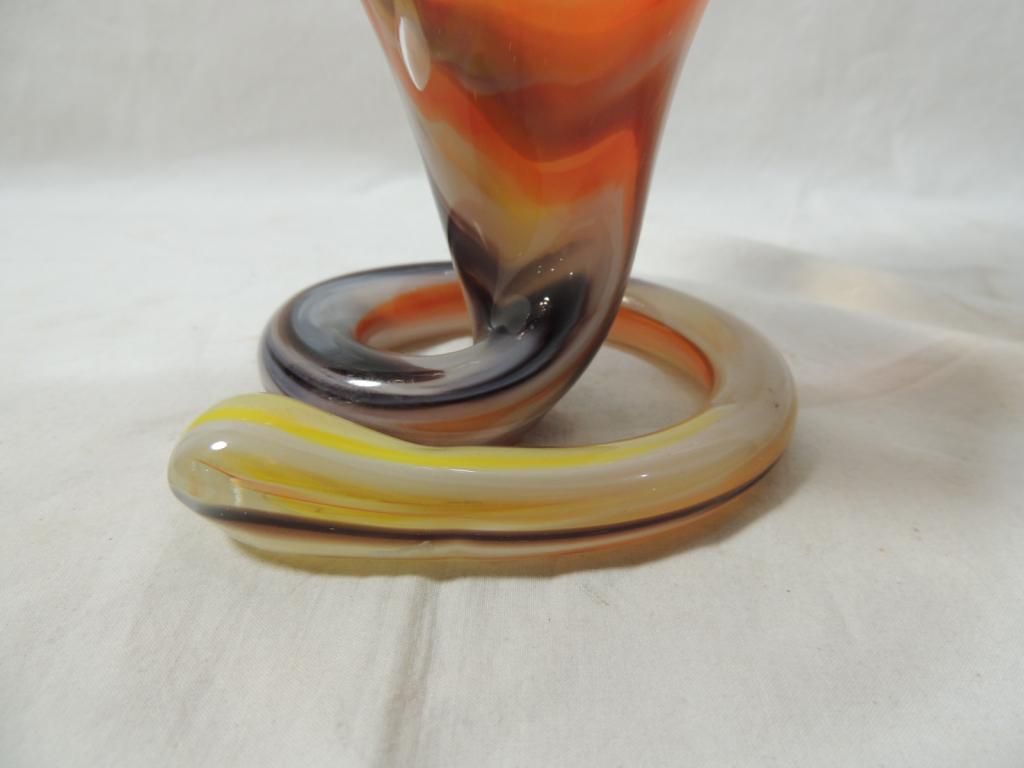 VTG MURANO AMBER BLOWN GLASS ART SCULPTURE VASE BOW SCALLOPED EDGE ITALIAN BLOWN GLASS VASE IS MARBLEIZED COLORS. AS SHOWN. SEE PHOTO FOR MORE DETAILS.