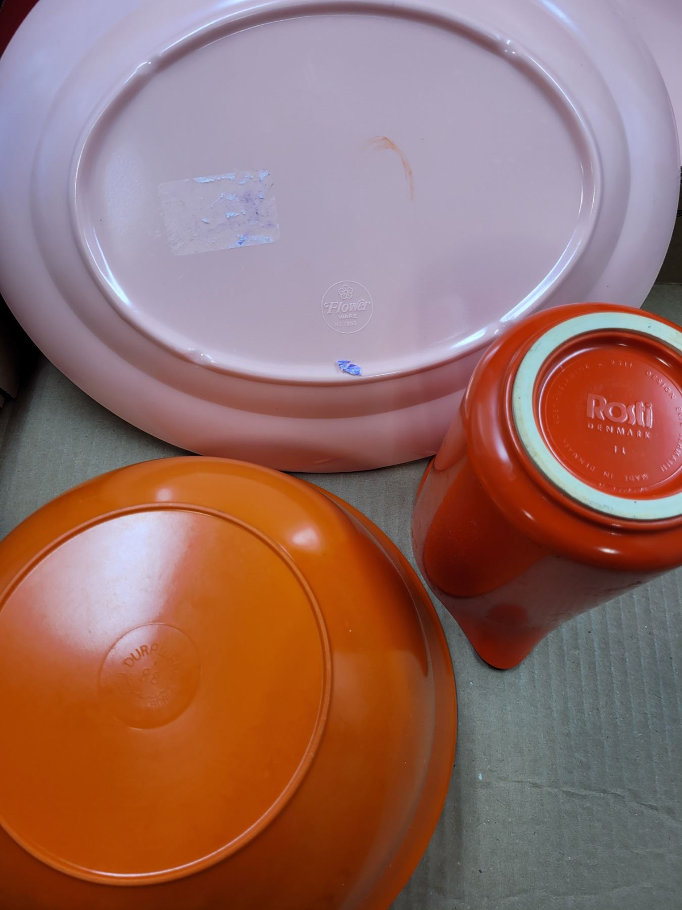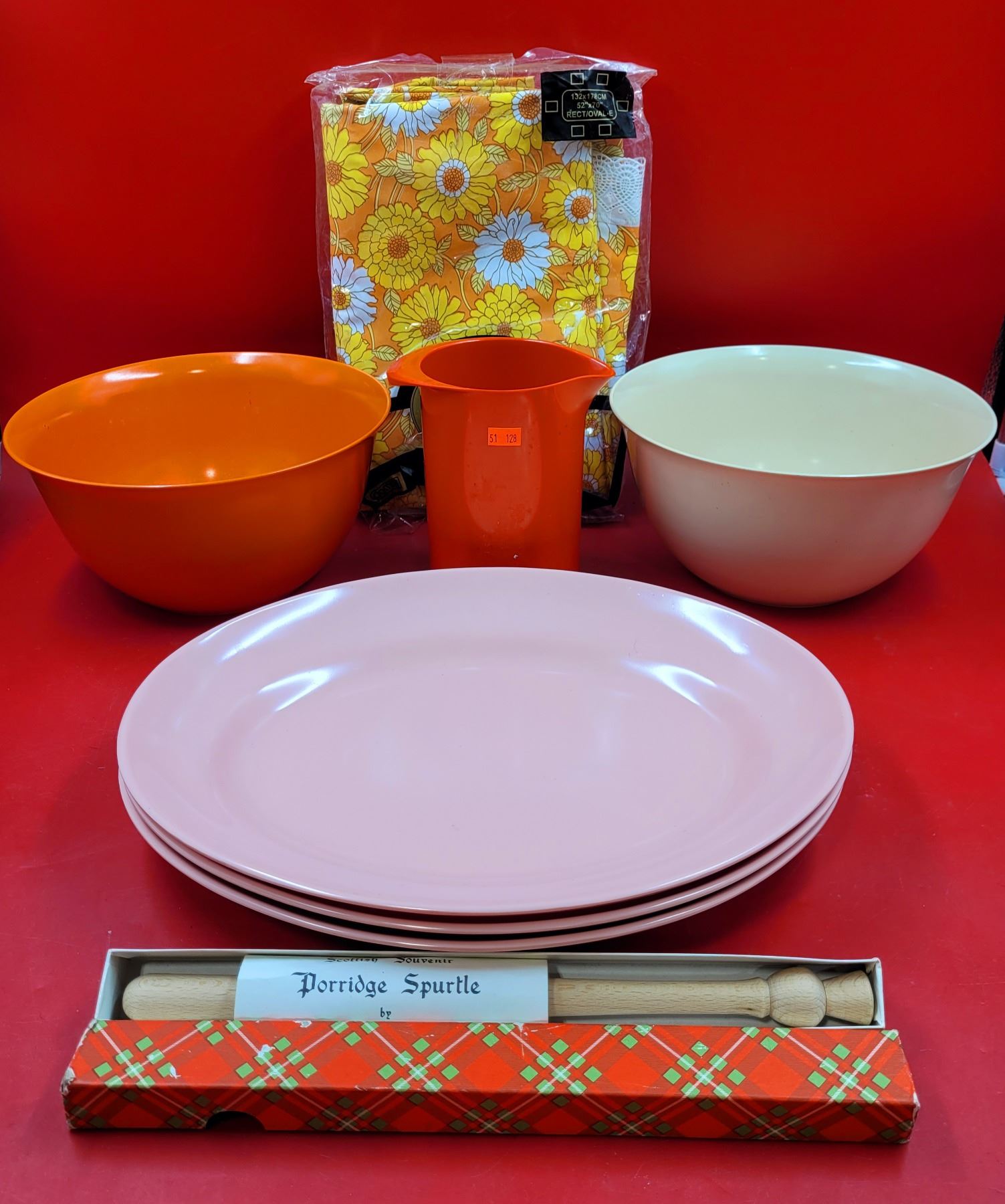 VTG Melamine Dishes (Duraware, Flower Ware, etc.), Porridge Spurtle, & Tablecloth