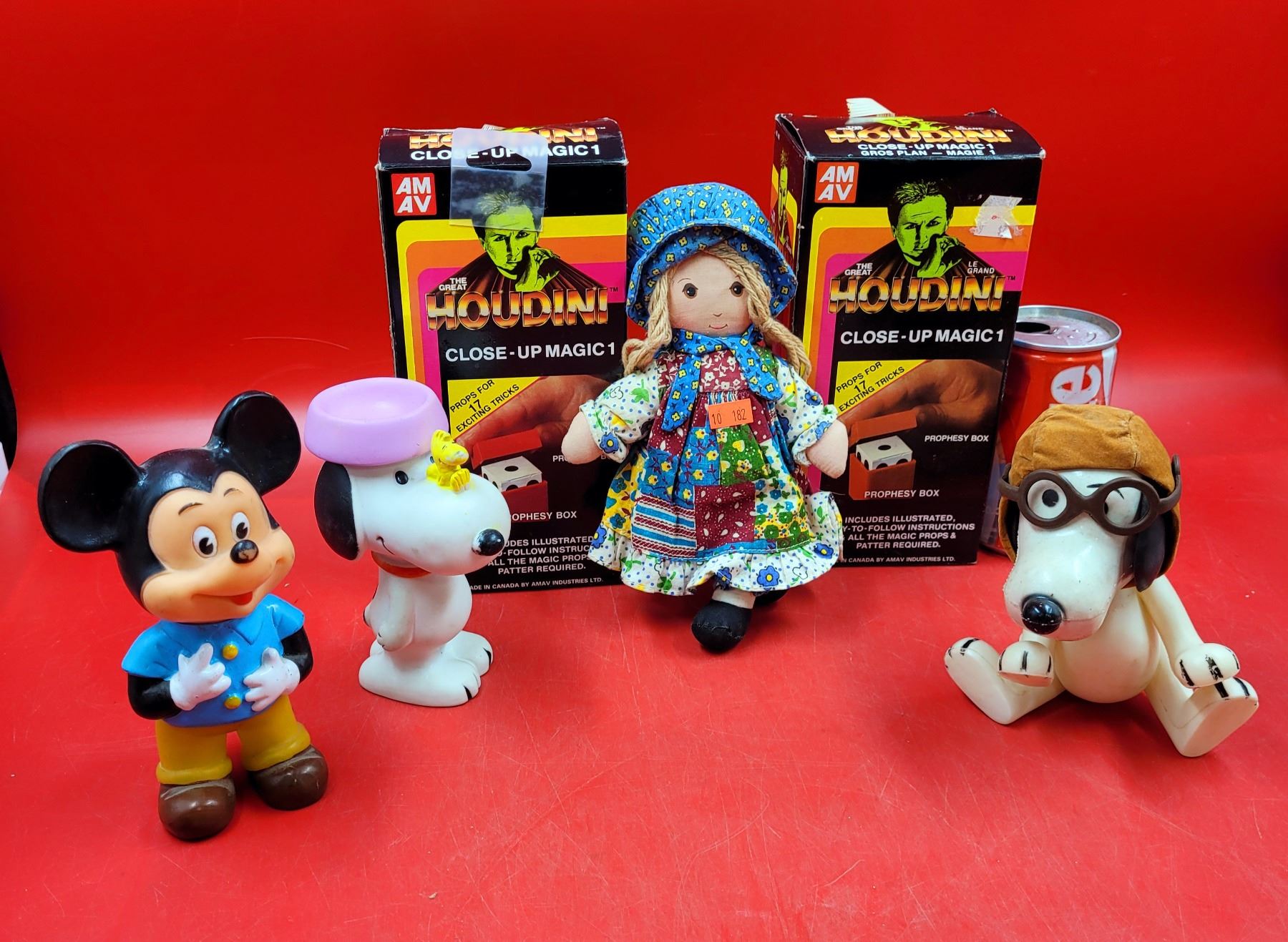 VTG Mickey Mouse & Snoopy Figurines, Doll & 2 AM-AV The Great Houdini Magic Kits