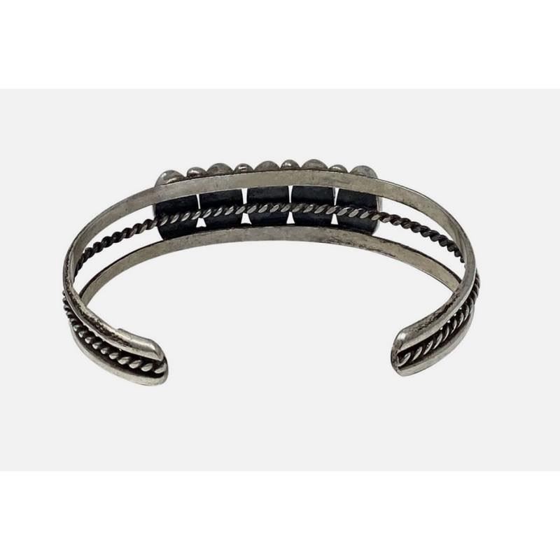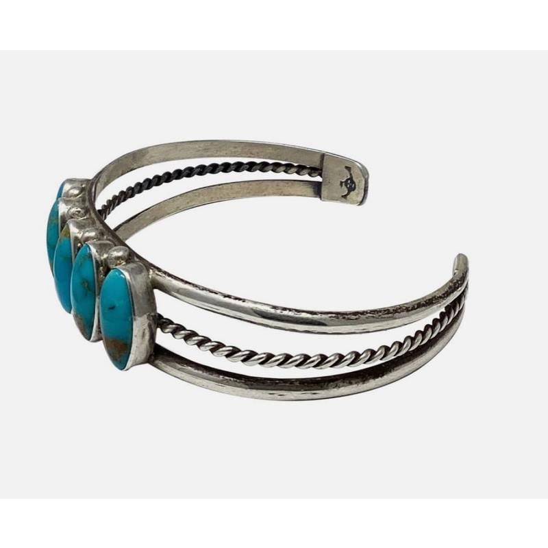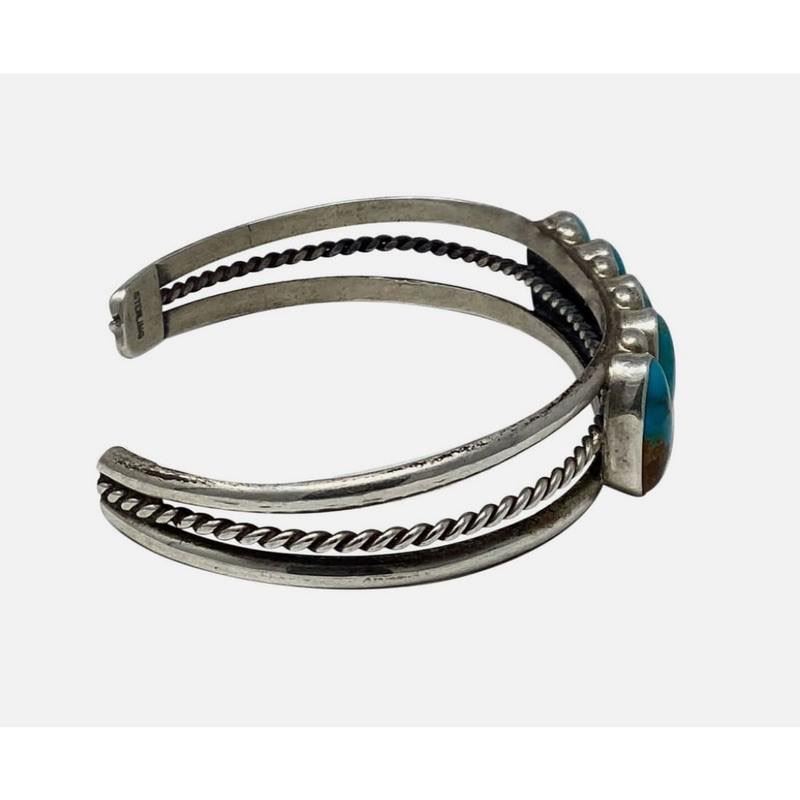 For your consideration is this wonderful example of vintage, collectible Native American Art. This gorgeous vintage bracelet features a traditional design in sterling silver, accented with gorgeous, Royston turquoise cabochons. Hallmarked, recently polished. The inside circumference is about 7" including gap and can be carefully adjusted. Stunning vintage bracelet to add to any jewelry collection!