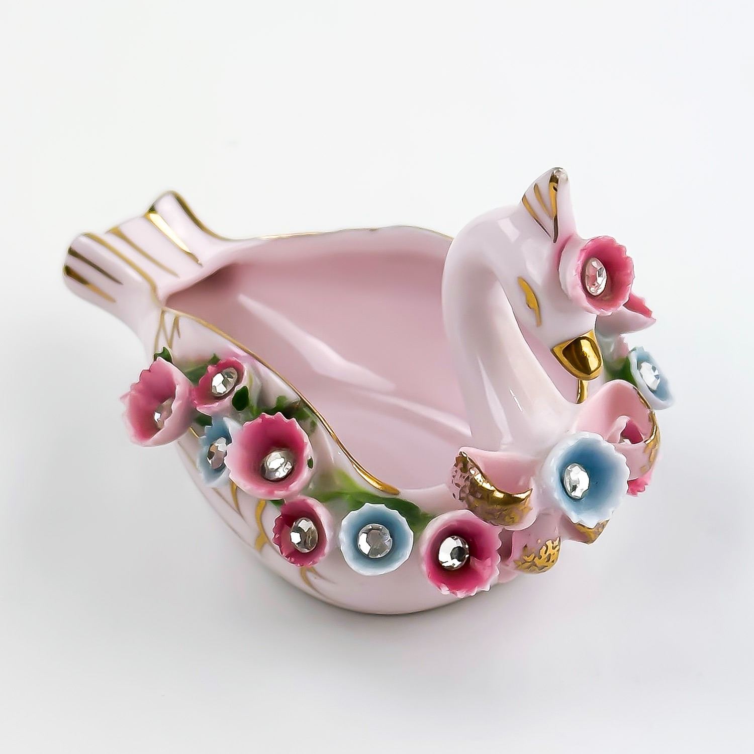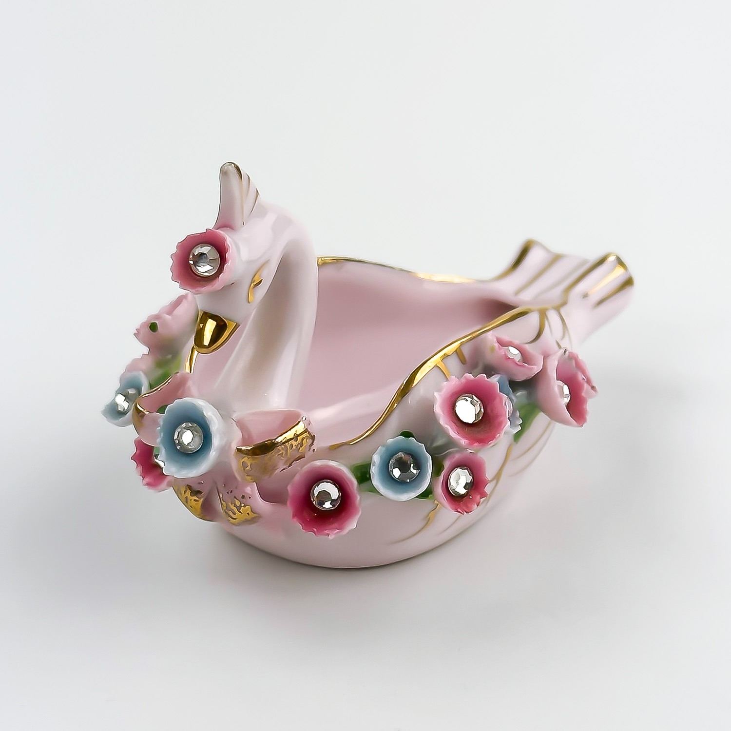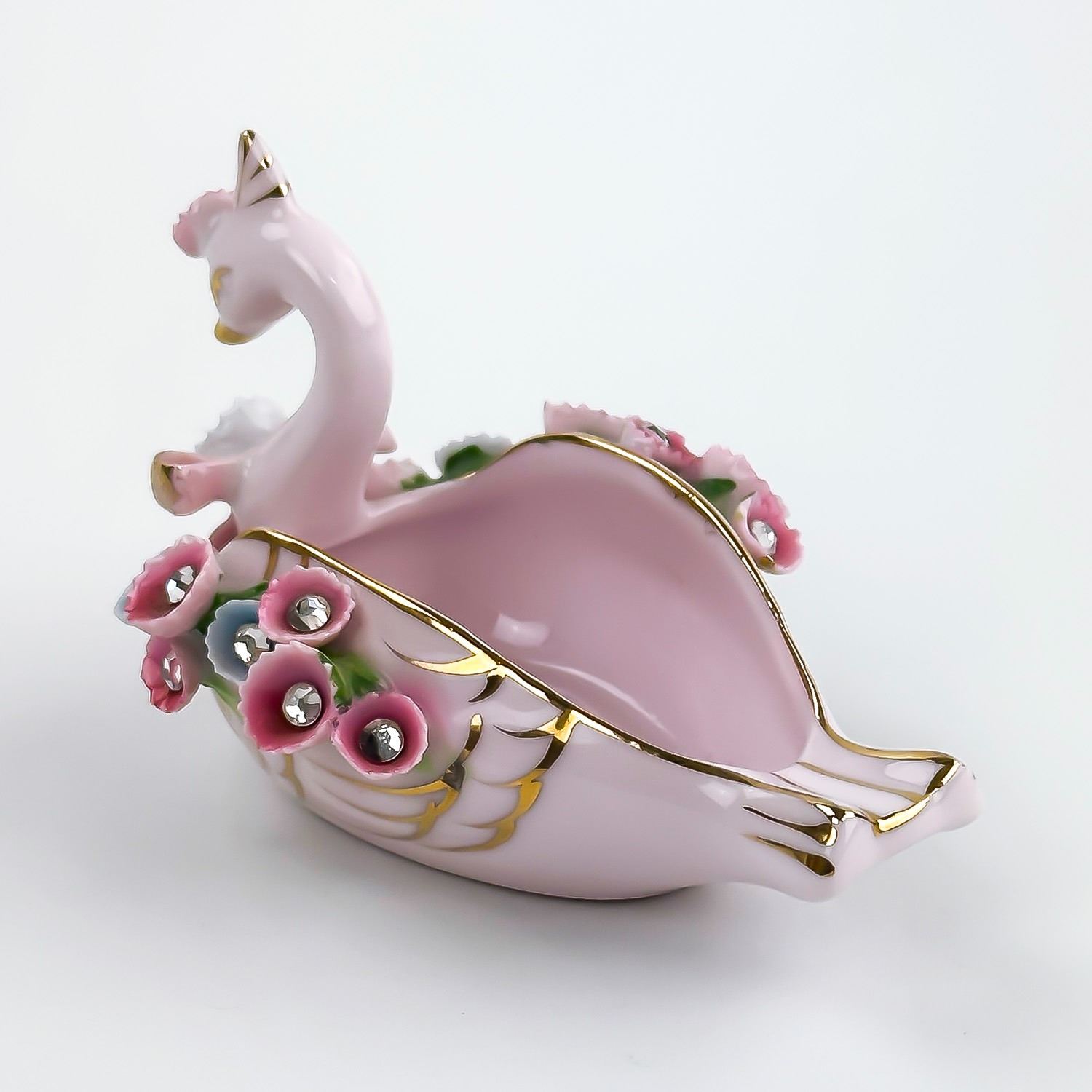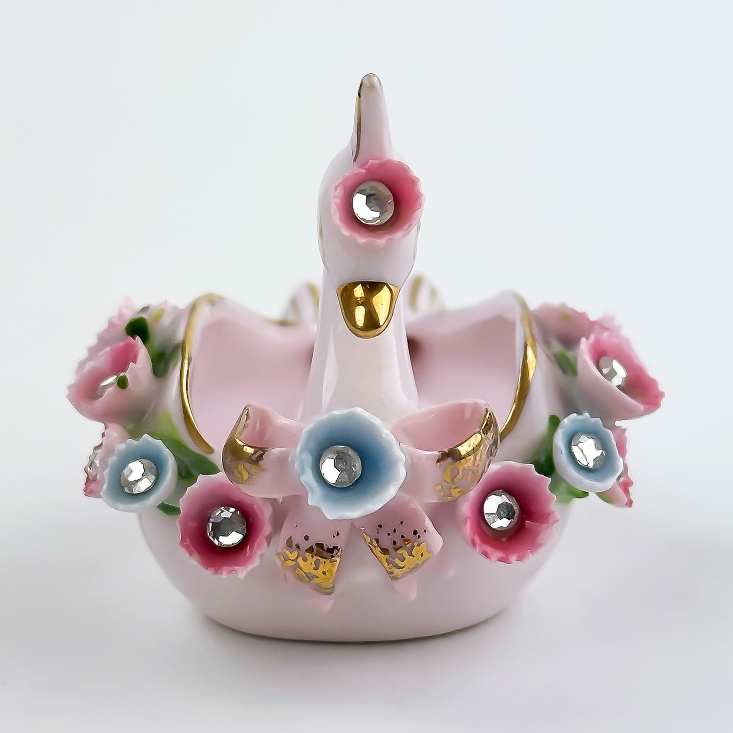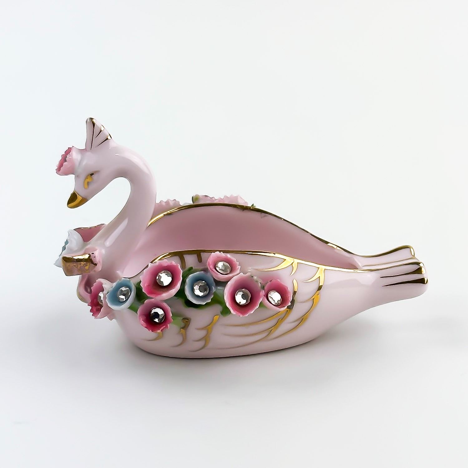 #8362 - VINTAGE LEFTON SWAN FIGURINE - FORGET ME NOT FLOWERS AND BOW - RHINESTONES IN CENTRE OF FLOWERS. SMALL PORCELAIN TRINKET OR JEWELRY DISH WITH GOLD TRIM - MARKED JAPAN 1727 ON BOTTOM. MEASURES: 3.5” (9 CM) LONG BY 2 3/8” (6 CM) WIDE AND 2.25” (6 CM) HIGH