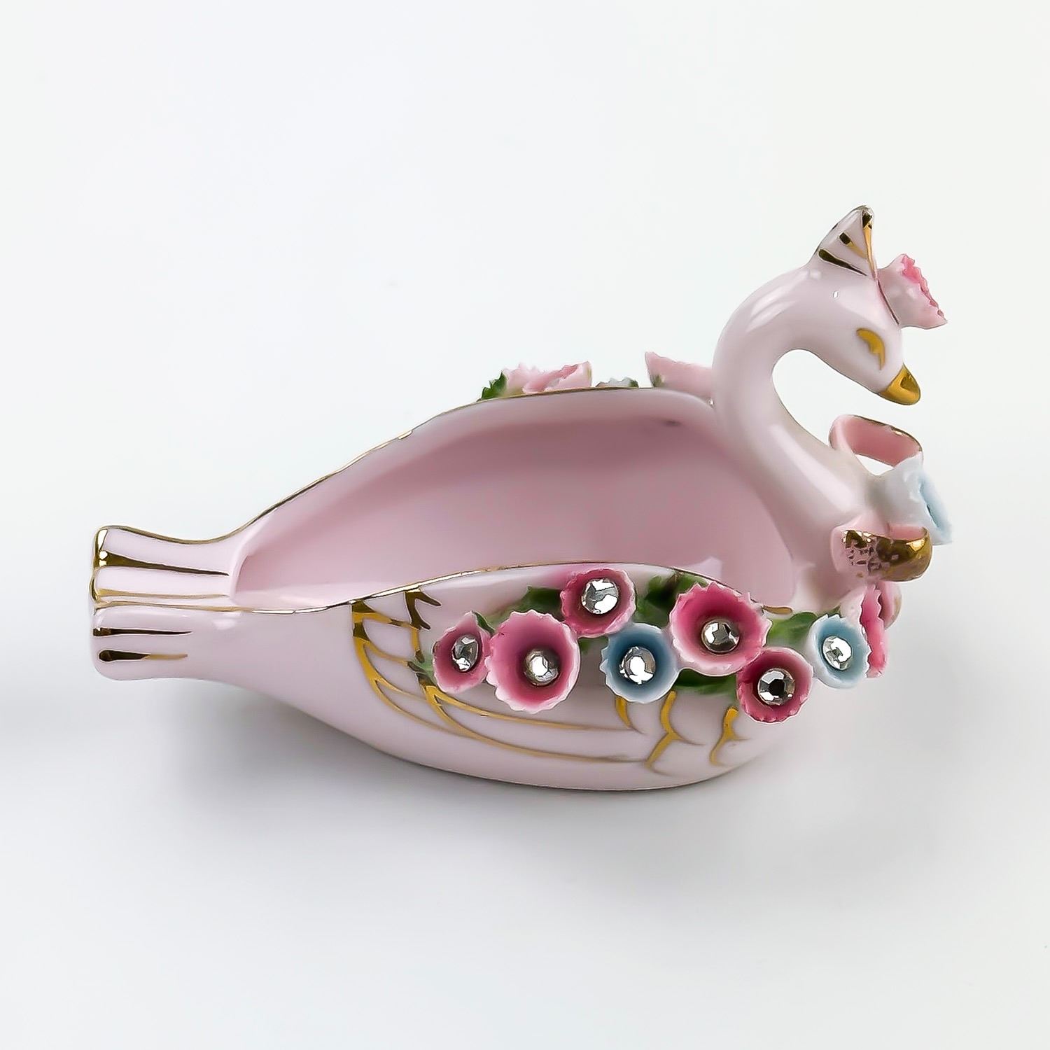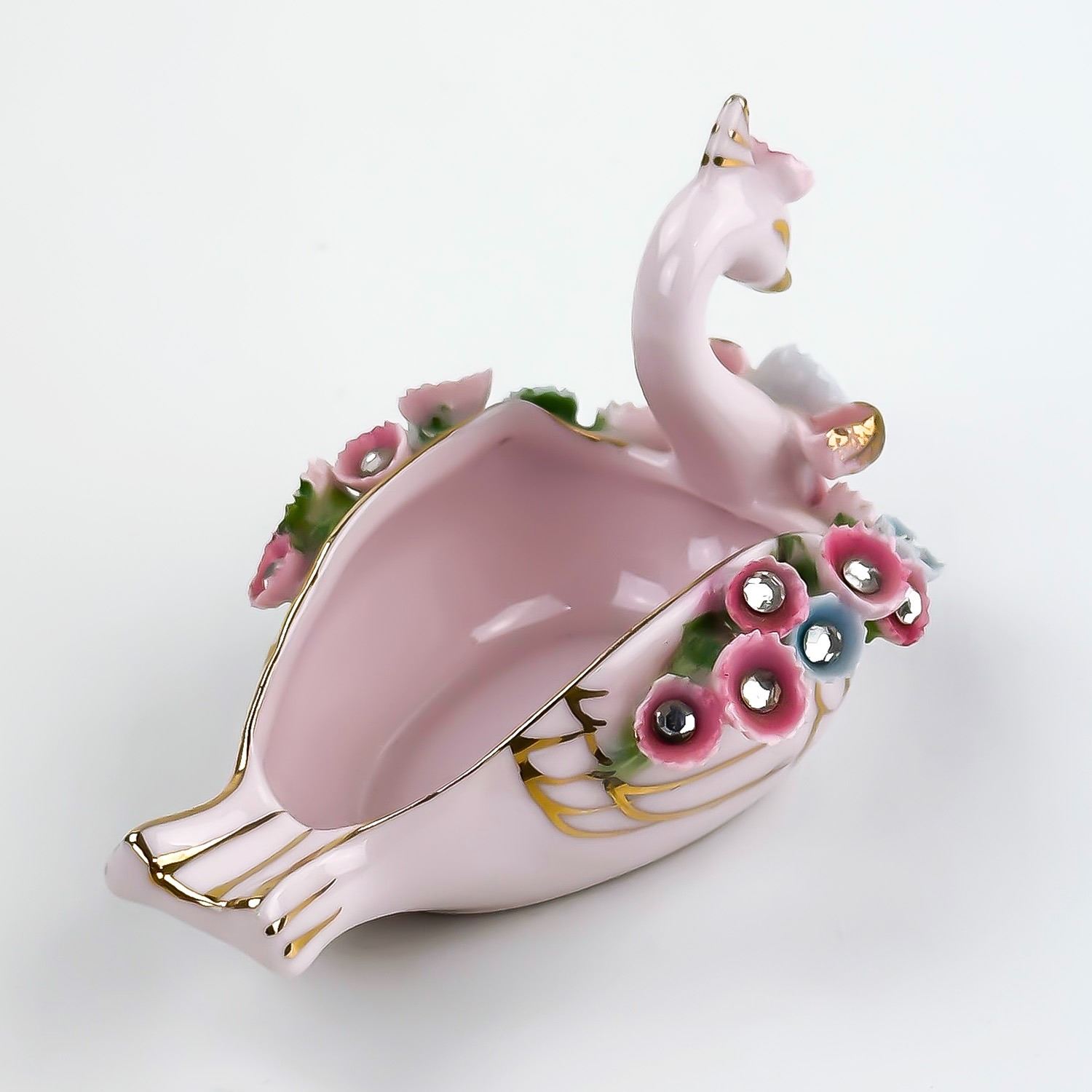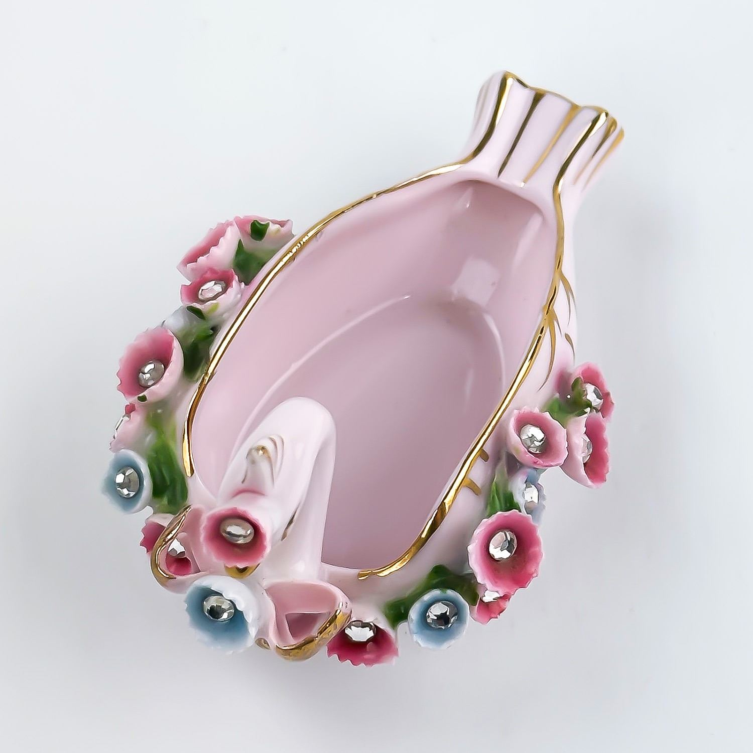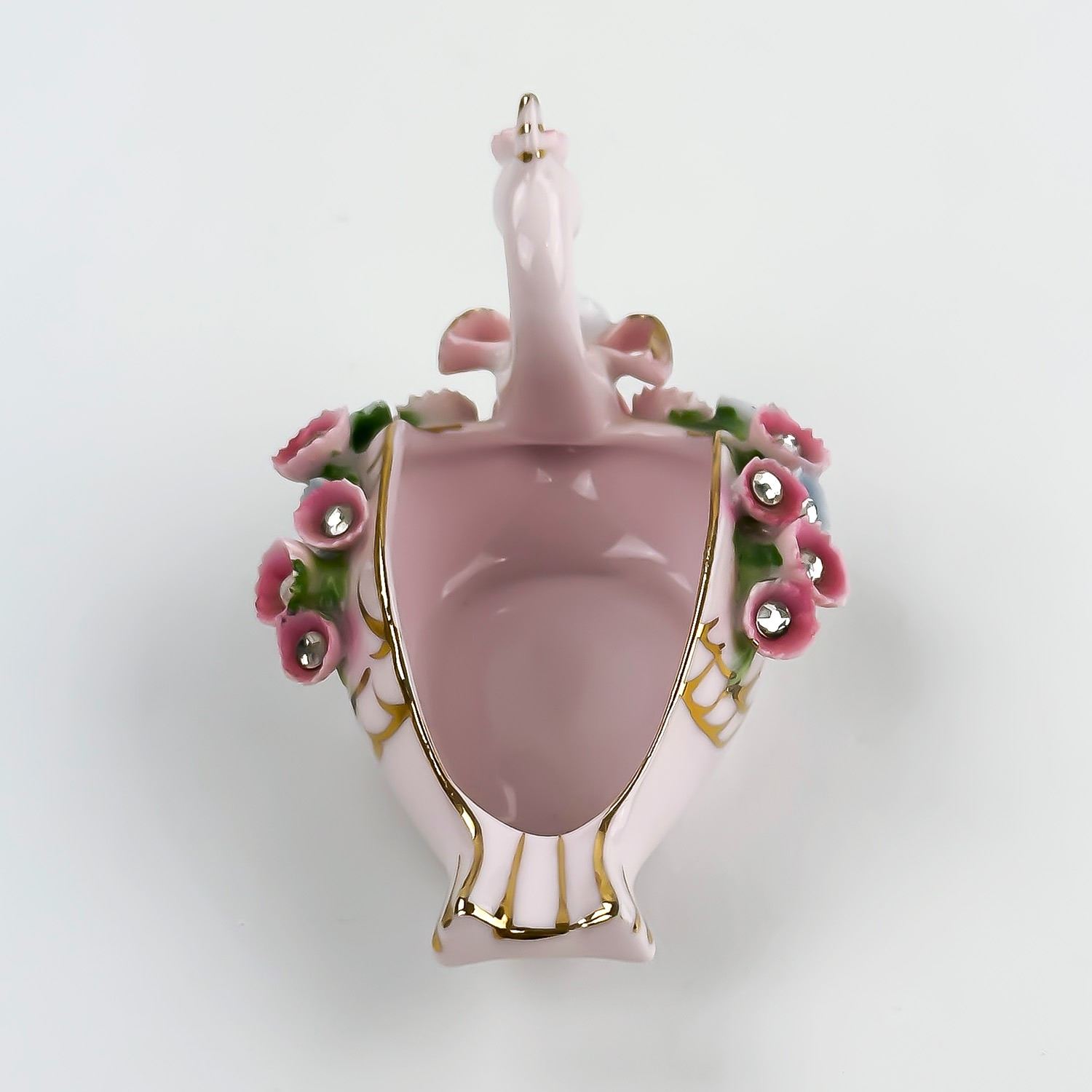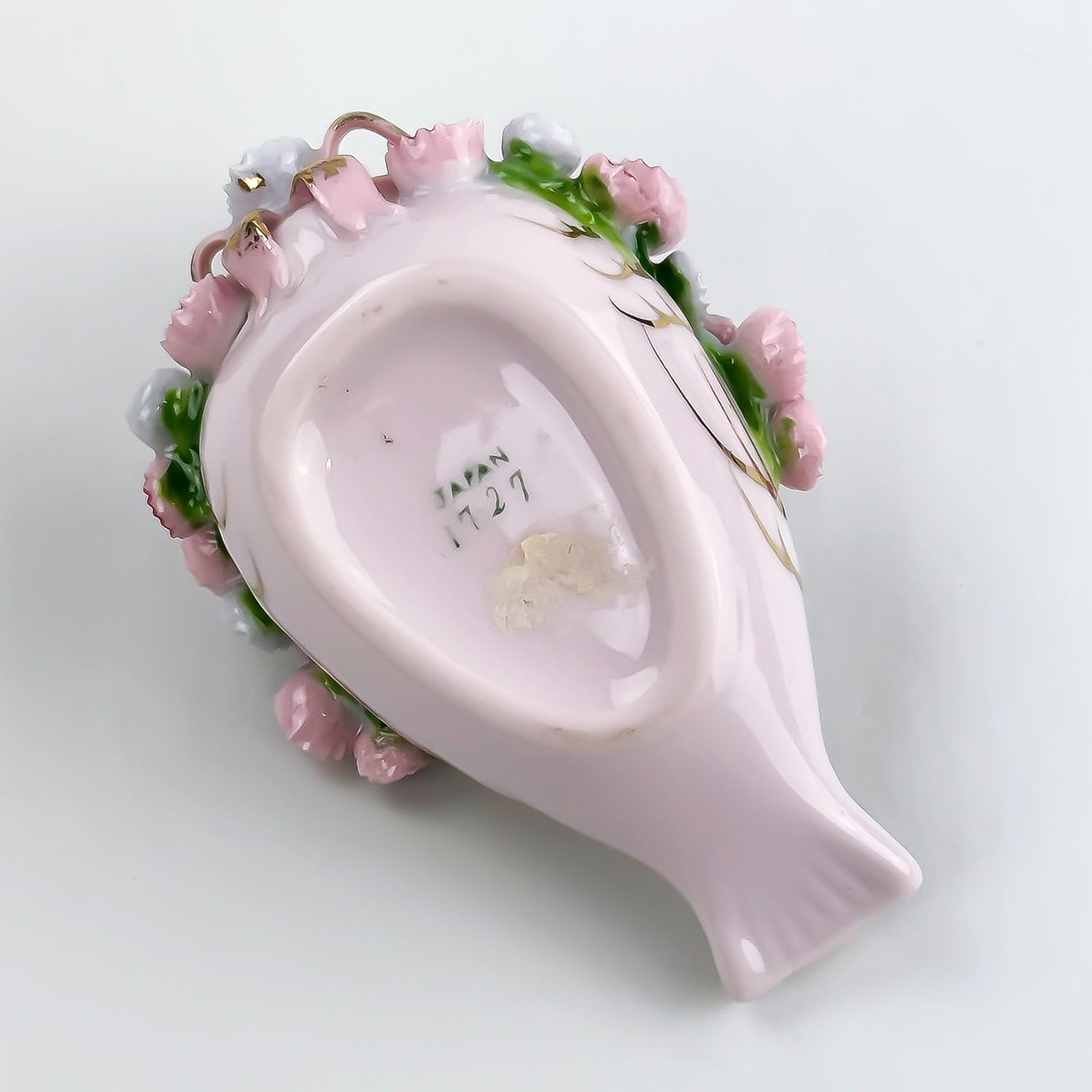 #8362 - VINTAGE LEFTON SWAN FIGURINE - FORGET ME NOT FLOWERS AND BOW - RHINESTONES IN CENTRE OF FLOWERS. SMALL PORCELAIN TRINKET OR JEWELRY DISH WITH GOLD TRIM - MARKED JAPAN 1727 ON BOTTOM. MEASURES: 3.5” (9 CM) LONG BY 2 3/8” (6 CM) WIDE AND 2.25” (6 CM) HIGH