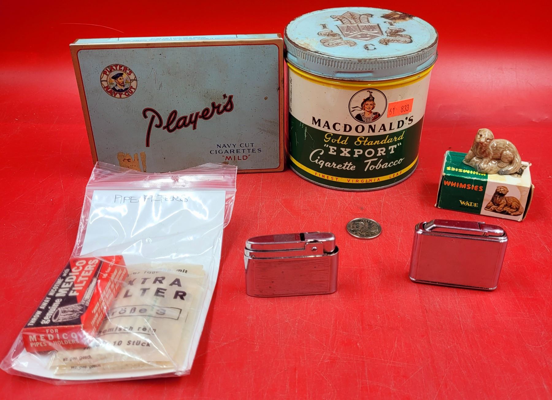 VTG Players Cigarettes Tin, MacDonald's Export Tobacco Tin, Lighters, Buttons & Smoking Lot