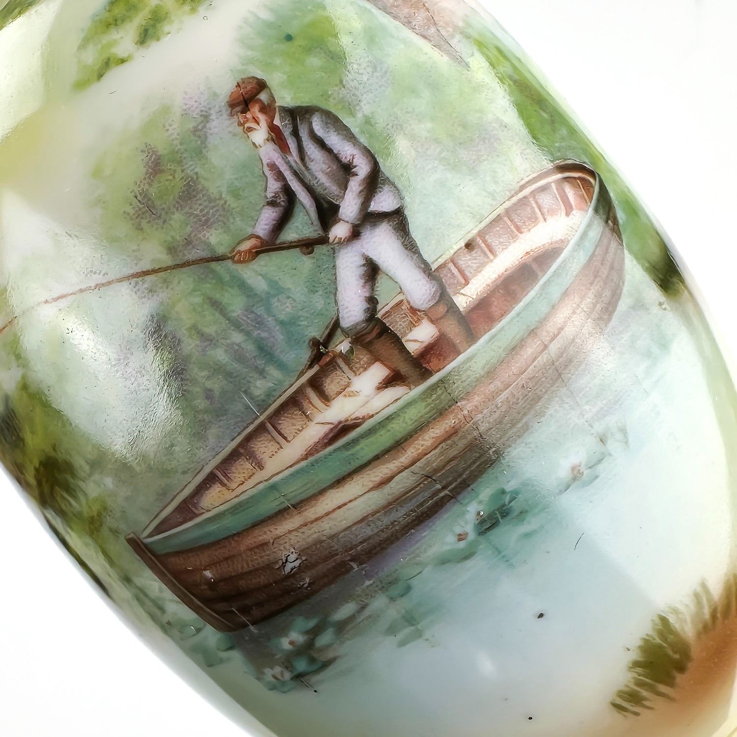 #8022 - VINTAGE HAND PAINTED PORCELAIN VASE - ROYAL BAYREUTH PRIV. 1794 BAVARIA FLOWER BUD VASE - FISHERMEN FISHING IN A BOAT THEME. MEASURES: 4” (10 CM) TALL BY 2.5”(6.5 CM) WIDEST DIAMETER