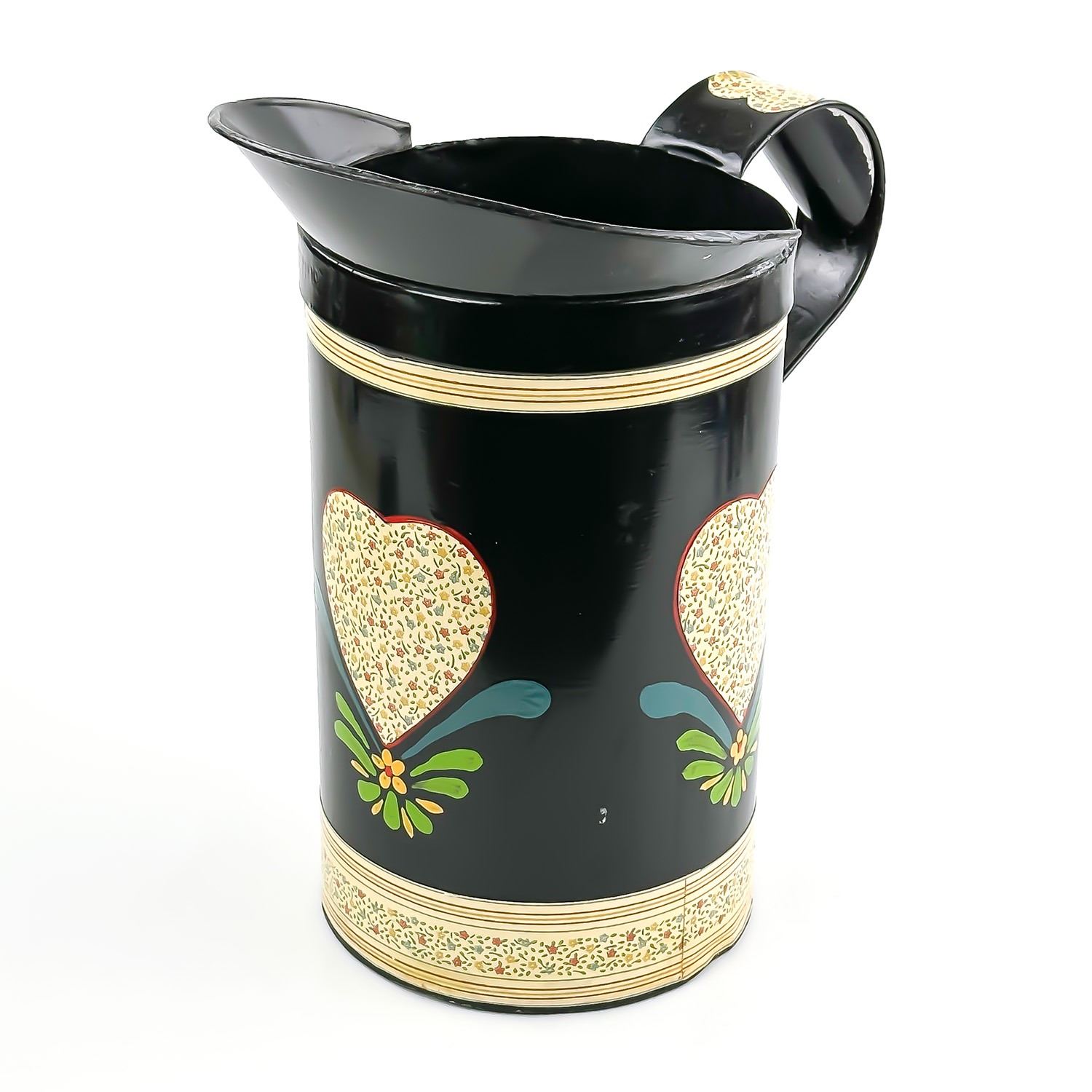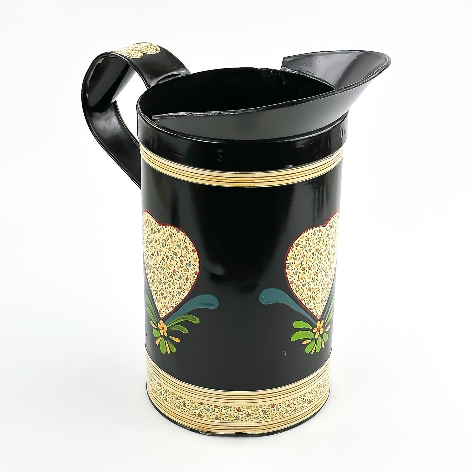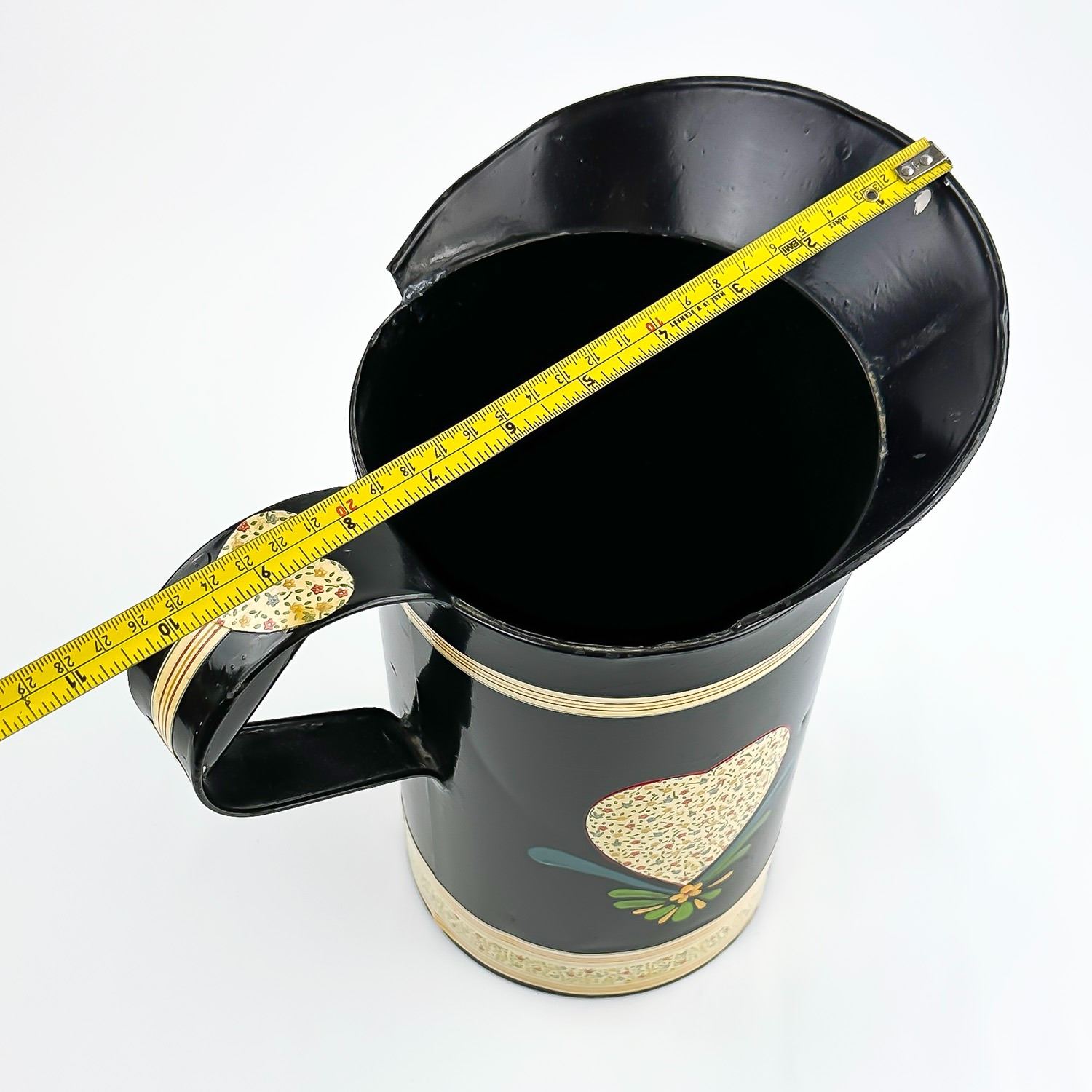 #8212 - VINTAGE FOLK ART DECORATED AND PAINTED SIMONS MFG CO ONE GALLON METAL PITCHER OR MEASURING TIN. NEEDS A LITTLE TLC AT THE BASE, HAS SMALL LEAK AT THE BASE SEAM DUE TO AGE ETC. - A LITTLE SOLDER SHOULD FIX THAT RIGHT UP. SUITABLE FOR PLANTER OR ARTIFICIAL FLOWERS. HOME OR OFFICE DECOR. MEASURES: 11.75” (30 CM) TALL TO SPOUT BY 10.25” (26 CM) WIDE - SPOUT TO HANDLE AND 6” (15.25 CM) MAIN BODY DIAMETER