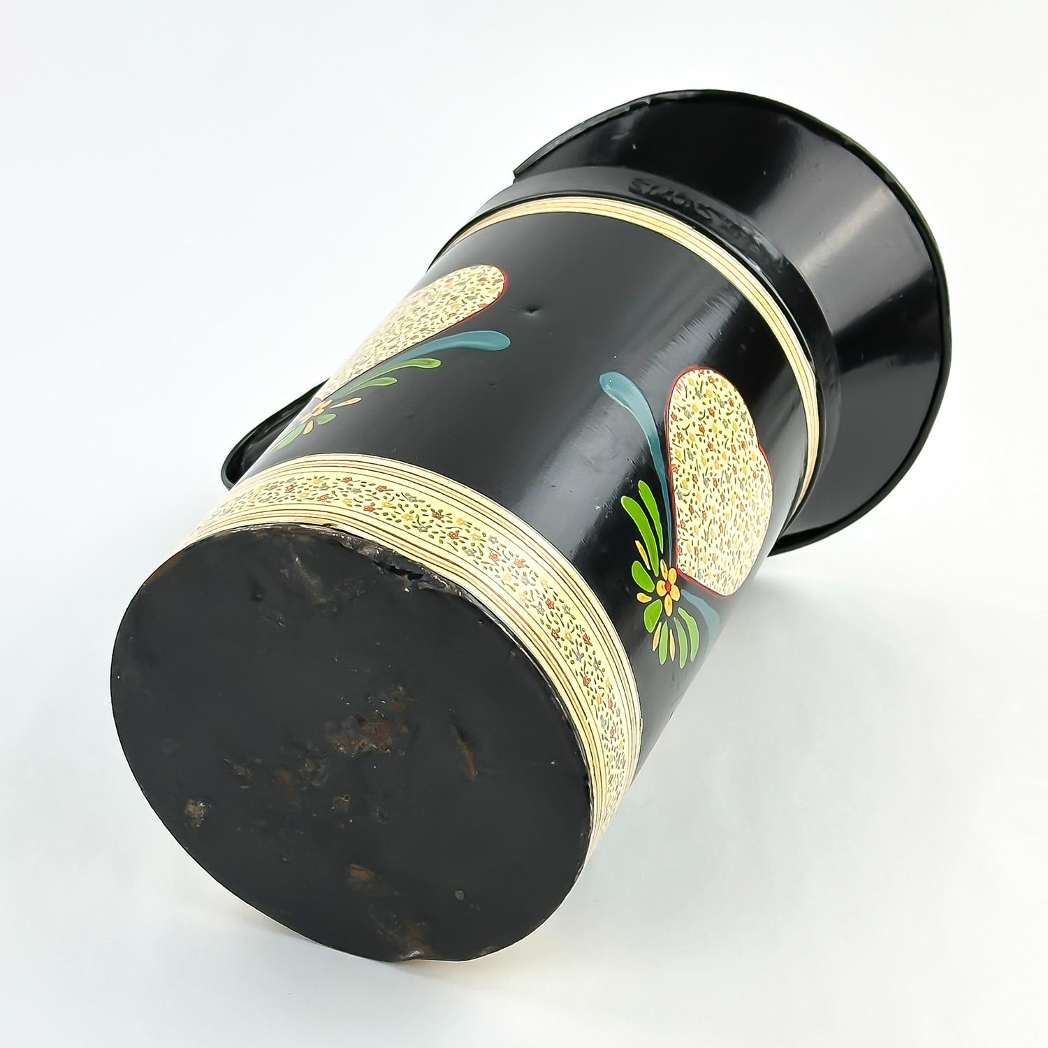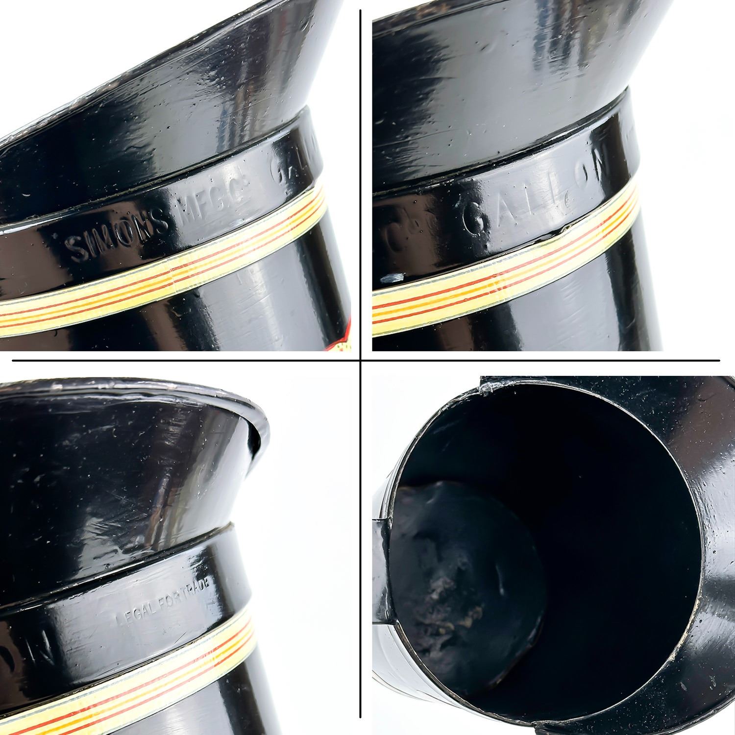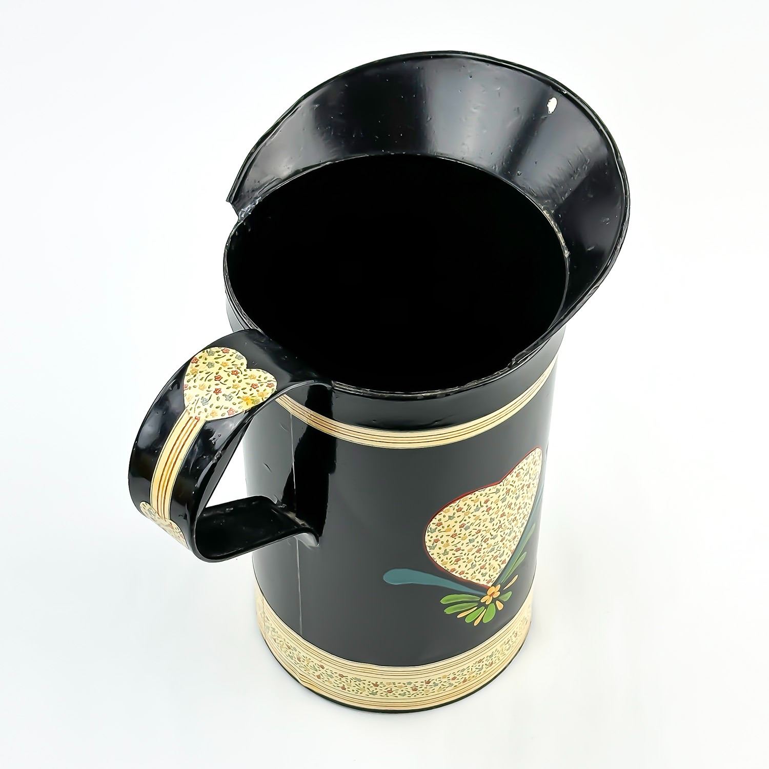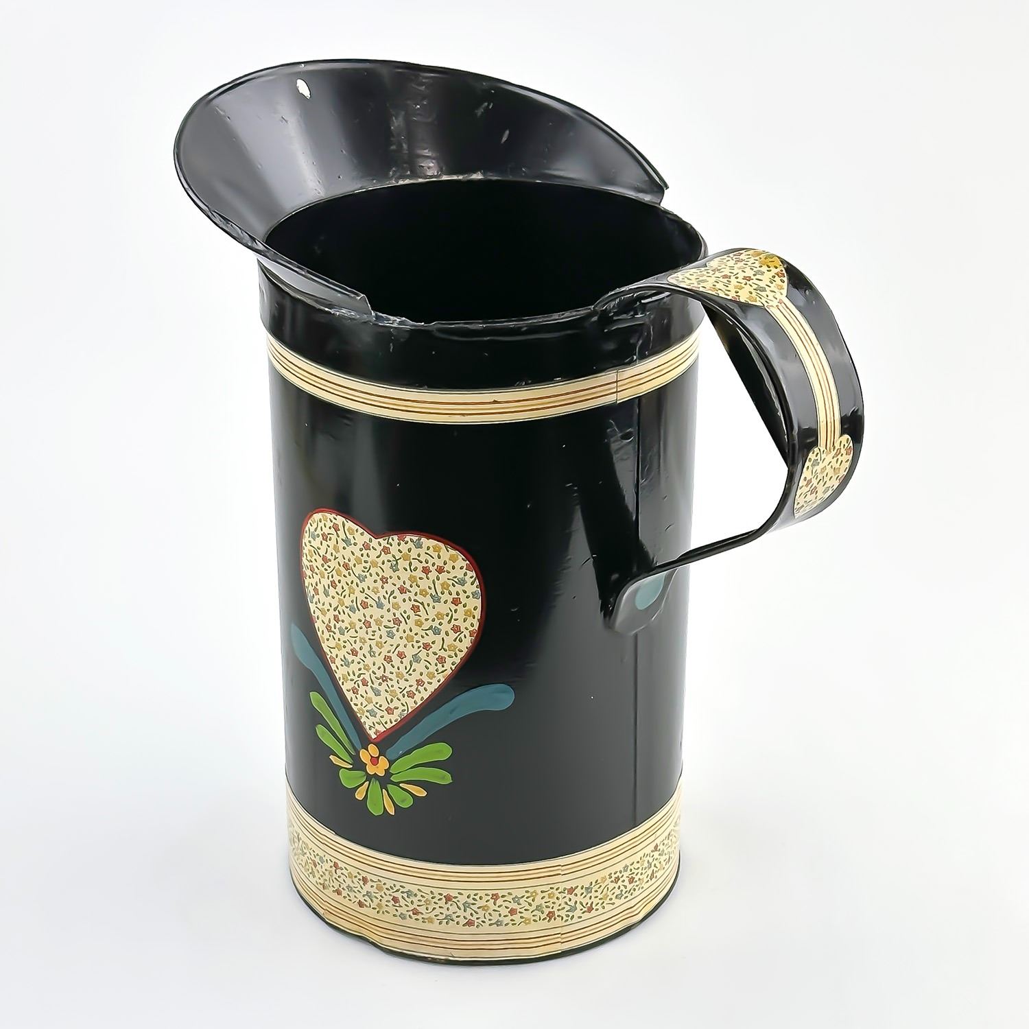 #8212 - VINTAGE FOLK ART DECORATED AND PAINTED SIMONS MFG CO ONE GALLON METAL PITCHER OR MEASURING TIN. NEEDS A LITTLE TLC AT THE BASE, HAS SMALL LEAK AT THE BASE SEAM DUE TO AGE ETC. - A LITTLE SOLDER SHOULD FIX THAT RIGHT UP. SUITABLE FOR PLANTER OR ARTIFICIAL FLOWERS. HOME OR OFFICE DECOR. MEASURES: 11.75” (30 CM) TALL TO SPOUT BY 10.25” (26 CM) WIDE - SPOUT TO HANDLE AND 6” (15.25 CM) MAIN BODY DIAMETER
