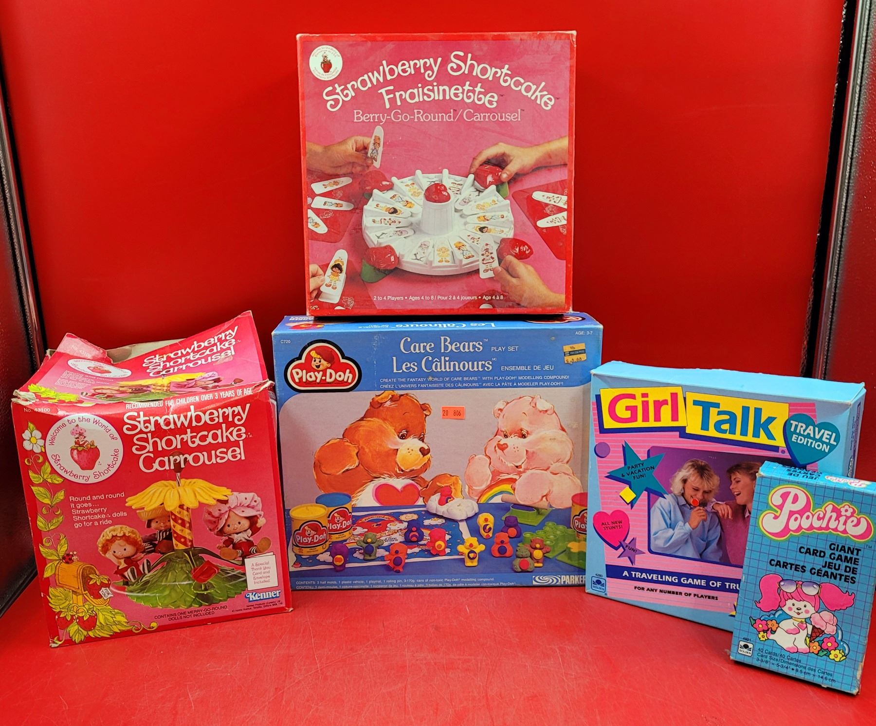 VTG Strawberry Shortcake Game & Toy, Care Bears Play Doh Set, Girl Talk Game, & Poochie Card Game