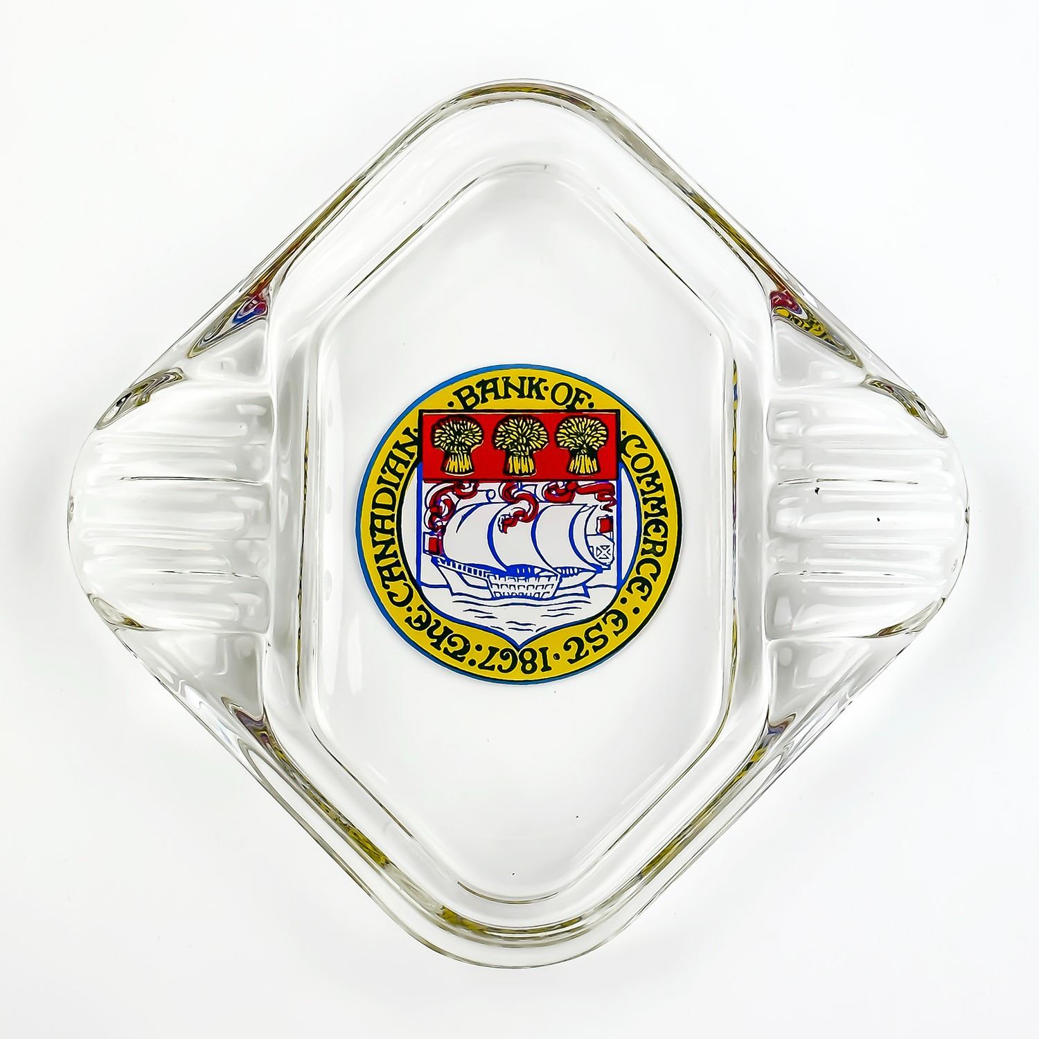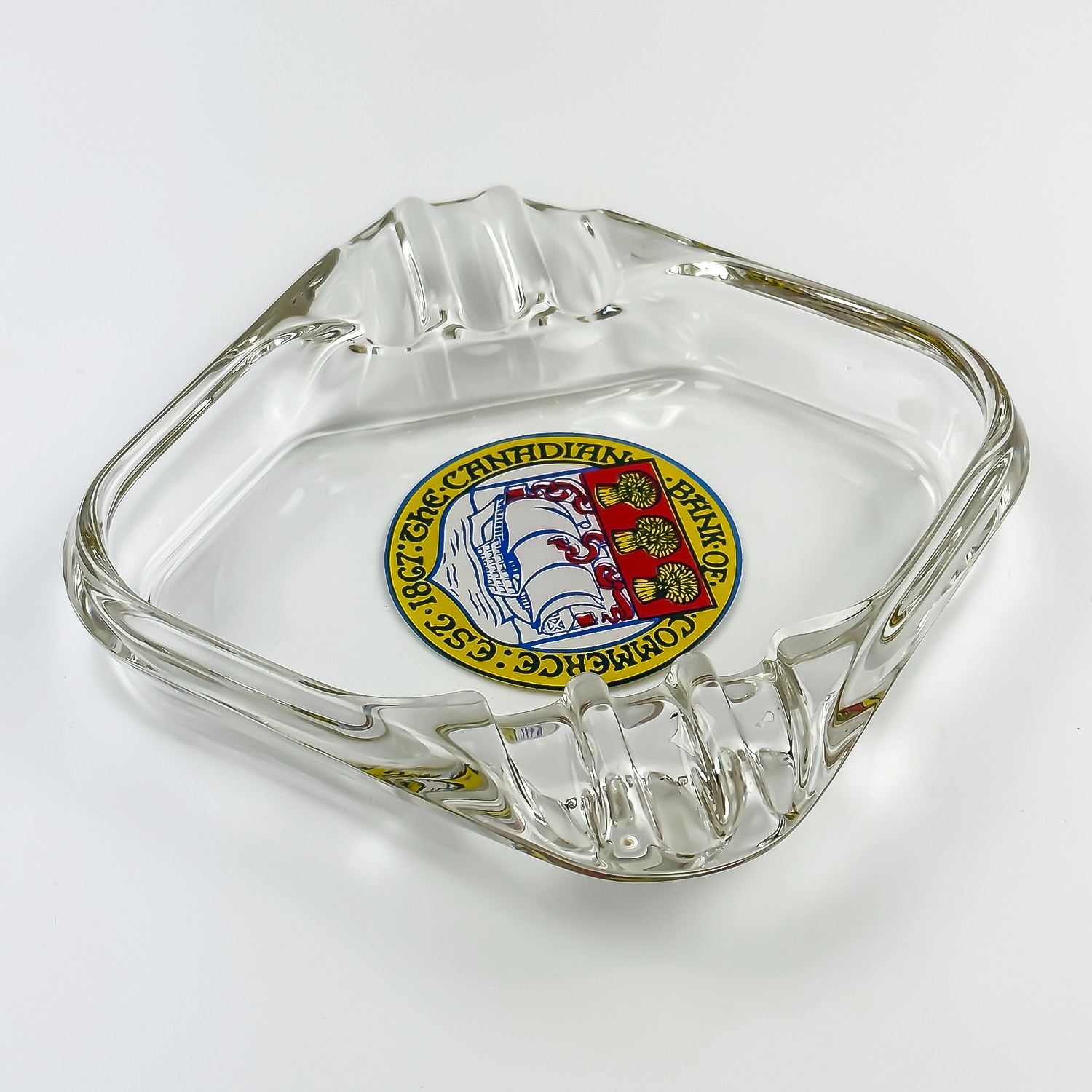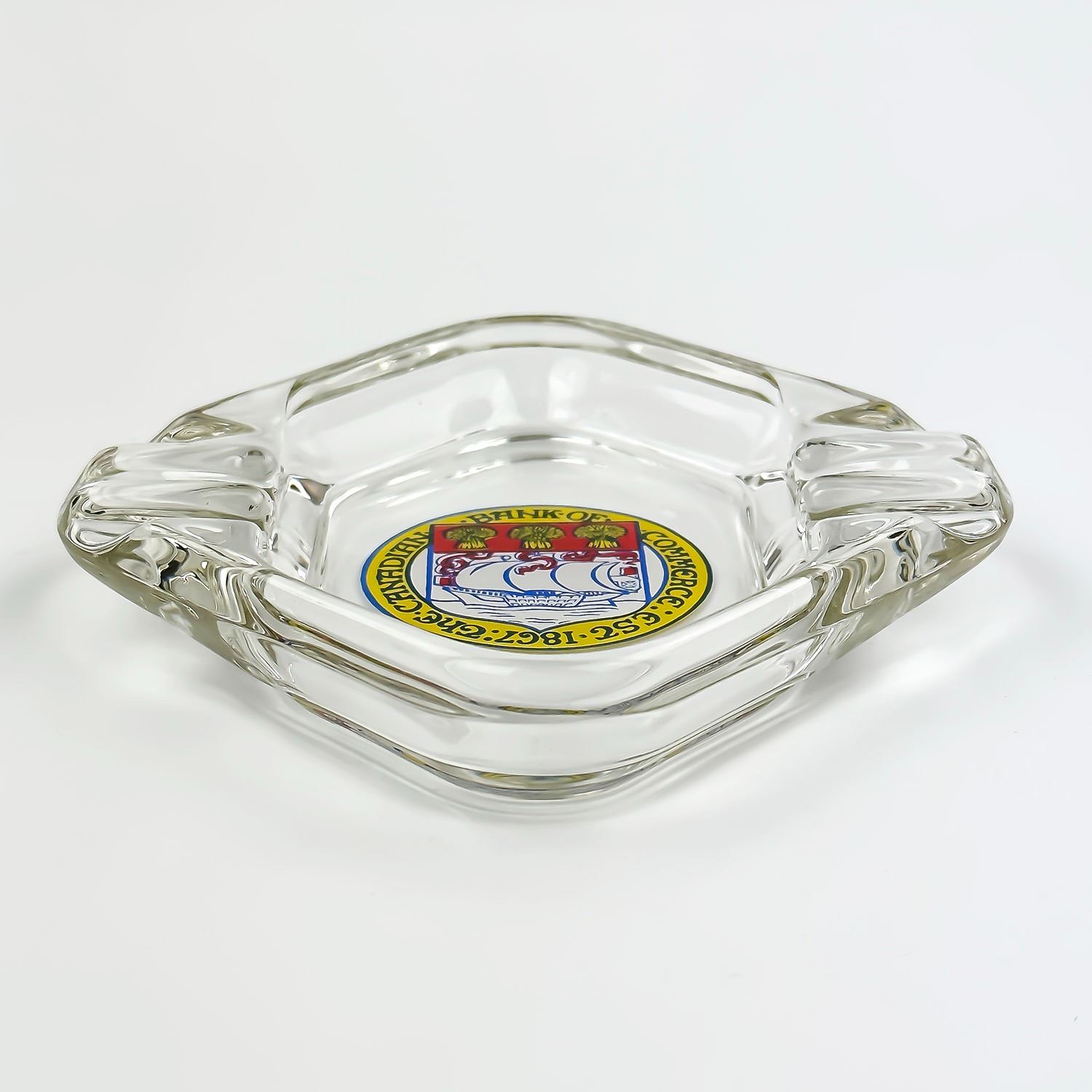 #8041 - VINTAGE CLEAR GLASS ADVERTISING CIGARETTE ASHTRAY. THE CANADIAN BANK OF COMMERCE EST 1867 - REVERSE ENAMELED ON THE BOTTOM. MEASURES: 4.75” (12 CM) SQUARE***ITEM(S) LOCATED IN LETHBRIDGE ALBERTA. FREE TRANSPORT TO EDMONTON OFFICE AVAILABLE FOR THIS AUCTION. WORLDWIDE SHIPPING IS AVAILABLE FOR ALL ITEMS