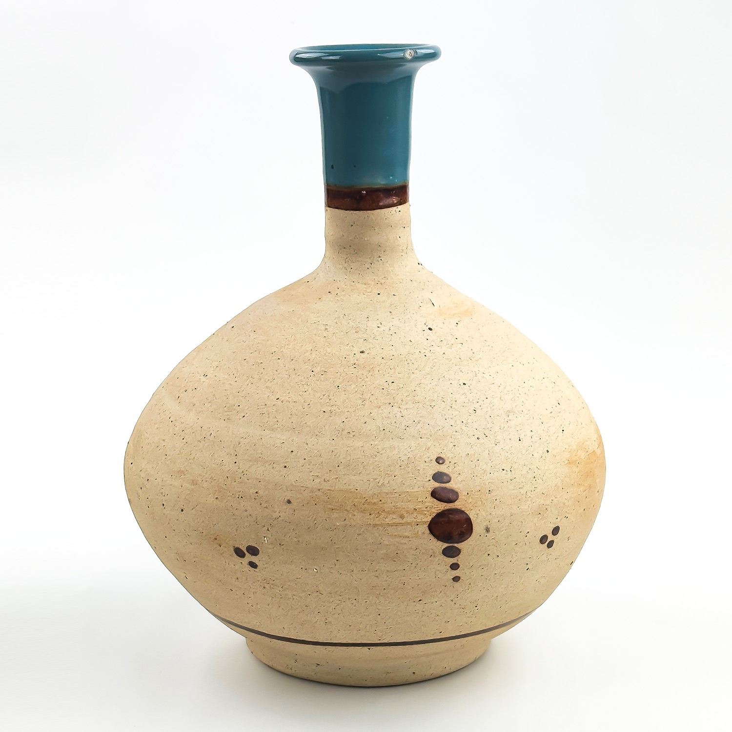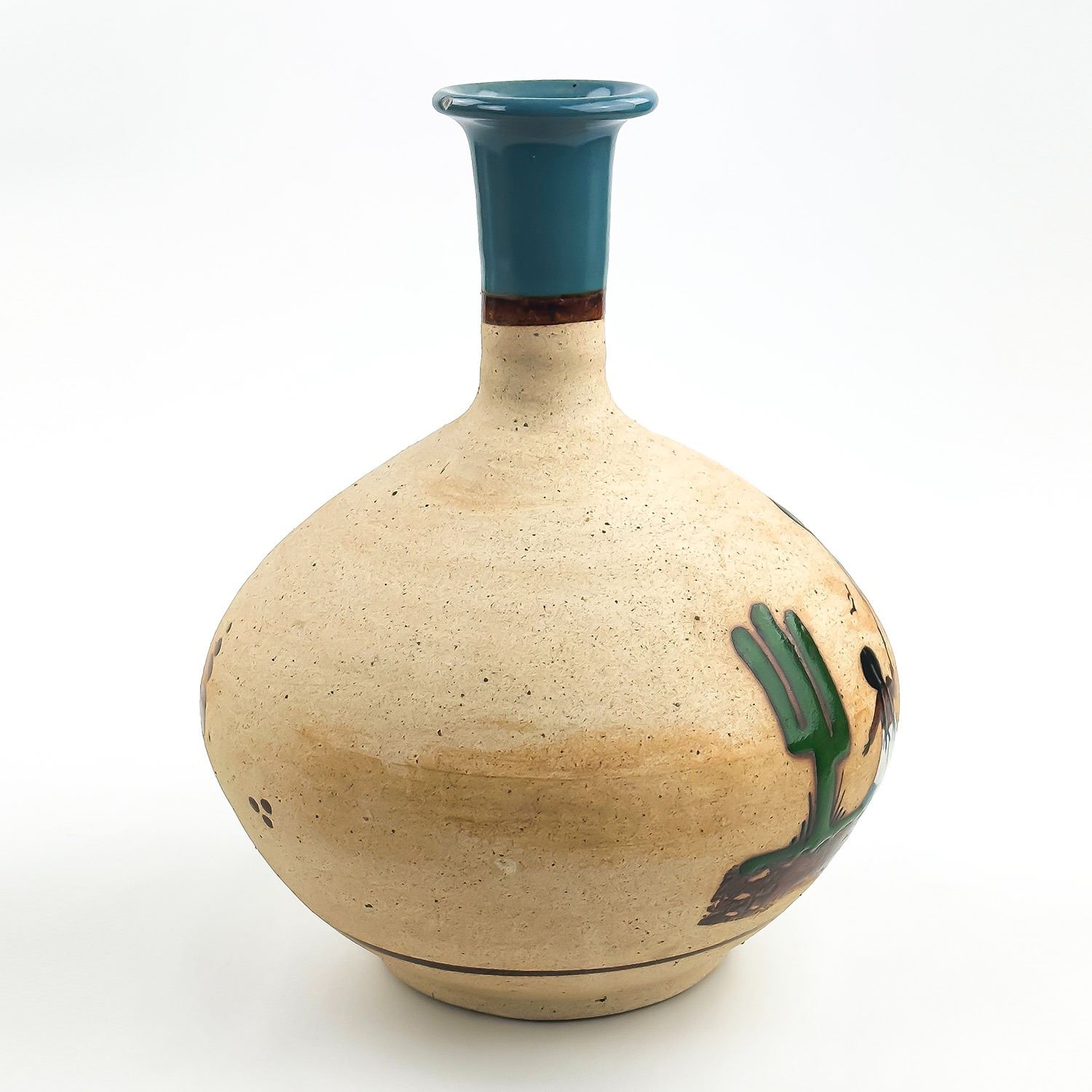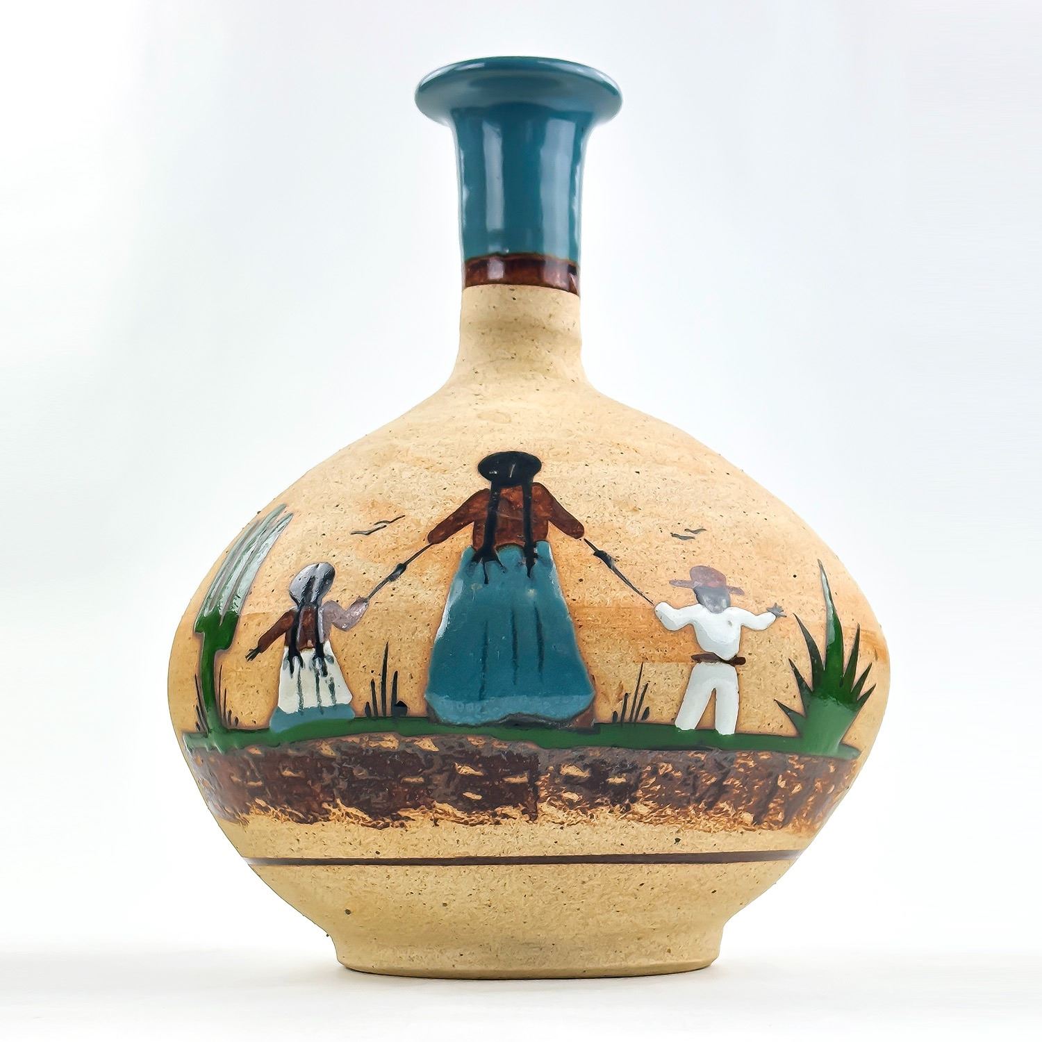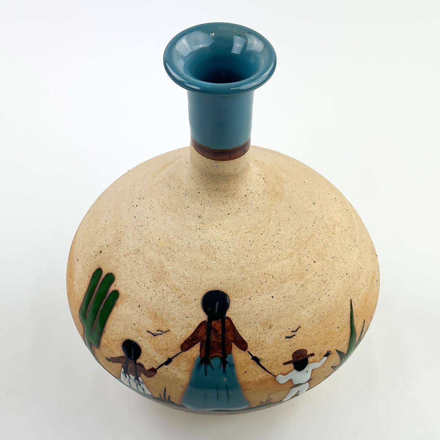 #8062 - LARGE SIGNED VINTAGE 11” TALL STONEWARE POTTERY VASE. HAND CRAFTED WITH MOTHER, CHILDREN AND CASTUS THEME GLAZED ON THE OUTSIDE. MEASURES: 11” (28 CM) TALL BY 9” (23 CM) WIDE AT WIDEST PART