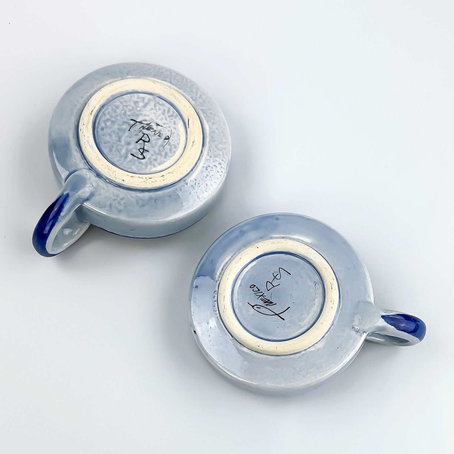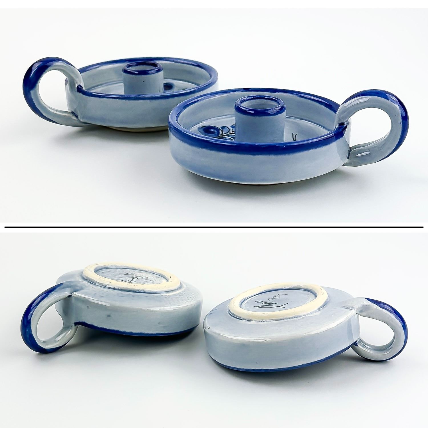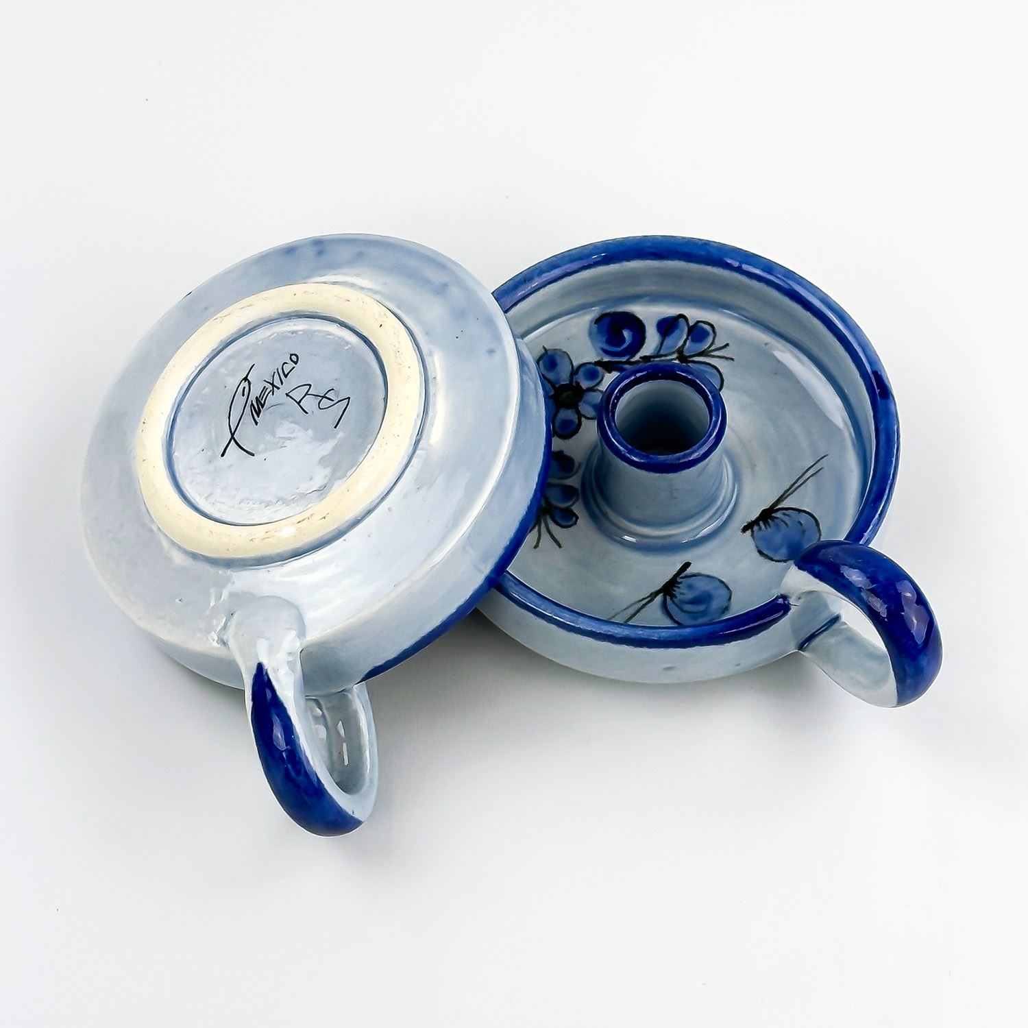 #8128 - VINTAGE PAIR OF MATCHING MEXICAN FOLK ART POTTERY. CHAMBER CANDLE HOLDERS - MARKED MEXICO AND SIGNED BY THE ARTIST. HAND CRAFTED & PAINTED ART POTTERY SCULPTURE. THEY ARE 10” (4 CM) DIAMETER - EXCLUDING HANDLE AND SIT 1.5” (4 CM) HIGH - TO THE TOP OF THE HANDLES.