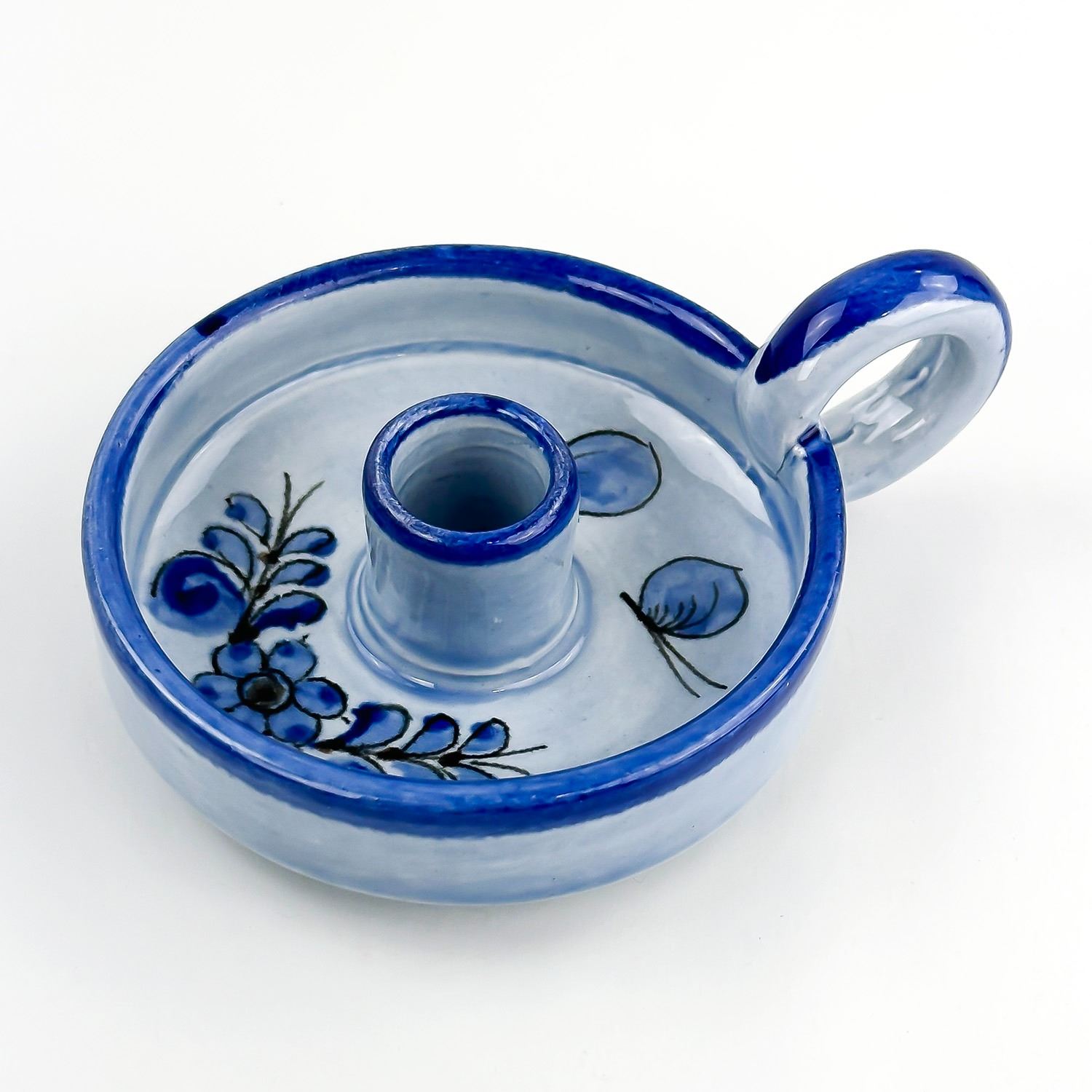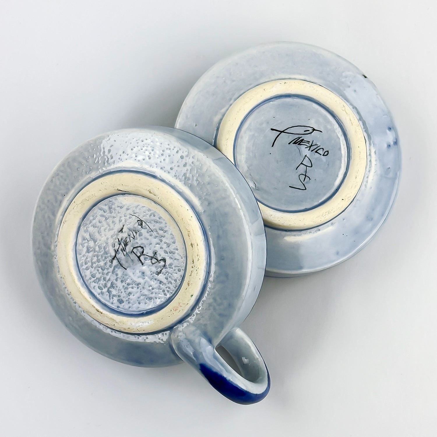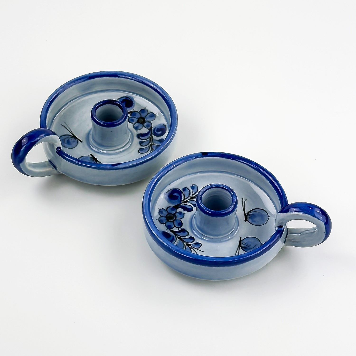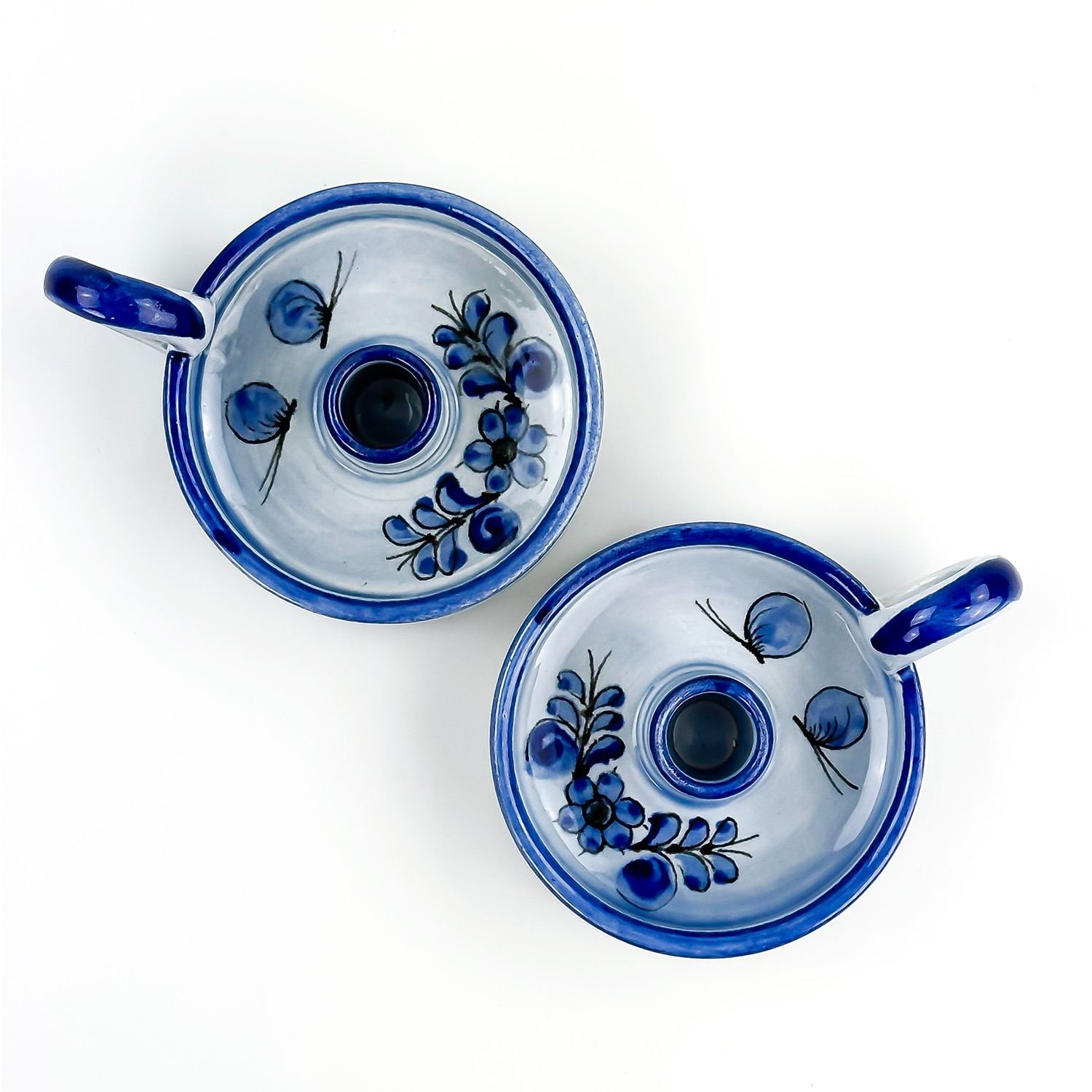 #8128 - VINTAGE PAIR OF MATCHING MEXICAN FOLK ART POTTERY. CHAMBER CANDLE HOLDERS - MARKED MEXICO AND SIGNED BY THE ARTIST. HAND CRAFTED & PAINTED ART POTTERY SCULPTURE. THEY ARE 10” (4 CM) DIAMETER - EXCLUDING HANDLE AND SIT 1.5” (4 CM) HIGH - TO THE TOP OF THE HANDLES.