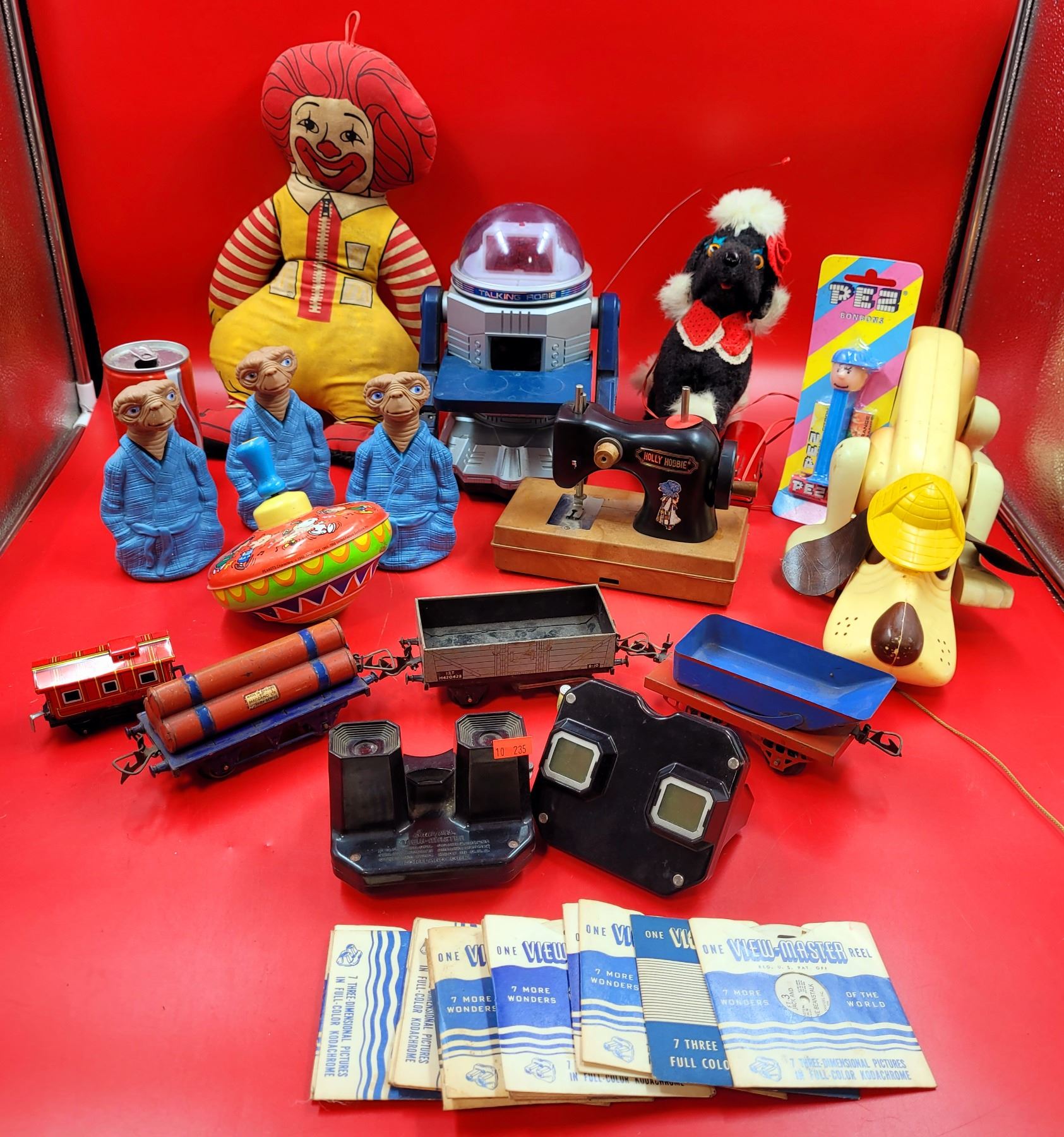 VTG Toy Lot Including E.T. Ronald McDonald, Pez, View Master Tin Train