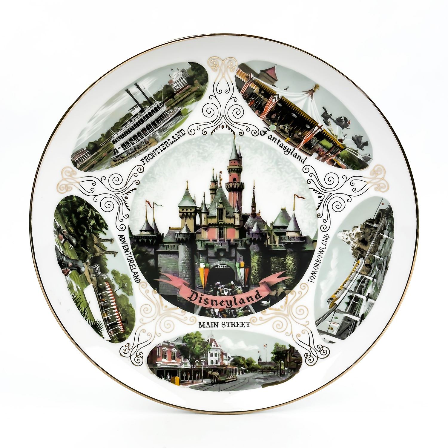 #8304 - VINTAGE 1960’S DISNEYLAND WALT DISNEY PROD. SOUVENIR PLATE WITH GOLD TRIM. THEME PARKS FEATURED: FRONTIERLAND, FANTASYLAND, TOMORROWLAND, ADVENTURELAND, MAIN STREET AND DISNEYLAND CASTLE. MEASURES: 9.5” (24 CM) DIAMETER