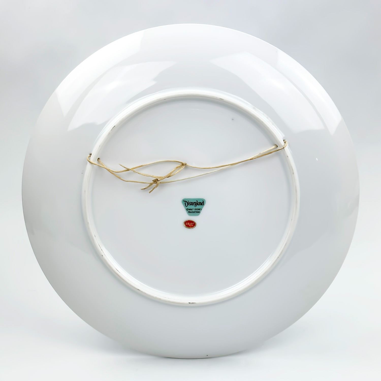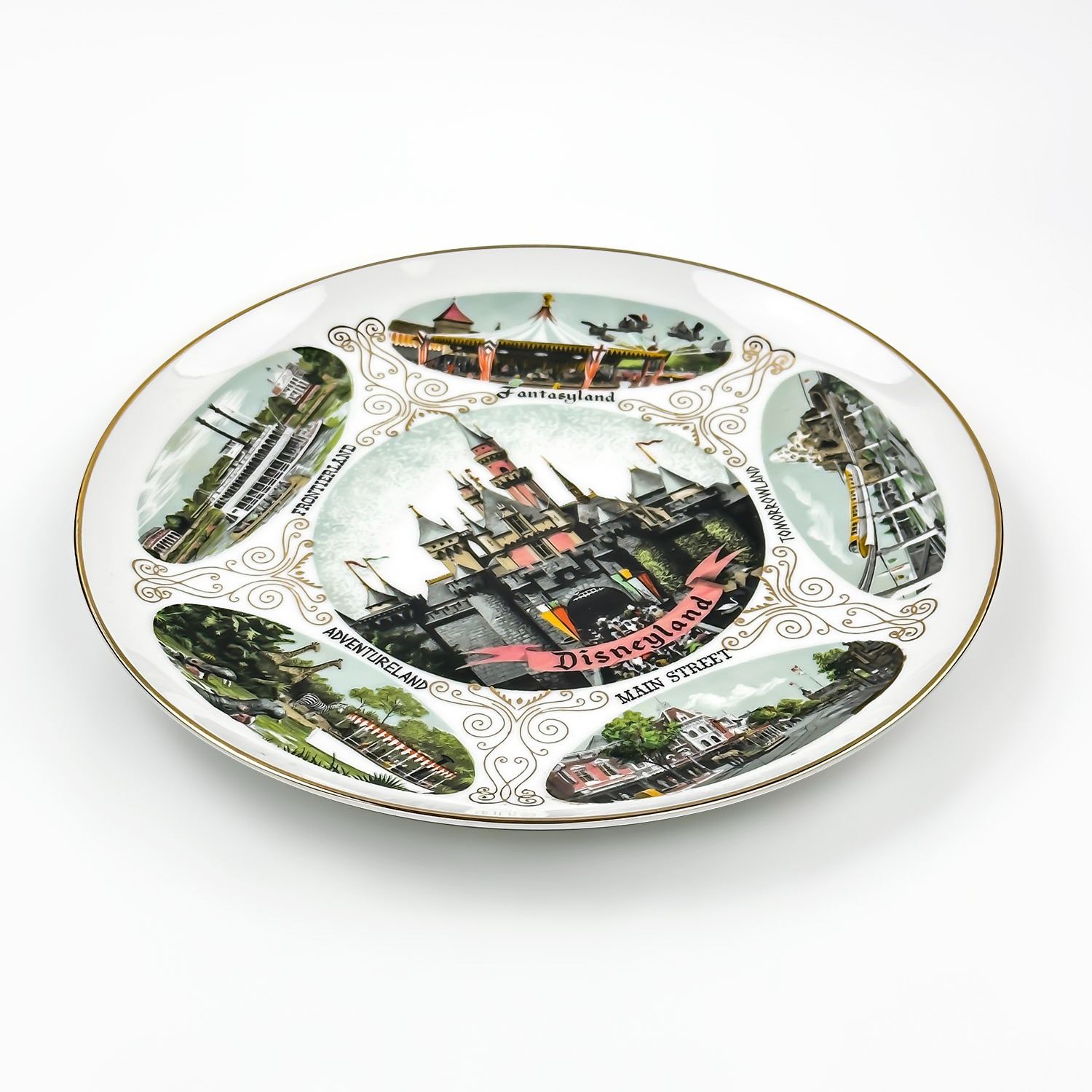 #8294 - VINTAGE 1960’S DISNEYLAND WALT DISNEY PROD. SOUVENIR PLATE WITH GOLD TRIM. THEME PARKS FEATURED: FRONTIERLAND, FANTASYLAND, TOMORROWLAND, ADVENTURELAND, MAIN STREET AND DISNEYLAND CASTLE. MEASURES: 9.5” (24 CM) DIAMETER