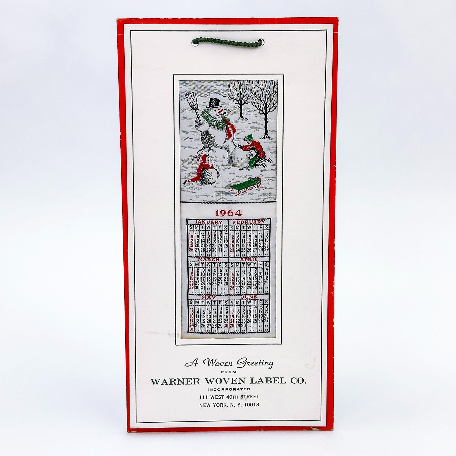 #8071 - CHRISTMAS SNOWMAN, KIDS AND SLEIGH THEME. A WOVEN GREETING FROM WARNER WOVEN LABEL CO. NEW YORK, NY. MONTHS OF JANUARY THRU JUNE 1964. CALENDAR MEASURES: 8.25” (21 CM) LONG BY 4.125” (10.5 CM) WIDE. MATERIAL LABEL MEASURES: 5.5” (14CM) LONG***ITEM(S) LOCATED IN LETHBRIDGE ALBERTA. FREE TRANSPORT TO EDMONTON OFFICE AVAILABLE FOR THIS AUCTION. WORLDWIDE SHIPPING IS AVAILABLE FOR ALL ITEMS