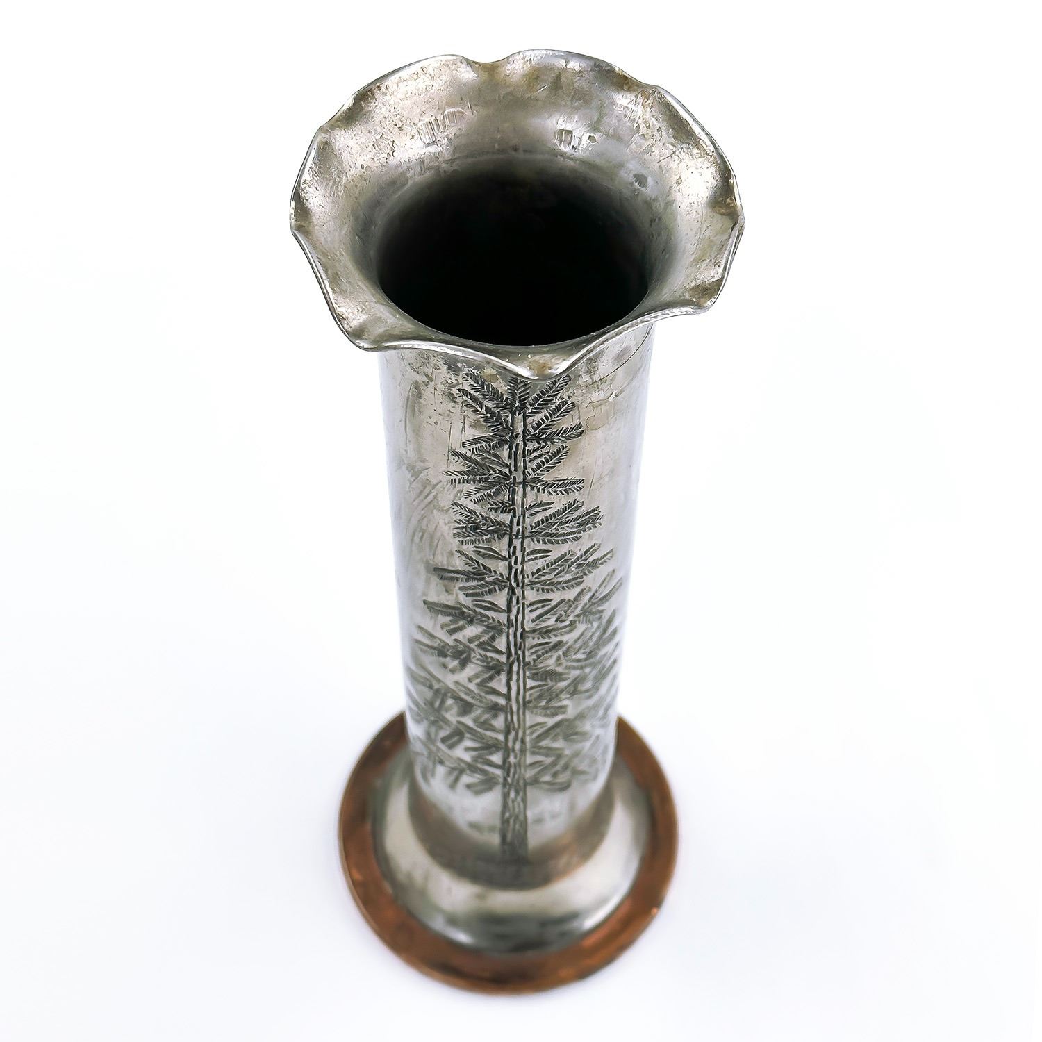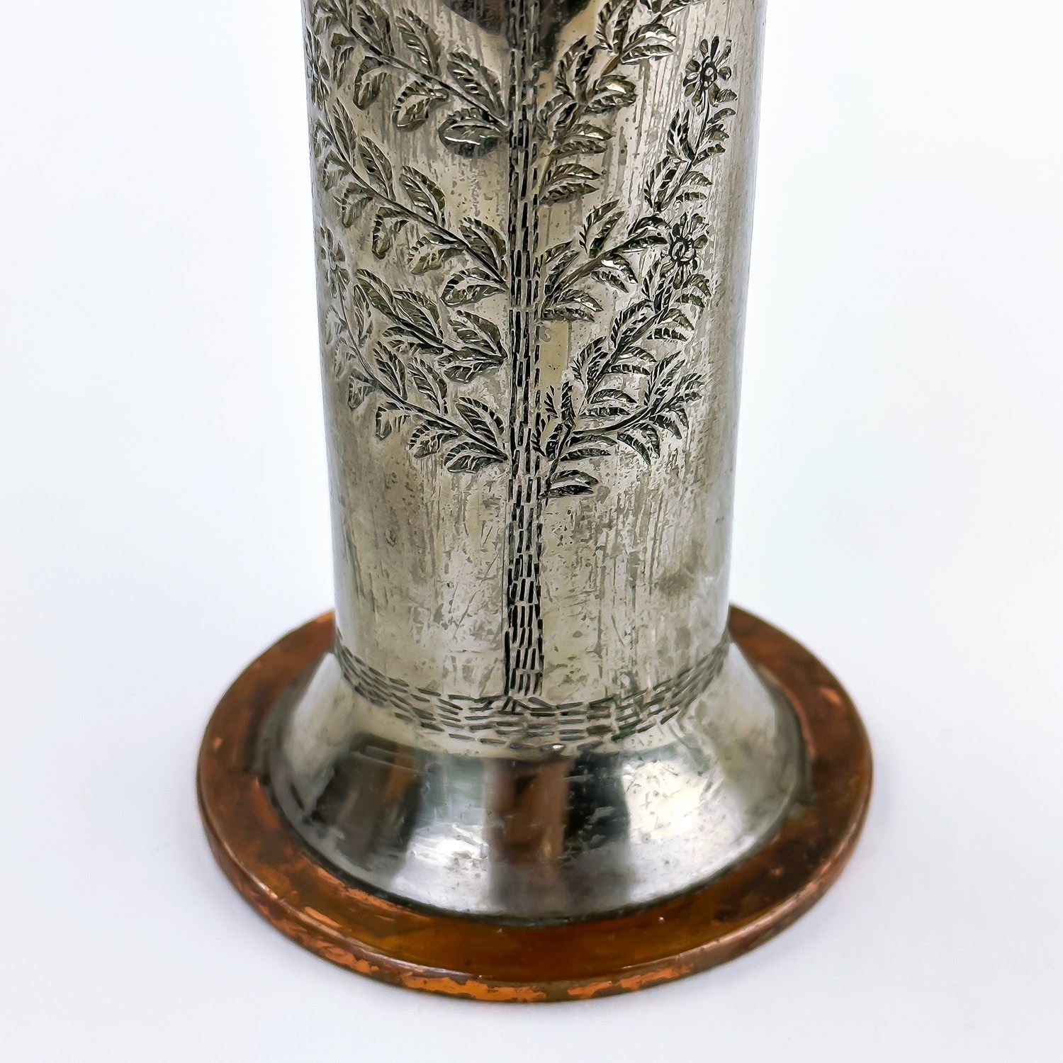 #8025 - VINTAGE WWII - WORLD WAR II TRENCH ART VASE. ARTILLERY SHELL WITH TOOLED HAMMERED TREE DESIGNS. MEASURES: 8.75” (22.5 CM) TALL BY 3.25” (8.5 CM) DIAMETER BASE