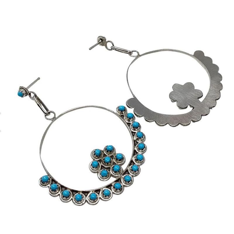 Stunning vintage Zuni sterling silver and snake eye Sleeping Beauty mine turquoise statement dangle earrings earrings. The earrings measure impressively about 2 1/4" long and weigh about 10g on both. Stunning craftsmanship and attention to detail, natural turquoise stones from the Sleeping Beauty mine. Unmarked as most vintage Native jewelry pieces and has been tested for silver content. Post dangle style. Some patina is noticeable on the earrings and can be polished upon request. Fab authentic Native American Zuni statement dangle earrings to add to any jewelry collection! FREE SHIPPING ON ALL JEWELRY ORDERS WITHIN THE US!
