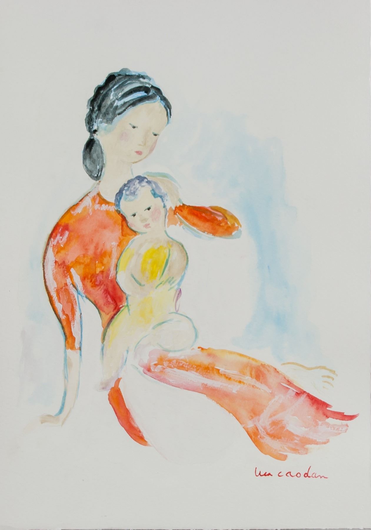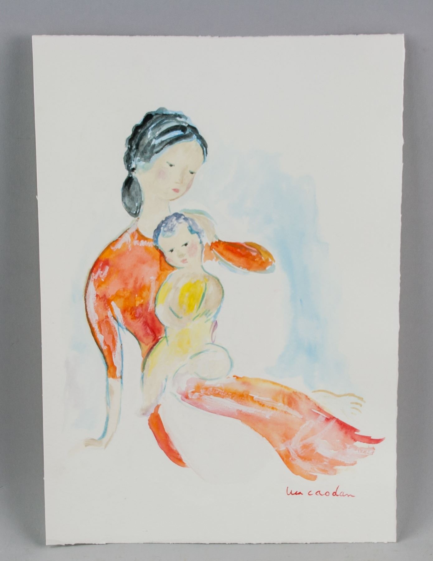 Watercolor on paper. Featuring a woman holding a child. Signed and attr. Vu Cao Dam (French-Vietnamese, 1908-2000) on the lower right corner. 35 x 24.5 cm (13.8 x 9.7 in.) Vu Cao Dam was a Vietnamese painter. He was one of the alumni of Victor Tardieu's École des Beaux-Arts de l’Indochine in Hanoi in the 1930s, along with Mai Trung Th?, Lê Ph? and woman painter Lê Th? L?u to emigrate to France and make a career in Paris. PROVENANCE: Private estate (Perugia, Italy)