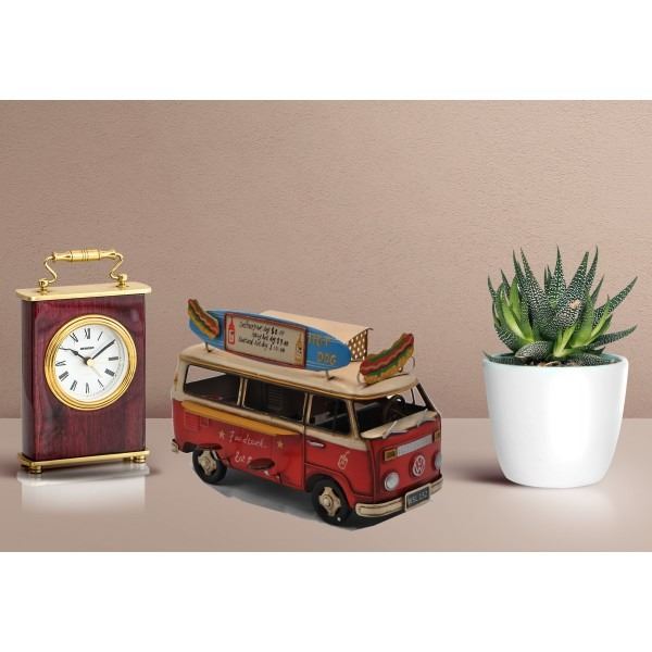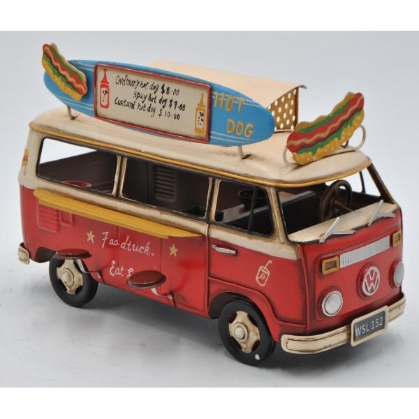 Decorate for any table, desk, or shelf in sporty fashion with Our Rustic 1966 Volkswagen Food Truck Sculpture. Featuring a rustic iron frame, this charming vintage Classic Car includes fine detail. The Blue and White Exterior are finished in natural colors. Dimensions: approx (H X W): 7 X 10 Inches.