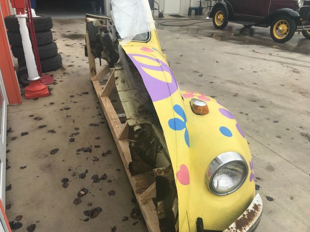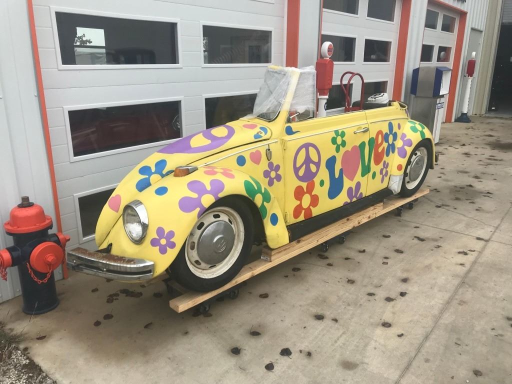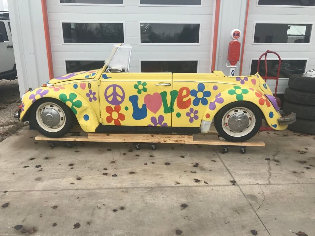 Hippy VW Peace Love wall hanger Here is something very coo at hat will be a part of our auction on Saturday. It has been created from an original Volkswagen Bettle Bug. It would be great for a restaurant, garage art, bar or on the side of a building ha maybe even a Volkswagen repair shop. IT is crated on wheels so it is pretty easy to move around and can be shipping by an automobile carrier. Unsure of a price but lets say 1.00 per loaded mile like a car.