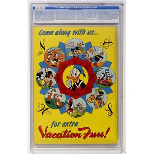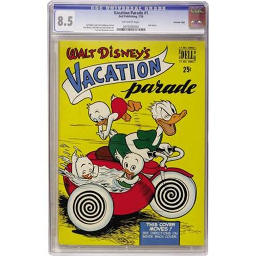 <B>Dell Giant Comics - Vacation Parade #1 - Crowley Copy pedigree (Dell, 1950) CGC VF+ 8.5 Off-white pages.</B></I> This big, big, <I>really</B></I> big book of 132 pages boasted 55 pages of Carl Barks art. Donald Duck, Mickey Mouse, Goofy, Huey, Dewey, and Louie appear on the inside, while on the outside a Carl Von Buettner cover starring Donald and the nephews delights the viewer. The top-ranked copies of this issue earned NM- 9.2 certification, just barely nicer than this. Overstreet 2007 VF 8.0 value = $696; VF/NM 9.0 value = $1,223. CGC census 6/07: 2 in 8.5, 2 higher.<BR><BR><b>Shipping:</b> Comics - Slabbed (certified) (<a target="_blank" href="http://www.heritageauctions.com/common/shipping.php">view shipping information</a>)