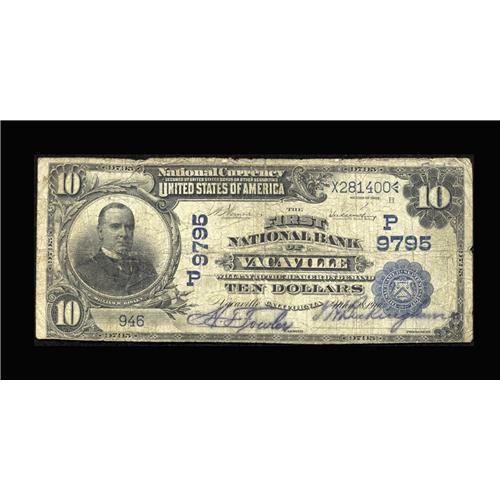<B>Vacaville, CA</B></I> - $10 1902 Date Back Fr. 619 <B>The First NB</B></I> Ch. # (P)9795<BR>This is one of two Date Backs listed in a census of eight large examples. <B>Very Good.</B></I> Ex. Horwedel September 2004.