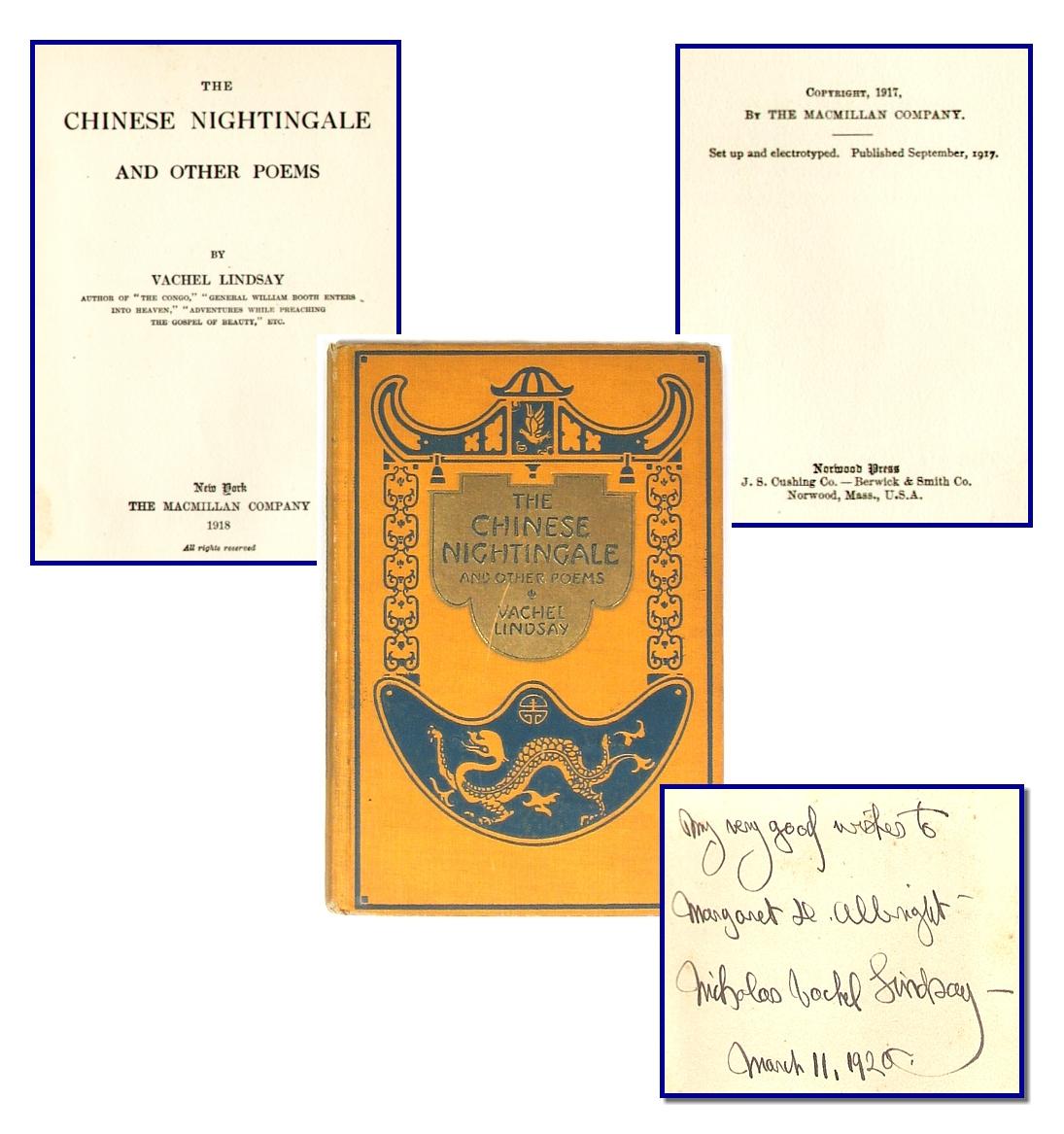 ''The Chinese Nightingale and Other Poems'' by Vachel Lindsay. NY: Macmillan Co.: 1918. Gold cloth boards with gilt old Chinese stamped motif. Inscribed: ''My very good wishes to Margaret H. Albright-Nicholas, Vachel Lindsay - March 11, 1920.'' Some pencil notations and light spotting on inside pages. Rear free end pages and pastedown contain numerous pencil notations. Overall, very good.
