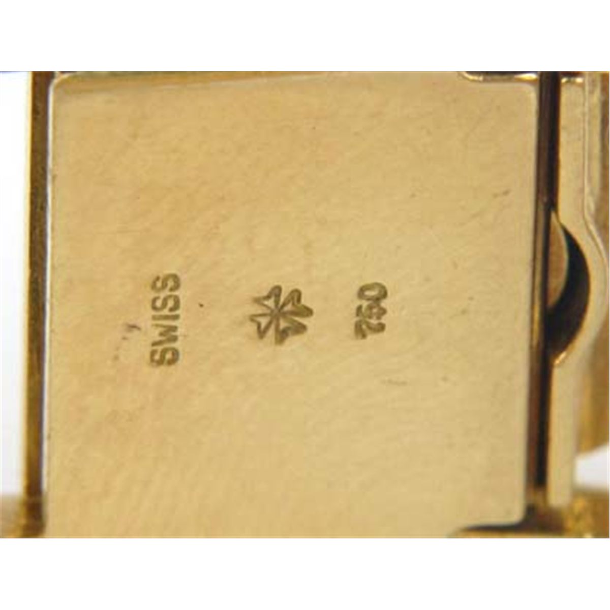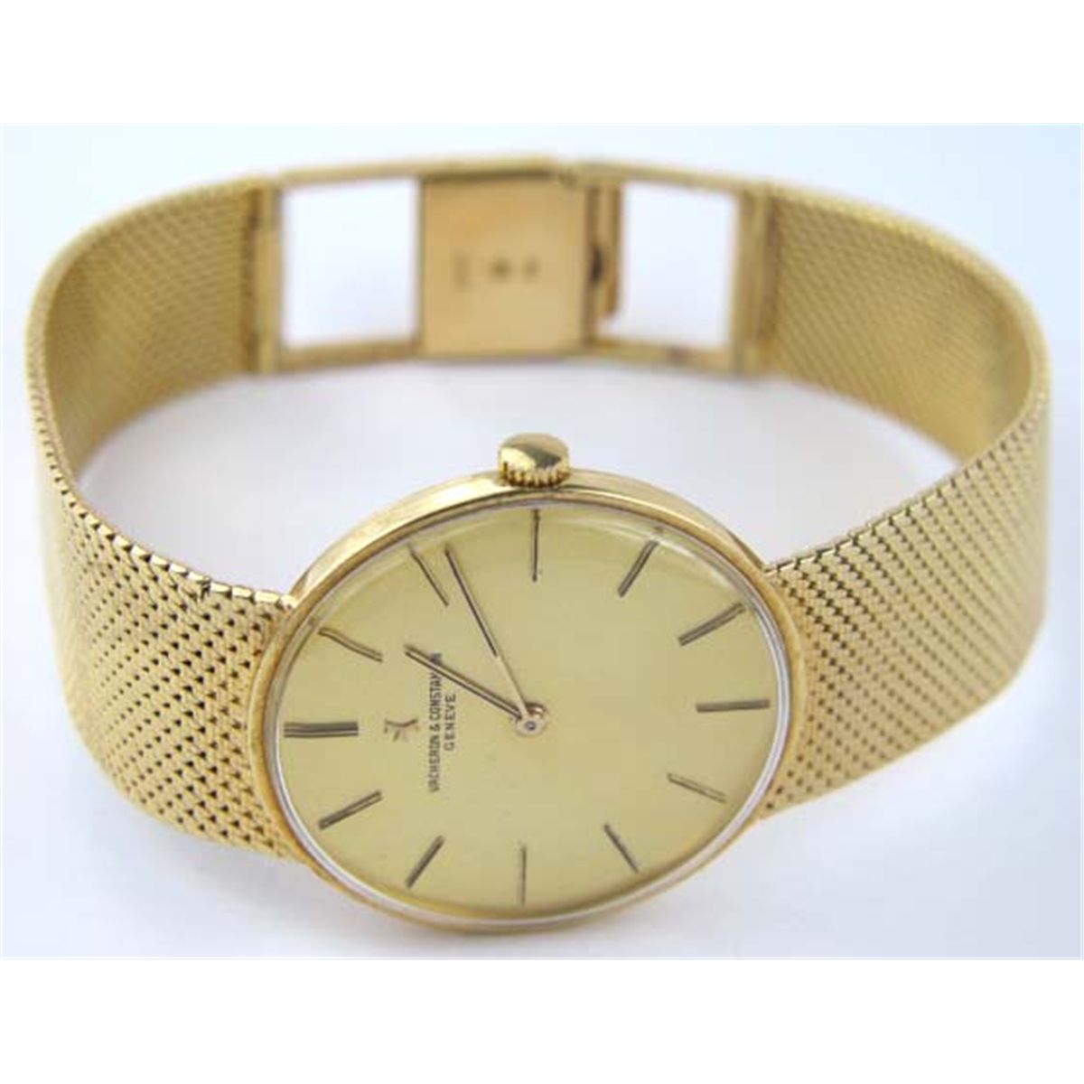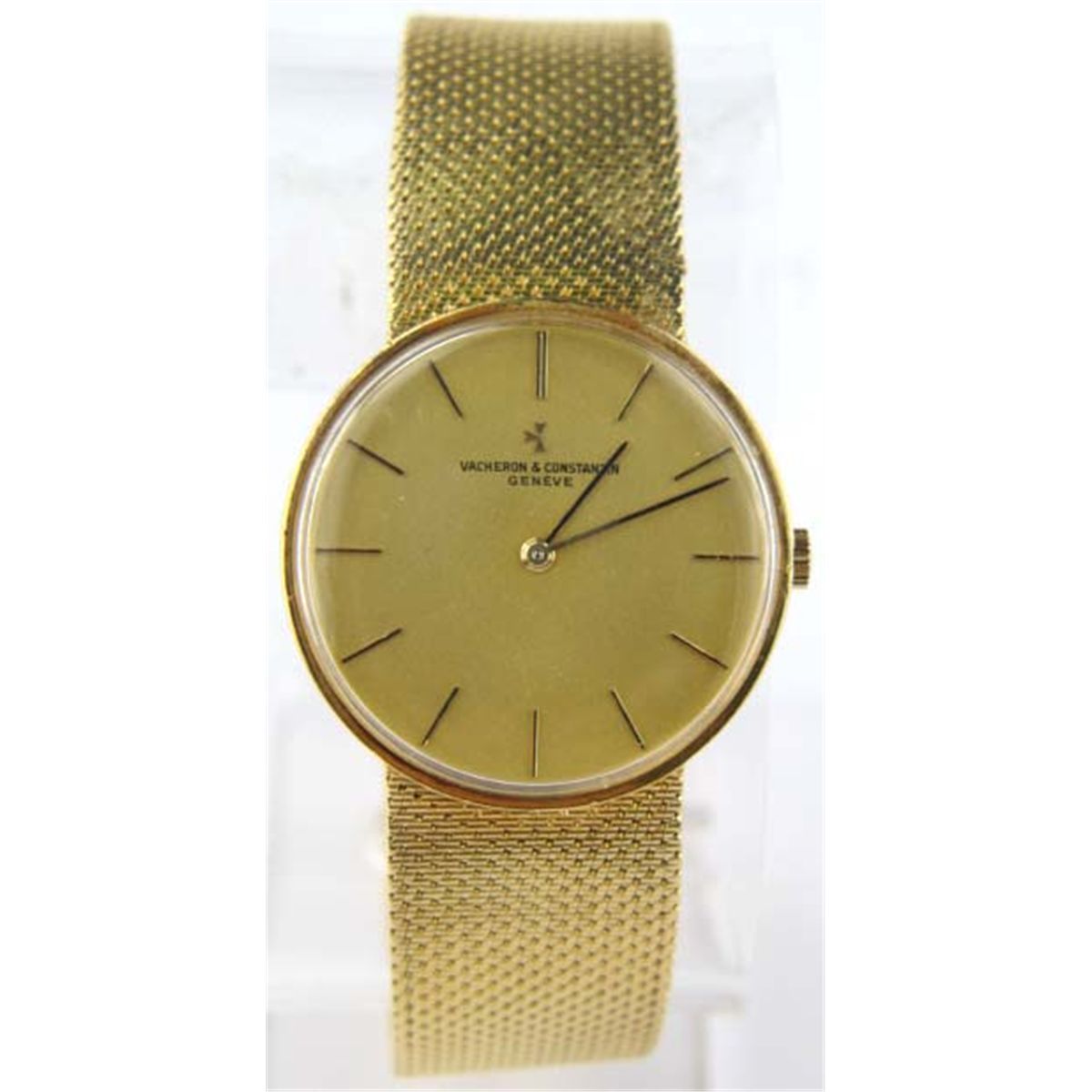 Vacheron & Constantin 18K Yellow Gold Watch.The total weight of the watch is 76.9 grams.The measurement of the watch head is 33 mm in diameter and 7 mm in thickness.Length of the watch is 8" long.The gold strap is 18 mm wide.Swiss Made.There are stamps "750" and "SWISS" on it.