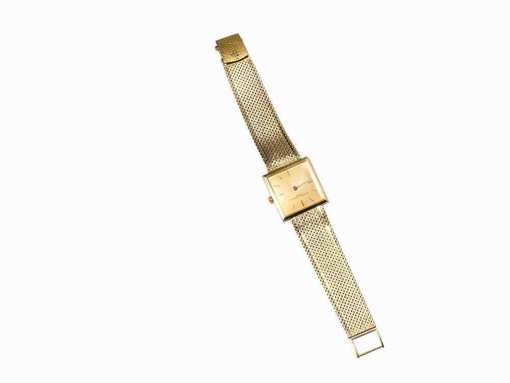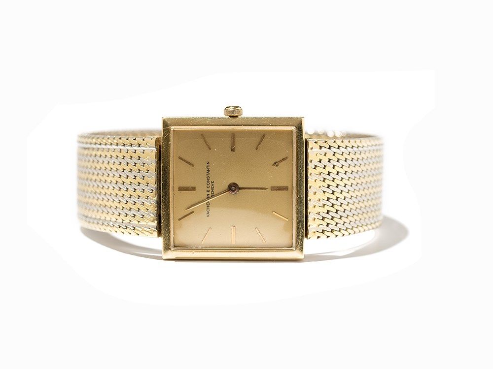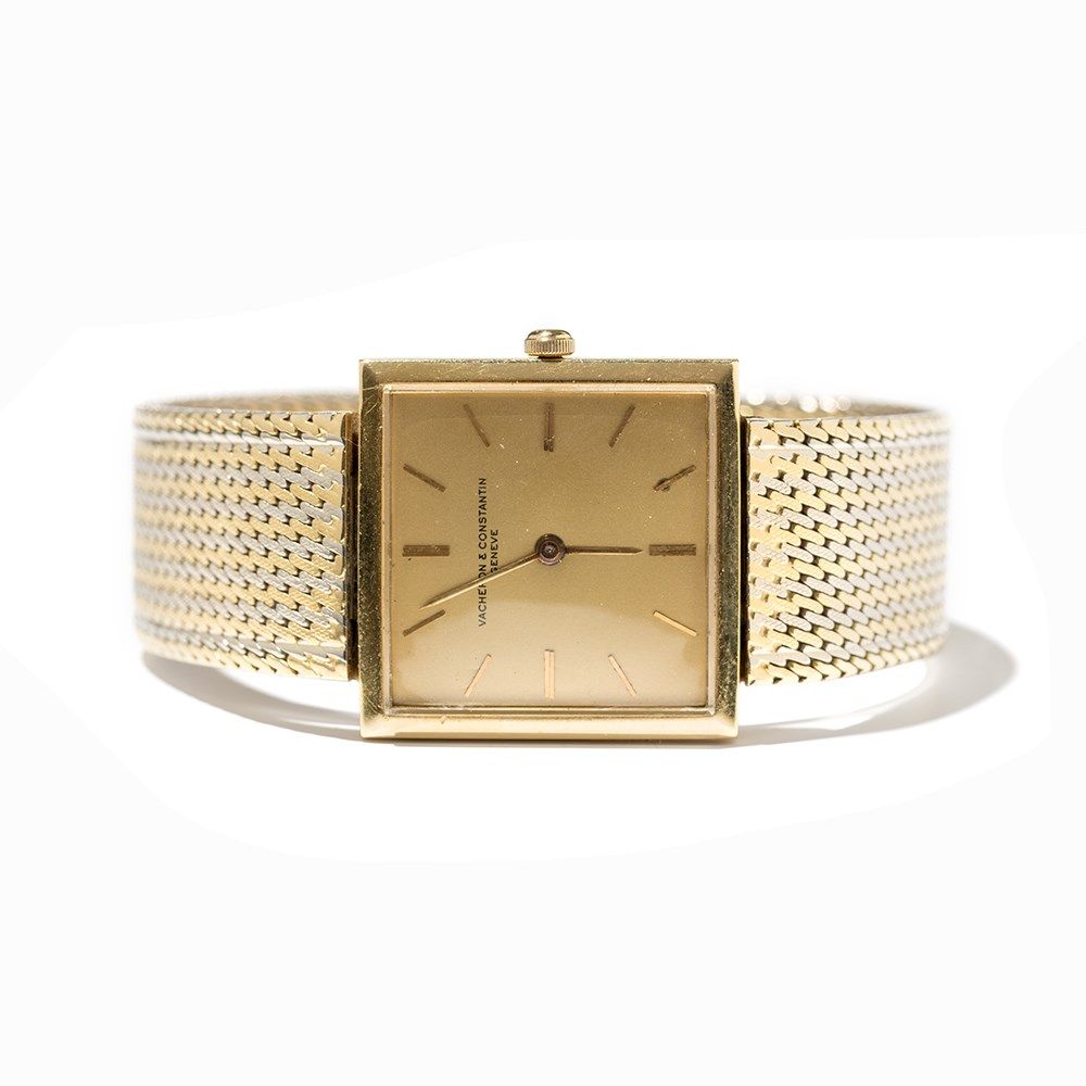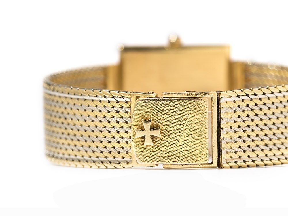 This Vacheron Constantin Square, ref. 6908, was made in Switzerland around 1960. The watch is fitted with a manual wind movement calibre 1003 with 17 jewels and displays hour and minute. The gold dial shows gold hands. Watch case and folding clasp are made of 18K gold. The milanese strap is made of 18K white gold and gold. The Watch case number is 403275. The movement number is 581840. Watch case and clasp are hallmarked.