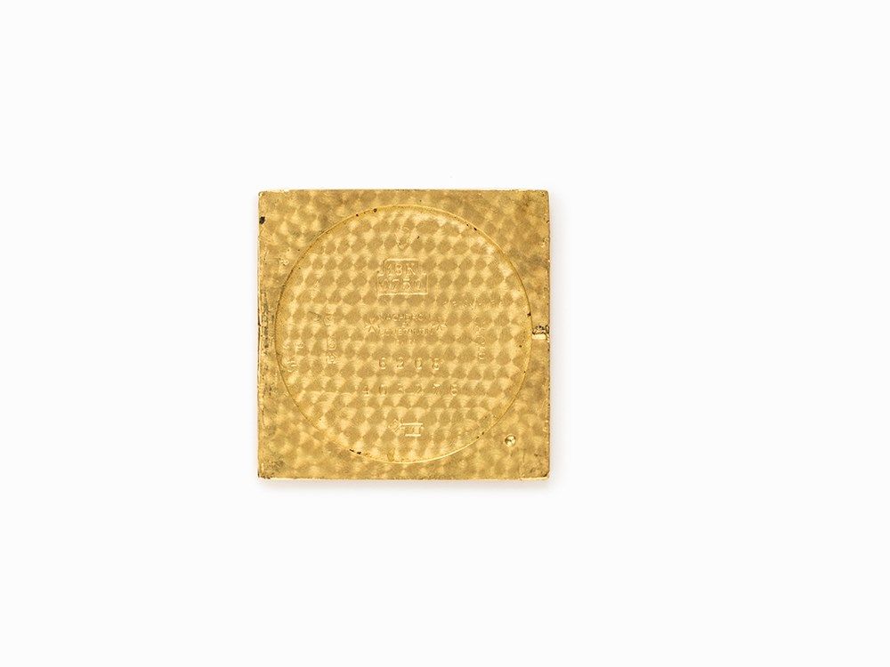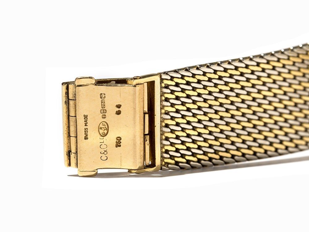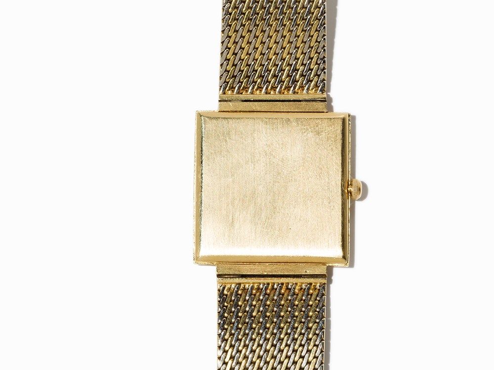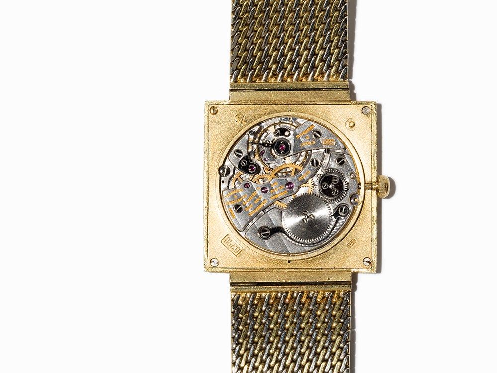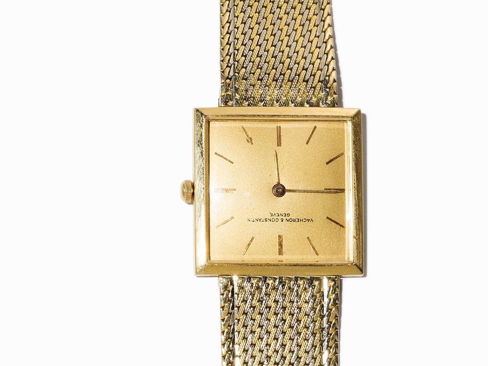 This Vacheron Constantin Square, ref. 6908, was made in Switzerland around 1960. The watch is fitted with a manual wind movement calibre 1003 with 17 jewels and displays hour and minute. The gold dial shows gold hands. Watch case and folding clasp are made of 18K gold. The milanese strap is made of 18K white gold and gold. The Watch case number is 403275. The movement number is 581840. Watch case and clasp are hallmarked.