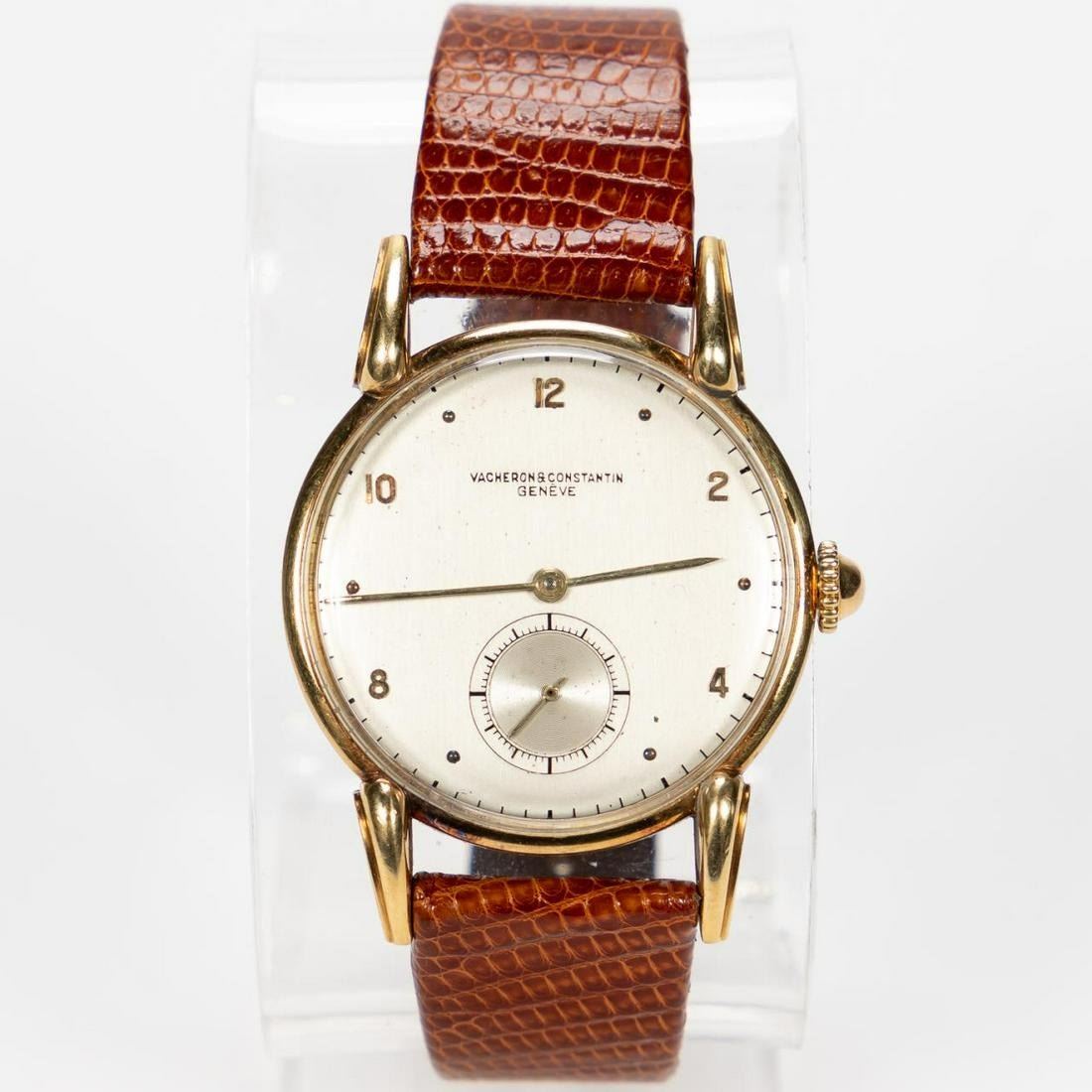 A patrimony manual 18k yellow gold and 17 jewel wrist watch with leather band featuring champagne dial. Makers mark on dial, serial number on movement and back interior of watch. Approx.diam. 32 mm (bezel), l. 9.25" (band). Approx. weight (including movement) 41.7g.