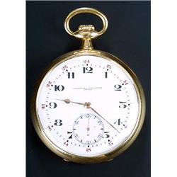 Vacheron and Constantin, an 18ct gold open face pocket watch, circa 1920, the white dial with black Arabic numerals outer 24 hour chapter, subsidiary seconds dial and gold spade hands, four piece case with an applied monogram, Vacheron-Constantin keyless 15 jewel bar movement with wolf tooth winding, split bimetallic balance and overcoil balance spring, case, dial and movement signed, together with a presentation case