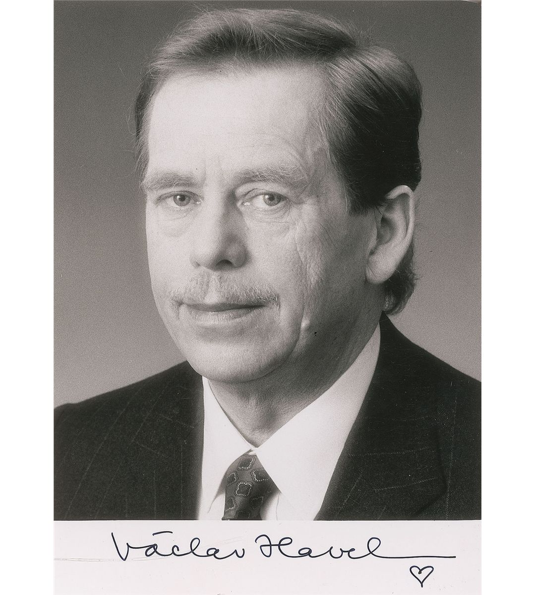 Czech writer, dissident, and politician (1936–2011) who served as the last president of Czechoslovakia and the first president of the Czech Republic. Glossy 5 x 7 head-and-shoulders photo, signed in the lower border in black felt tip, adding a small heart under his signature. In fine condition.
