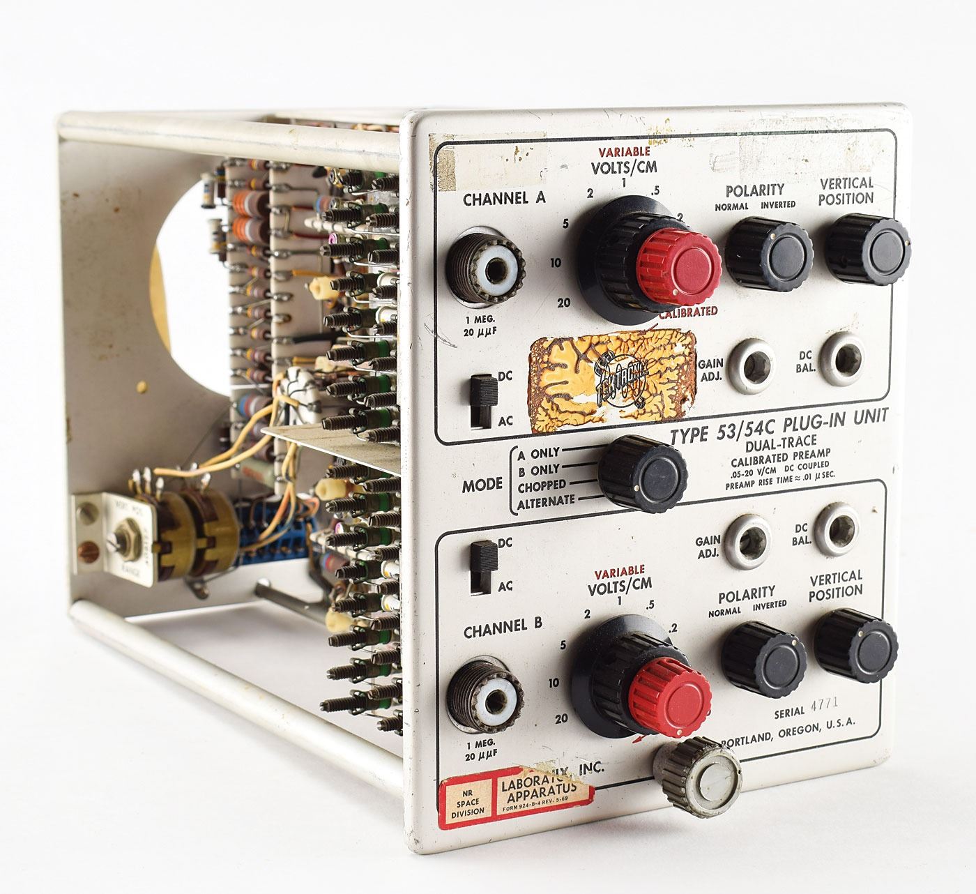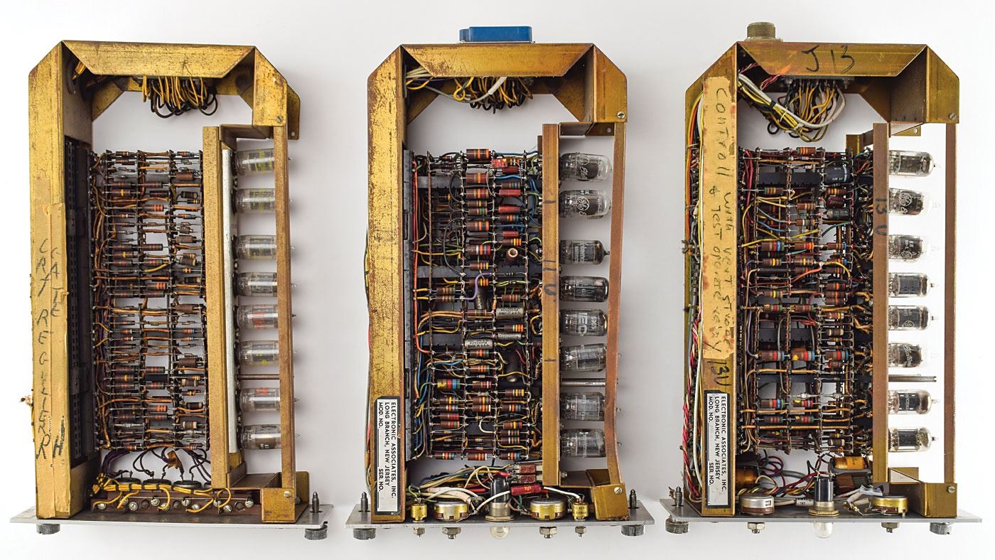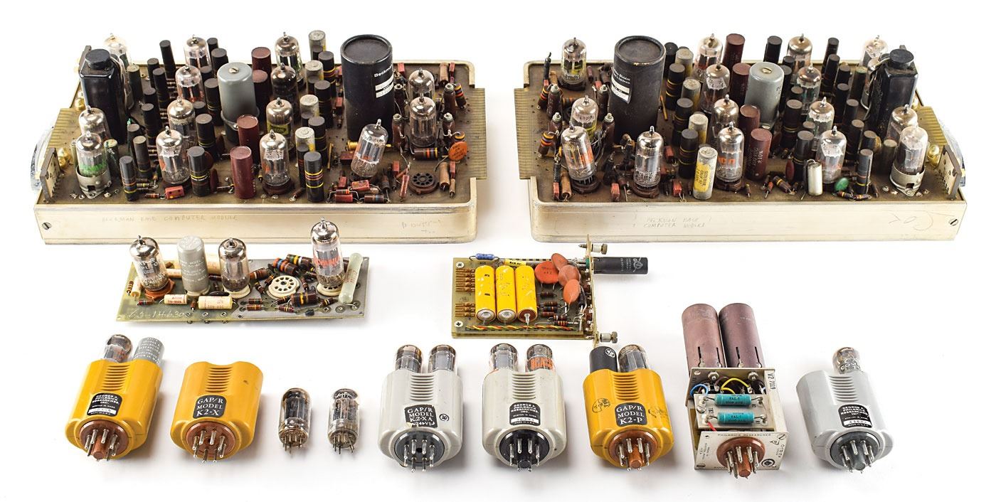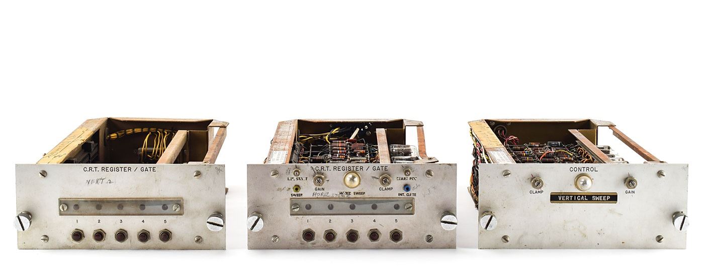 Collection of vintage vacuum tube devices, including: two "C.R.T. Register/Gate" units for analog computers with vacuum tube operational amplifier modules; a "Control / Vertical Sweep" unit for an analog computer with a vacuum tube operational amplifier module; six George A. Philbrick Researches K2 vacuum tube amplifiers; a USA-3 stabilized amplifier; a Type 53/54C Plug-In Unit Dual-Trace Calibrated Preamp; two large units with several vacuum tubes and Beckman op-amps; and an Engineered Electronics N-106 Transistor Decade unit. In overall very good to fine condition.
