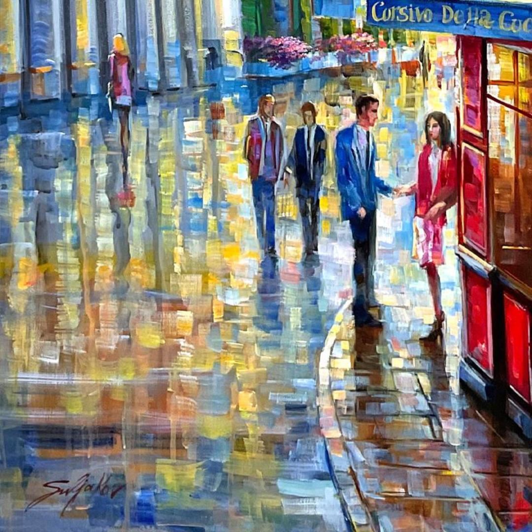 "Just Around the Corner" is an original oil painting on stretched canvas by Vadik Suljakov, hand signed by the artist. Includes Letter of Authenticity. Measures approx. 30" x 40" (image).