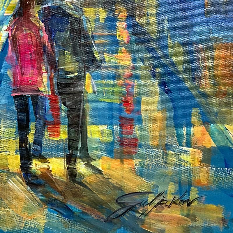 "Night Out" is an original oil painting on stretched canvas by Vadik Suljakov, hand signed by the artist. Includes Letter of Authenticity. Measures approx. 40" x 30" (image).