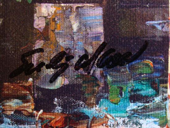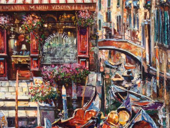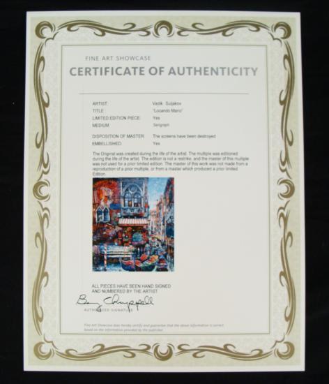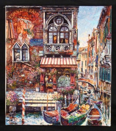 This is a limited edition serigraph on canvas by Vadik Suljakov. The artist uses an impressionistic style, in combination with a detailed realism. The scene portrays a canal in Italy. Artist: Vadik Suljakov Title: "Locando Mario" Signed: "Suljakov" by the artist in black marker on the front, lower left Medium: Serigraph print on canvas, with embellishments; stretched, unframed Edition: Numbered 145/195 in black marker on the verso Size: 14 x 17 inches Condition: Excellent Certificate of Authenticity: Included This piece will bring a little Italian flair to your art collection. BiographyVadik Suljakov (Russia, b. 1960) studied at the Moscow First Art School and served apprenticeships at the Moscow Graphic Art Committee and the Moscow Art Group. He left Russia in 1990, and spent a year in New York City working as a commercial artist. In 1991, Suljakov moved to California, where his work came to the attention of art dealer Mark Siegel. Suljakov works in oils and acrylics in a style best described as "Impressionistic." He specializes in picturesque urban landscapes from the world's great cities. His vibrantly textured and richly detailed style has attracted a large and faithful following of collectors, which will undoubtedly continue to grow.