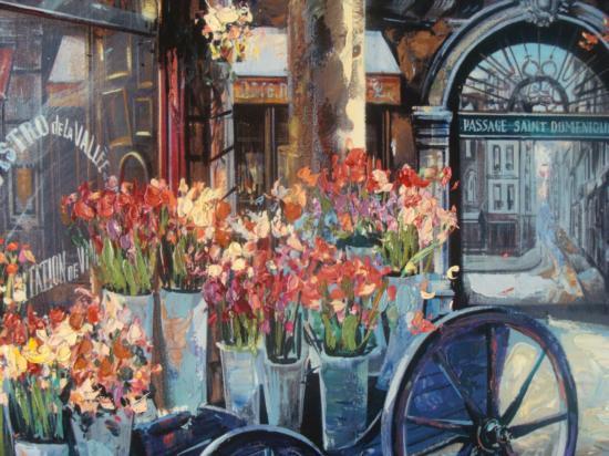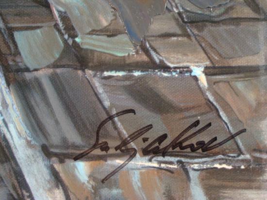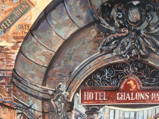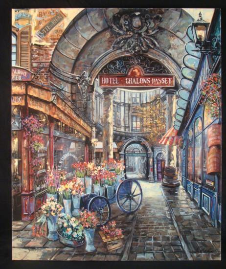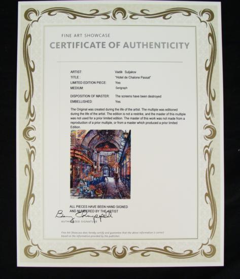 This is a limited edition serigraph on canvas by Vadik Suljakov. The subject here is an old French hotel in the Marais district of Paris, and it is nestled amongst the old stone pathways and lush flower carts. The artist uses his Impressionist brushstrokes to bring out the depth of age of the buildings, along with nice details such as the store signs. Artist: Vadik Suljakov Title: "Hotel de Chalons Passet" Signed: "Suljakov" by the artist in gold paint pen on the front, lower left Medium: Serigraph print on canvas, with embellishments; stretched, unframed Edition: Numbered 129/250 in black marker on the verso Size: 30 x 36 inches Condition: Excellent Certificate of Authenticity: Included This is rich and beautifully done Paris street scene, on a print signed by the highly respected artist himself. BiographyVadik Suljakov (Russia, b. 1960) studied at the Moscow First Art School and served apprenticeships at the Moscow Graphic Art Committee and the Moscow Art Group. He left Russia in 1990, and spent a year in New York City working as a commercial artist. In 1991, Suljakov moved to California, where his work came to the attention of art dealer Mark Siegel. Suljakov works in oils and acrylics in a style best described as "Impressionistic." He specializes in picturesque urban landscapes from the world's great cities. His vibrantly textured and richly detailed style has attracted a large and faithful following of collectors, which will undoubtedly continue to grow.