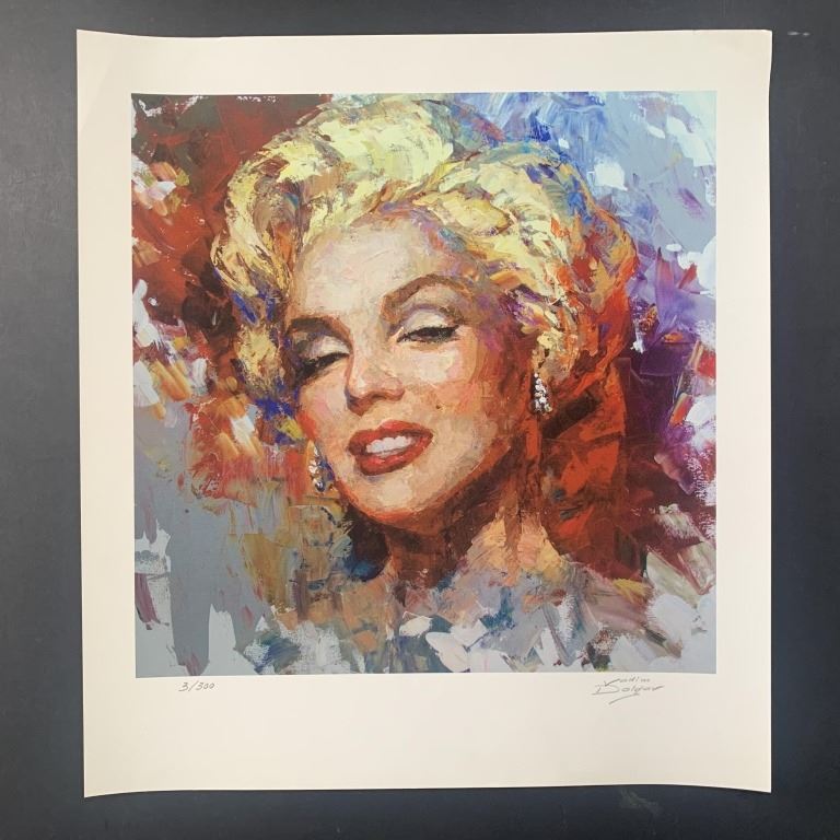 Vadim Dolgov's "Marilyn Monroe" limited edition print, signed lower right and numbered 3/300 lower left. This piece is a close up of Marilyn, in Dolgov's colourful, almost abstract type style. This piece is in great condition with creases at upper left and upper right.