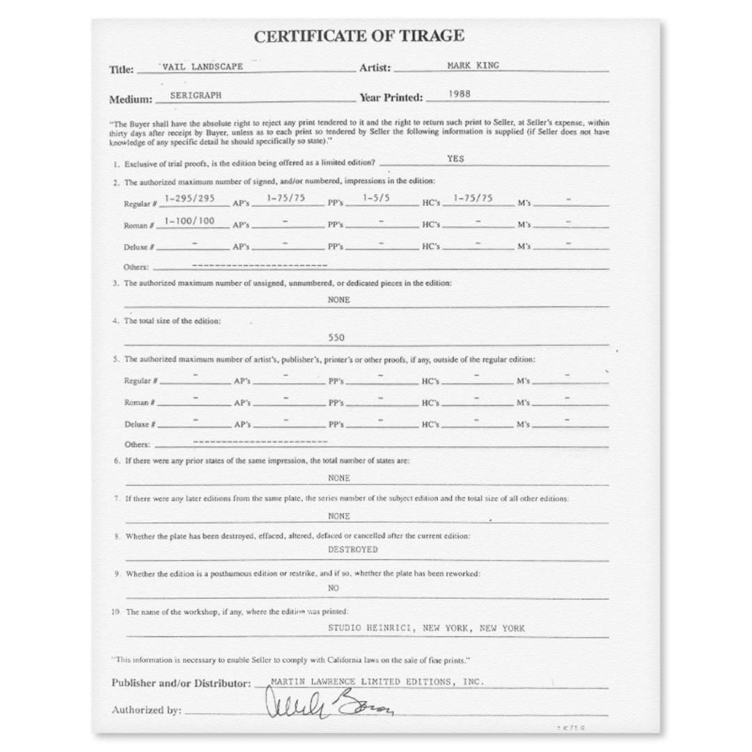 "Vail Landscape" is a limited edition serigraph on paper by Mark King (1931-2014). Hand signed and numbered, this piece comes with a letter of authenticity and measures approximately 30" x 40" (image).